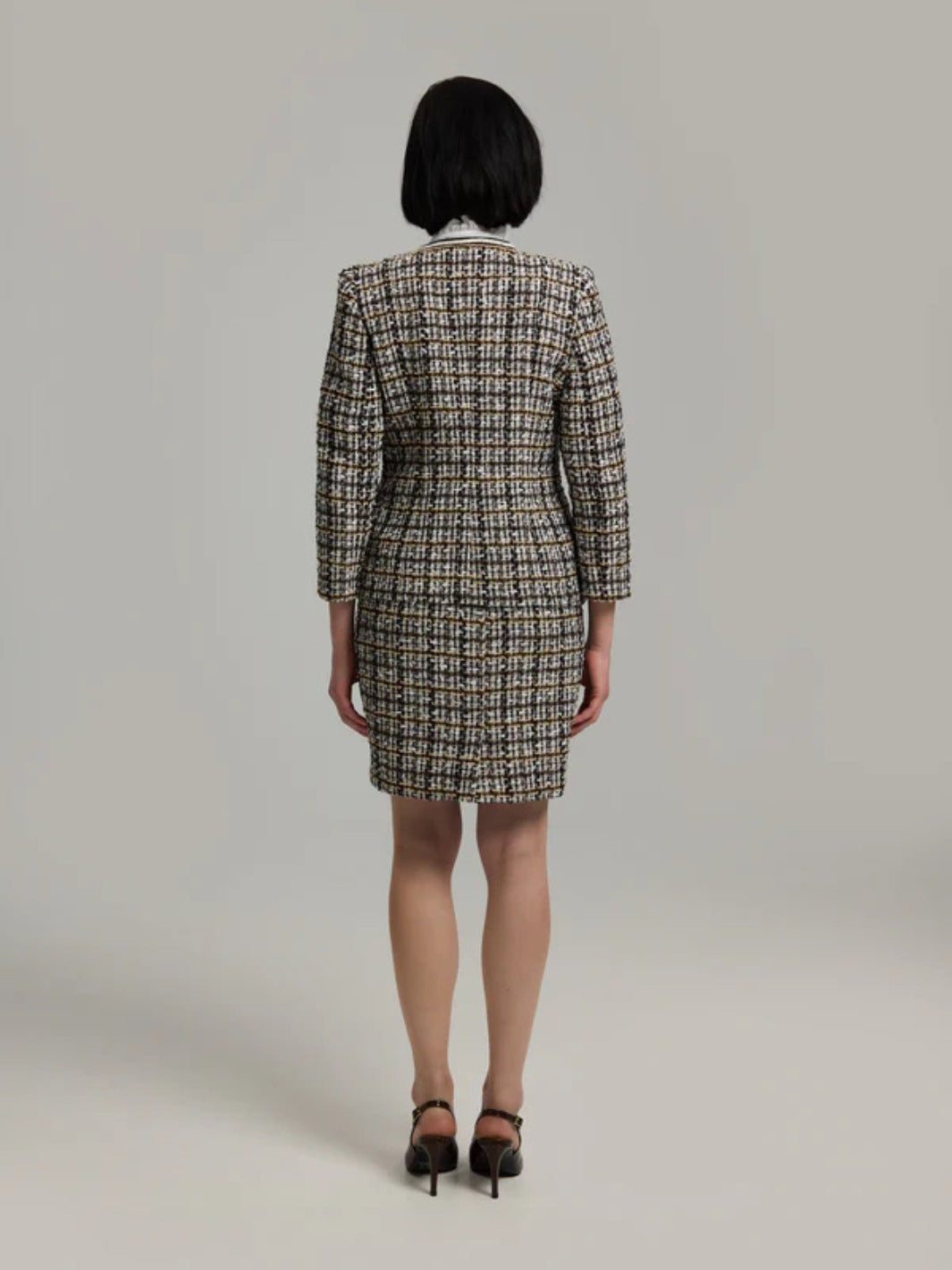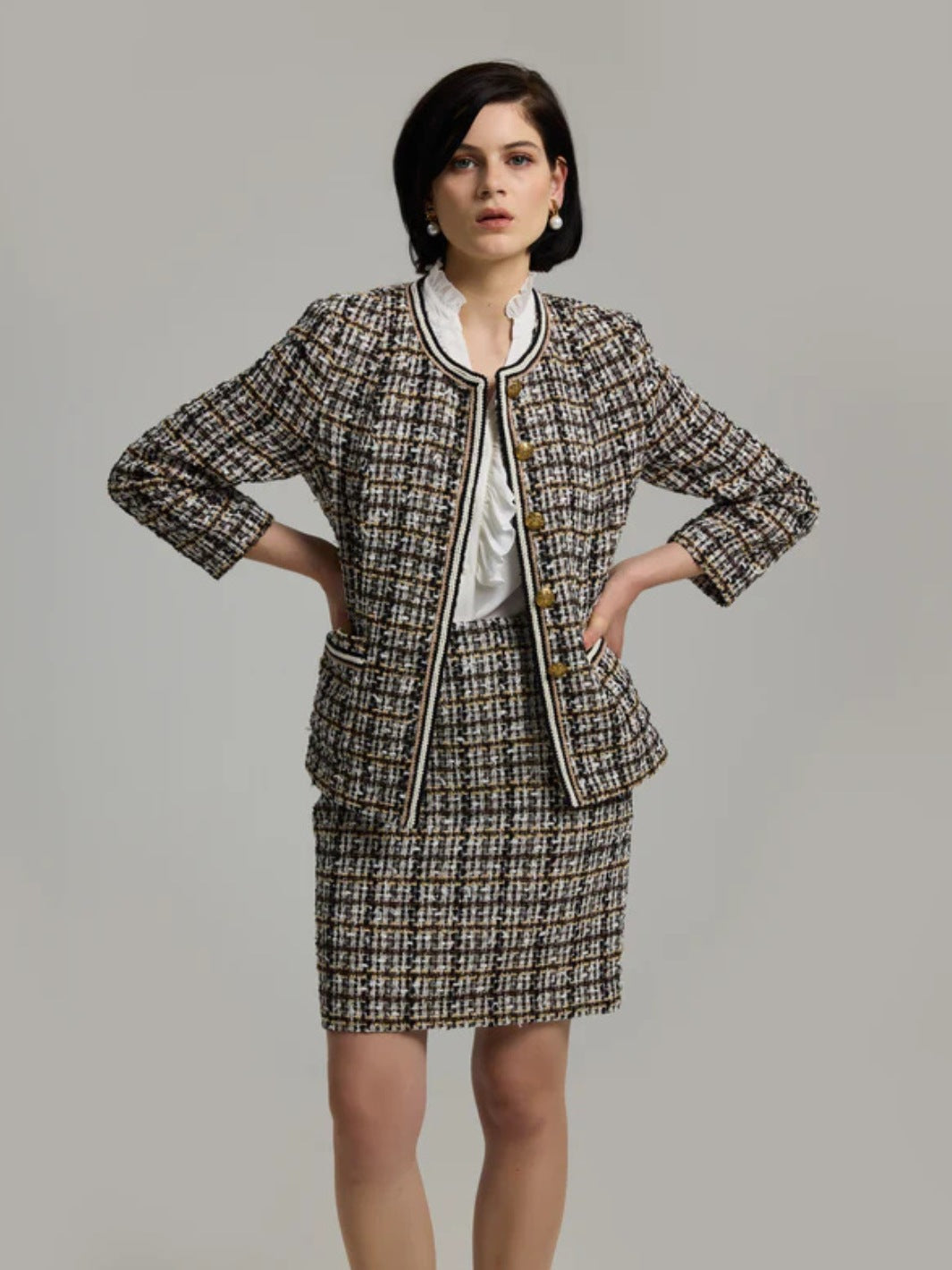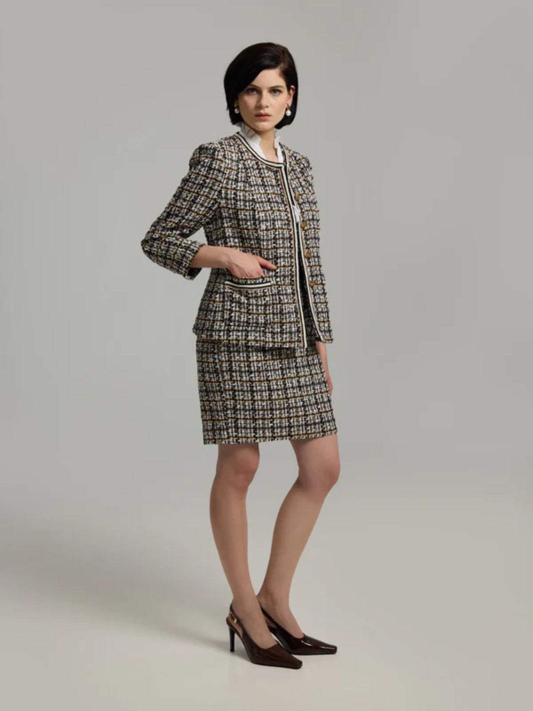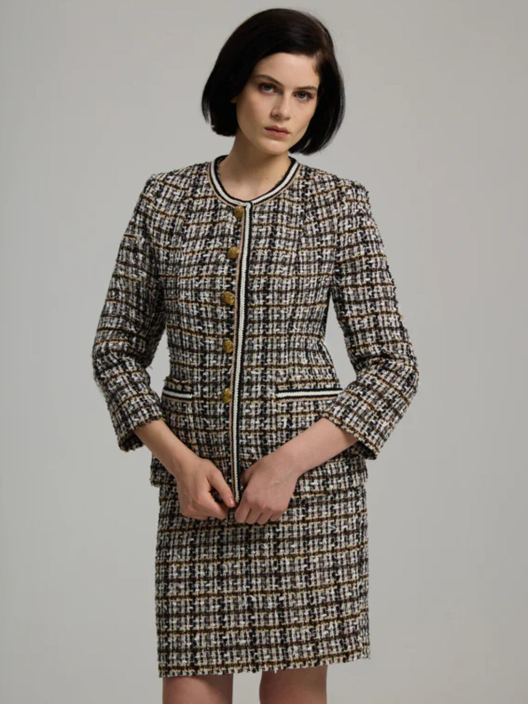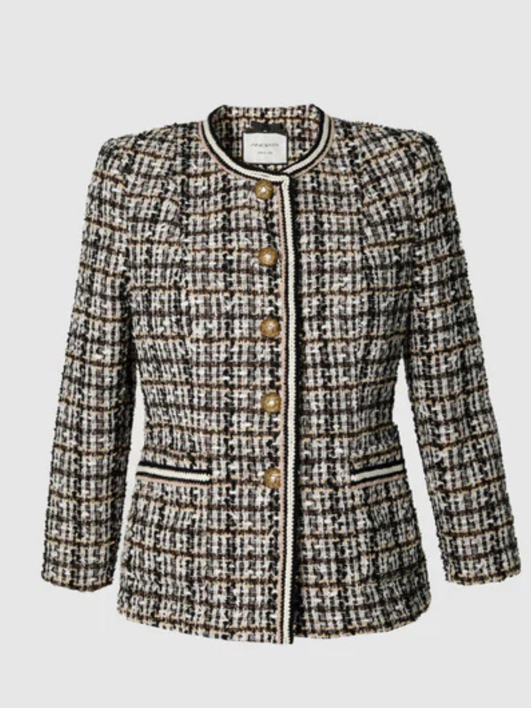 Gisele Blazer fra Andiata. En lekker brun boucléjakke, detaljert med gullknapper og lommer foran. Kombiner gjerne med Vivian 50 Skirt for et komplett sett.