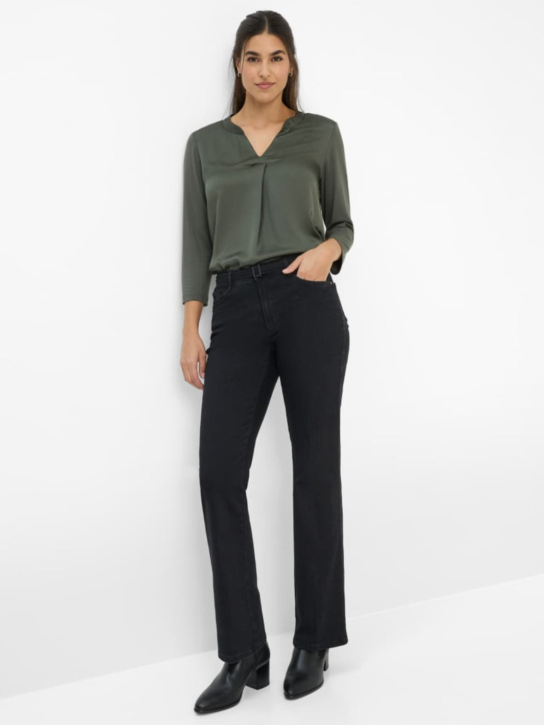 Mary Jeans fra Brax. En jeans med høy midje og rett passform, laget i et materiale med god stretch. Buksen har justerbart belte i midjen for optimal passform.