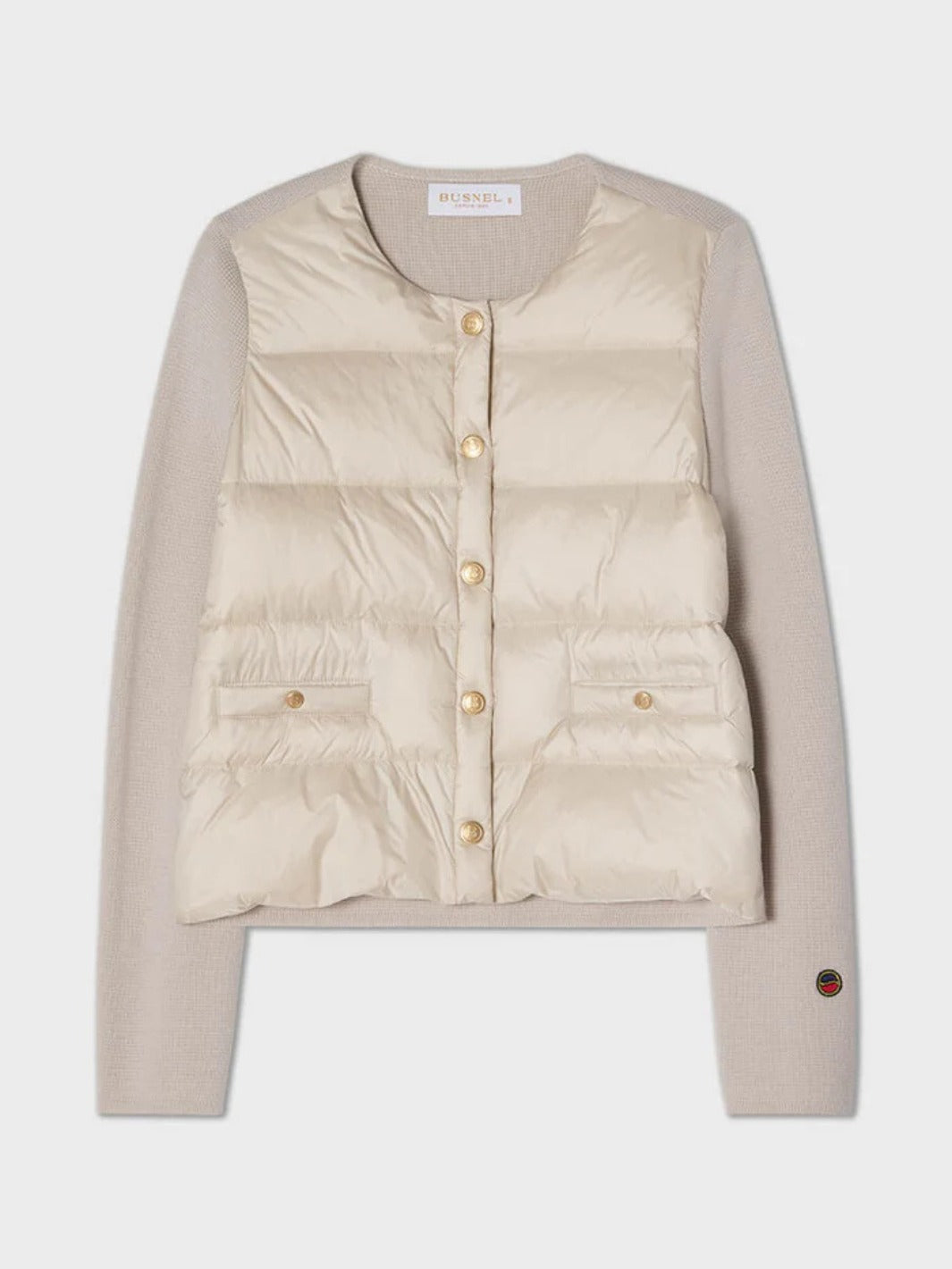 Iva Down Jacket fra Busnel. En lys beige jakke som er polstret i fronten, samt detaljert med gyldne B-knapper og to lommer. Ermene er i kontrast strikket i ull.