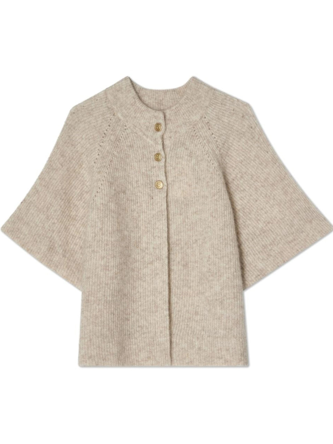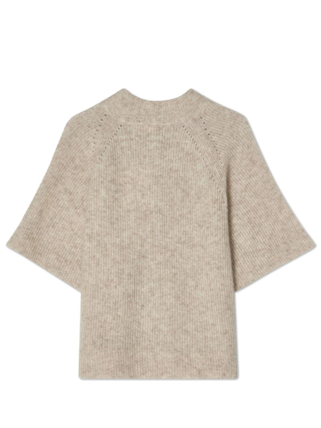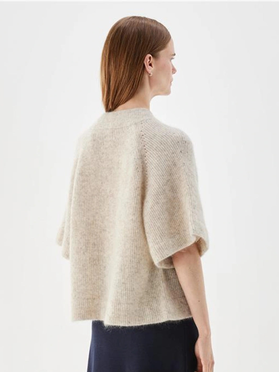 Vilanie Cardigan fra Busnel. En sandfarget cardigan, strikket i en blanding av mohair og ull. Cardigan har rund hals og noe kortere ermer, noe som skaper en vakker silhuett det er lett å style på ulike måter.