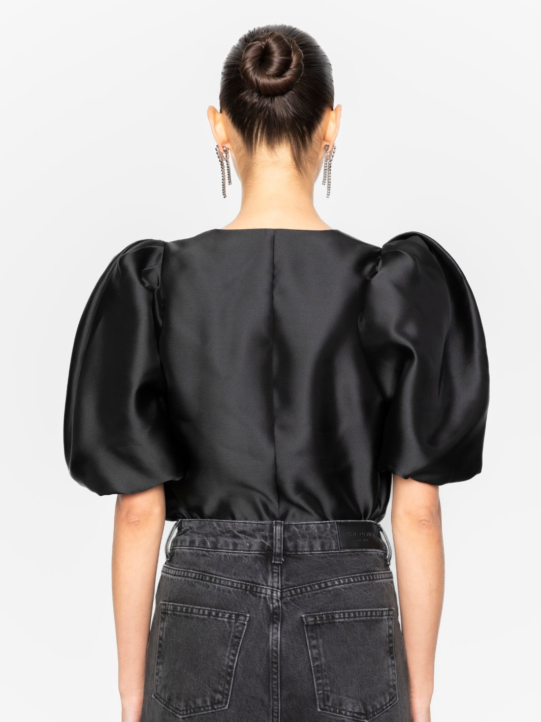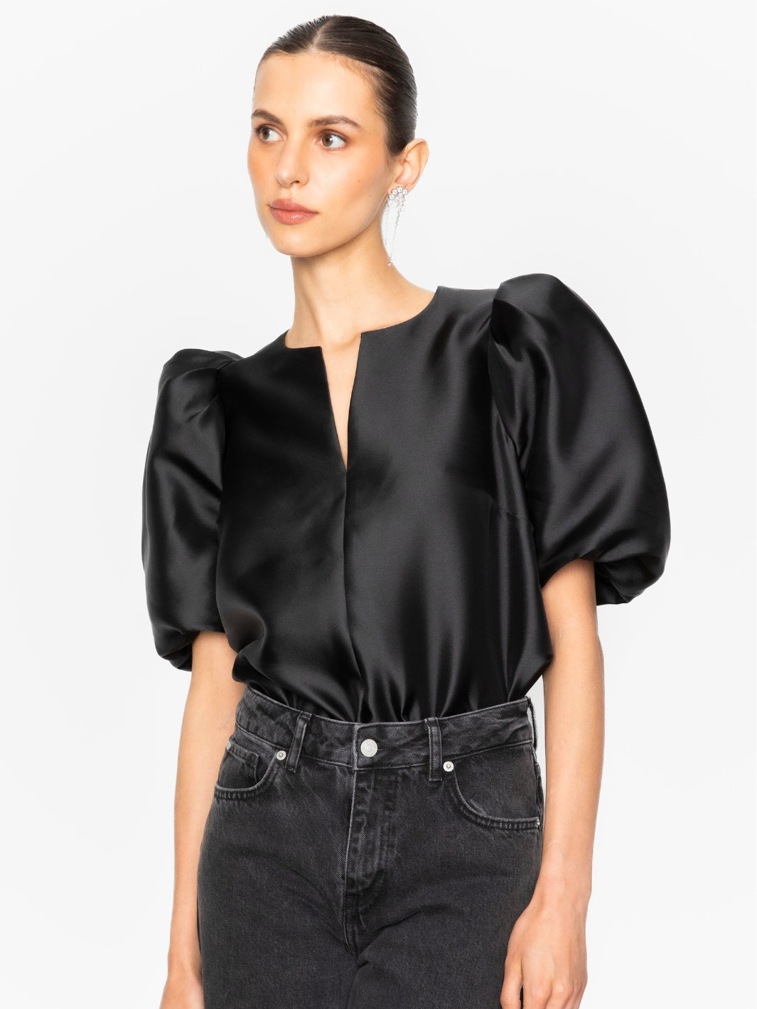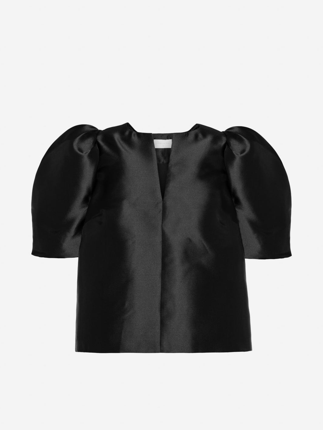 Maeve Blouse fra Camilla Pihl. En sort topp, detaljert med en skarp v-hals og luftige korte ermer.