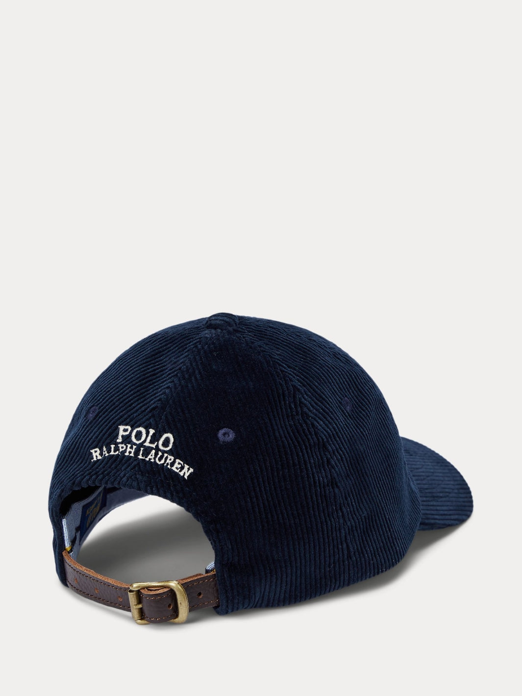 Corduroy Ball Cap fra Polo Ralph Lauren. En marineblå caps i kordfløyel med den tradisjonelle signaturlogoen i front. Capsen har justerbar stropp i lær.