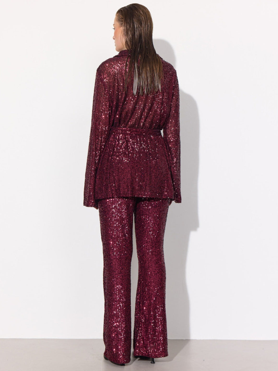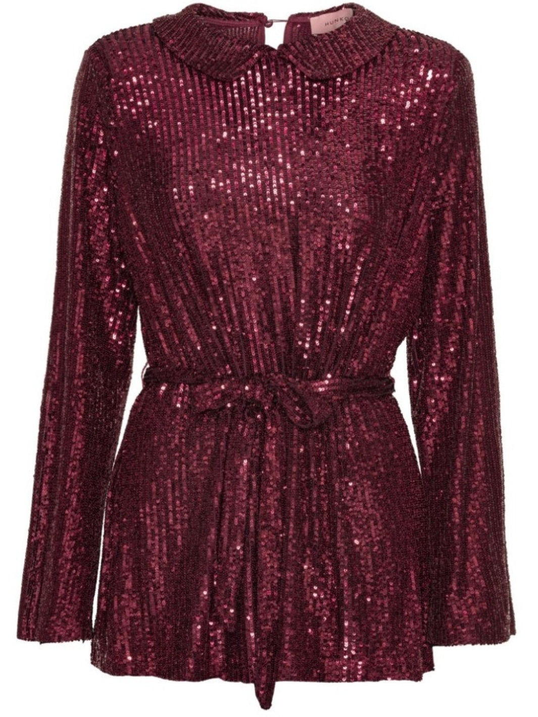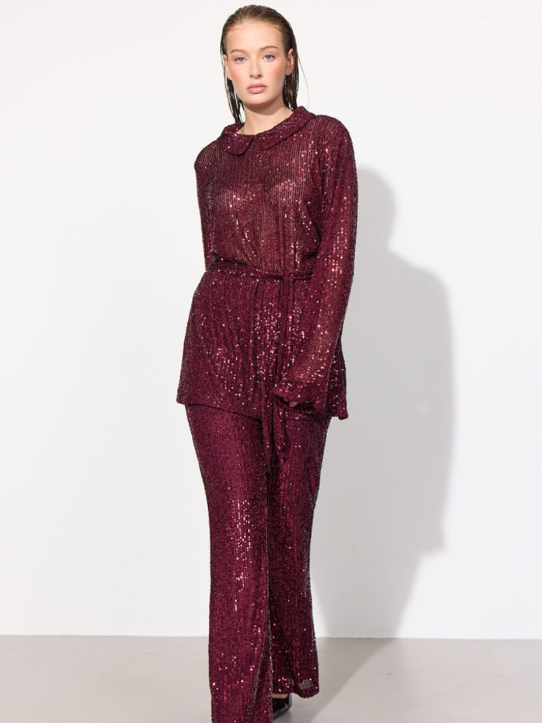 Karin Sequin Blouse fra Hunkøn. En lang paljettbluse med rett passform og lange ermer. Blusen har knytebånd i midjen og knappelukking i nakken. Kombiner med Karin Sequin Trouser fra samme merke for et komplett sett.