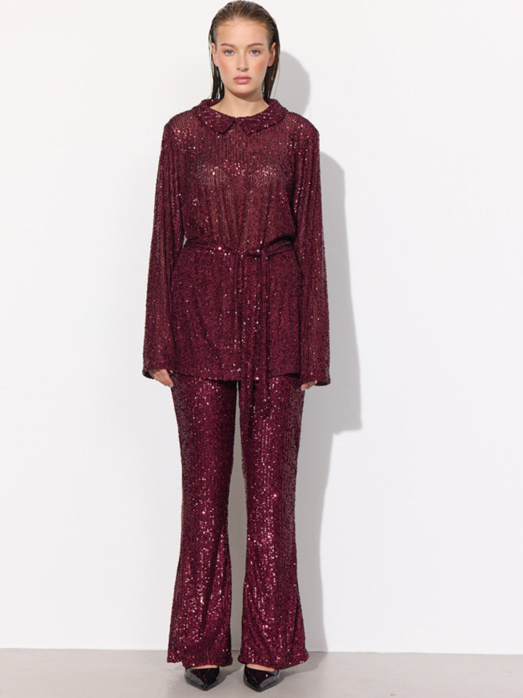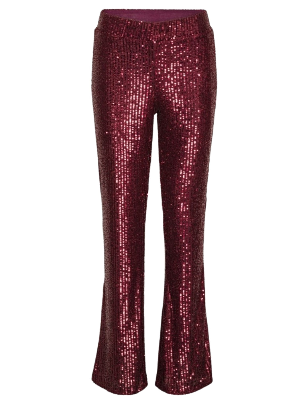 Karin Sequin Trouser fra Hunkøn. Paljettbukser med en smal silhuett og elastisk linning, her i dyp rød. Buksene er fôret. Kombiner med Karin Sequin Blouse fra samme merke for et komplett sett.