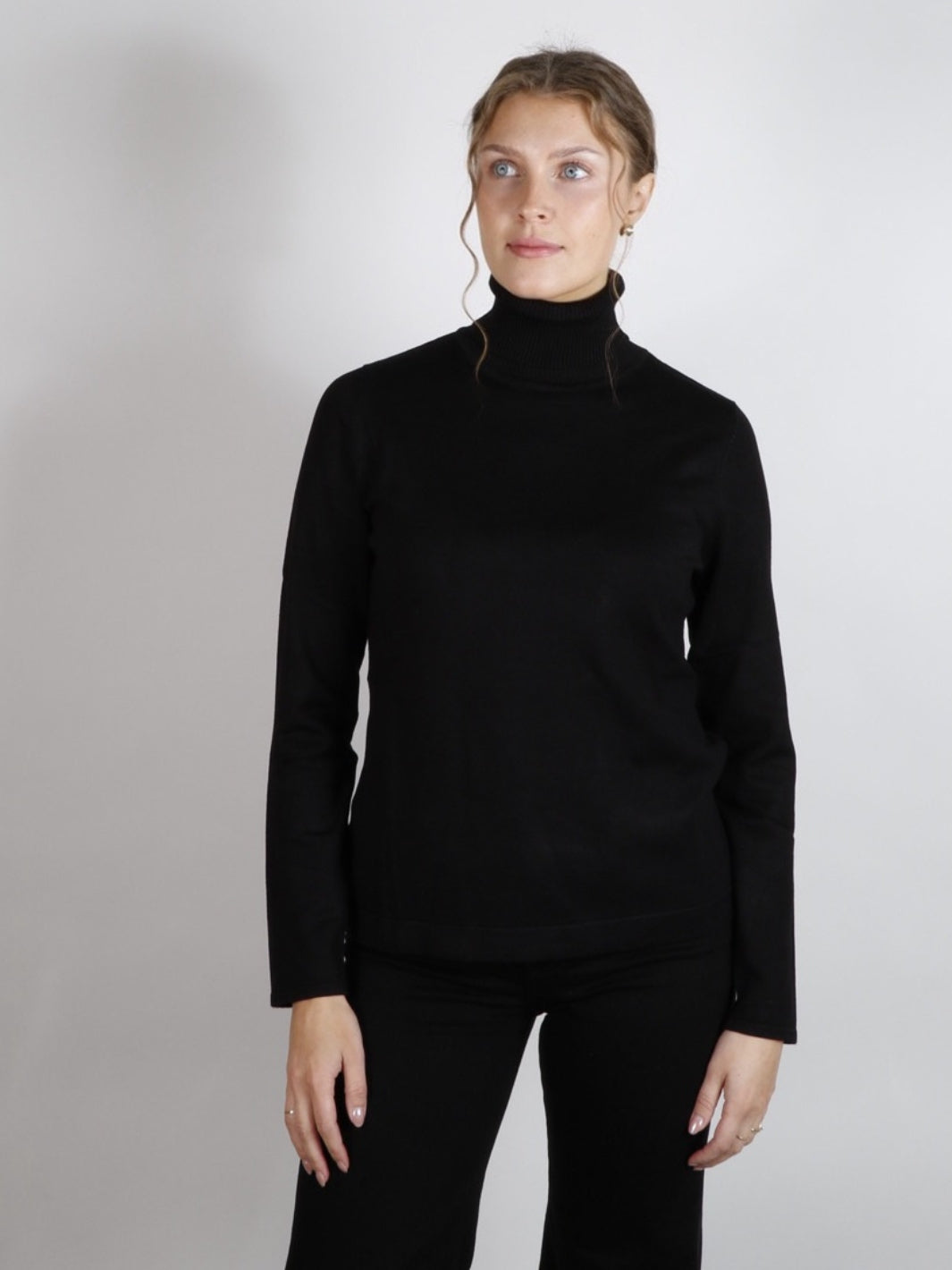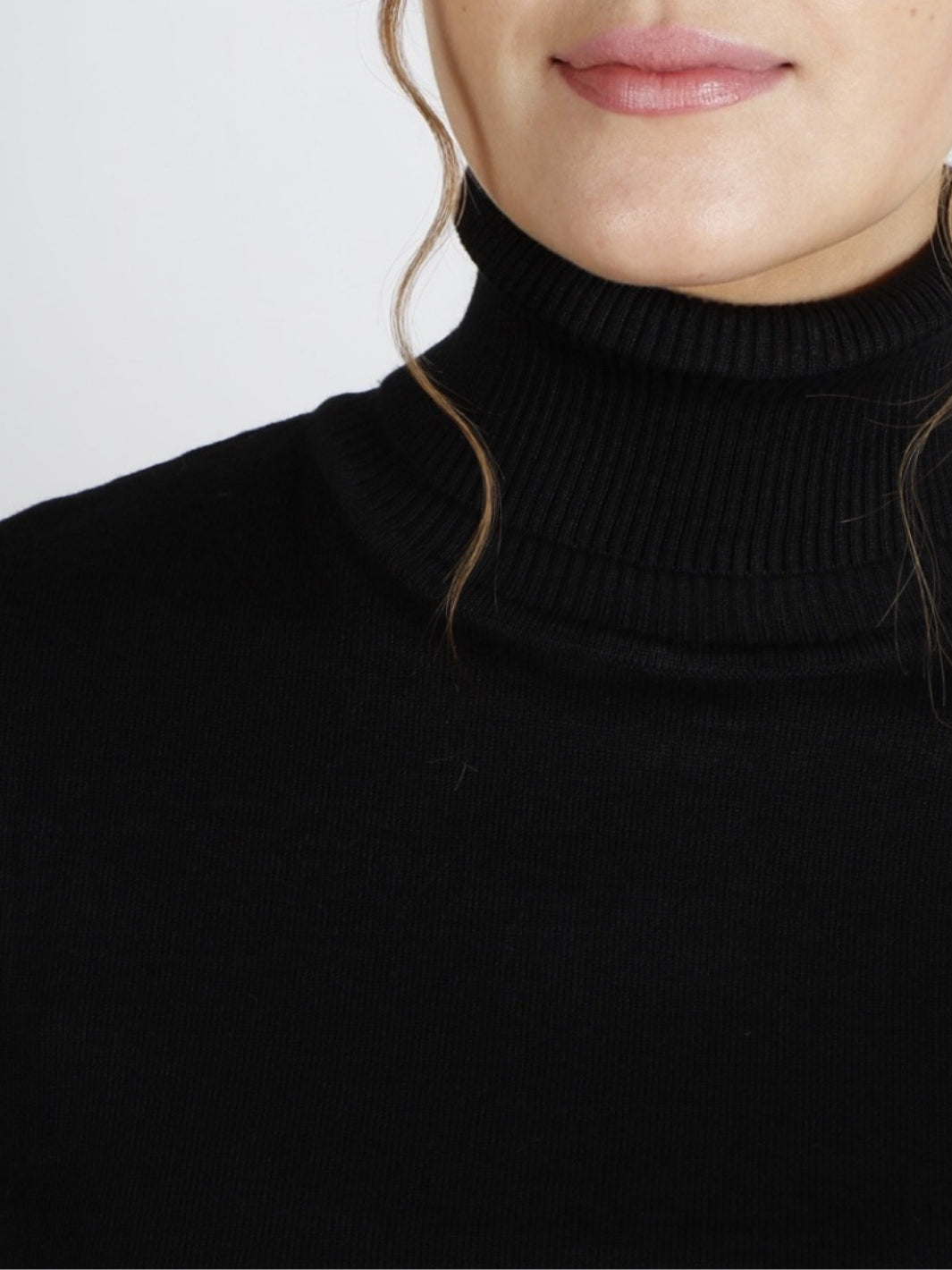 Dina Polo fra Alma. Strikket høyhalset genser, her i sort. Genseren har ribbestrikkede detaljer.