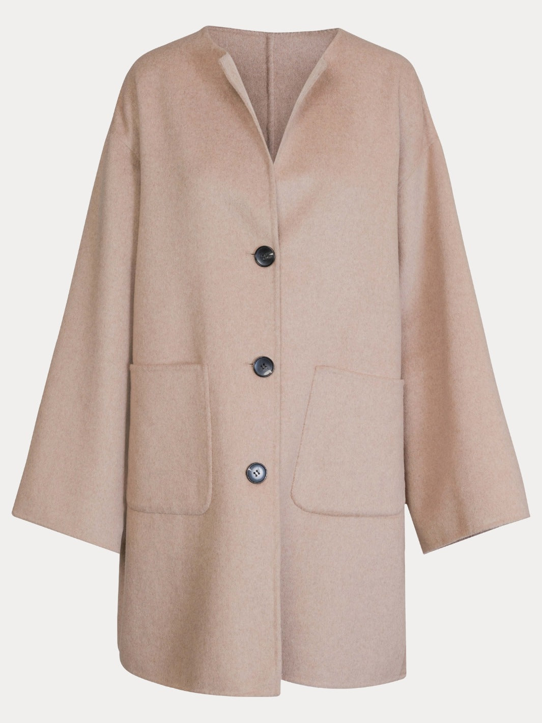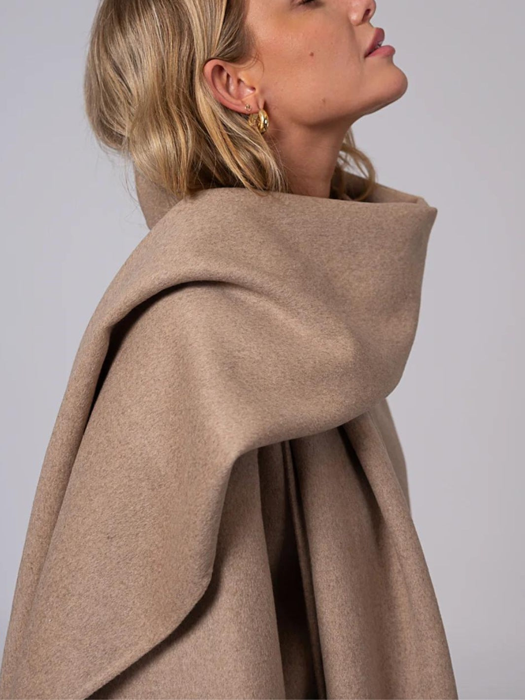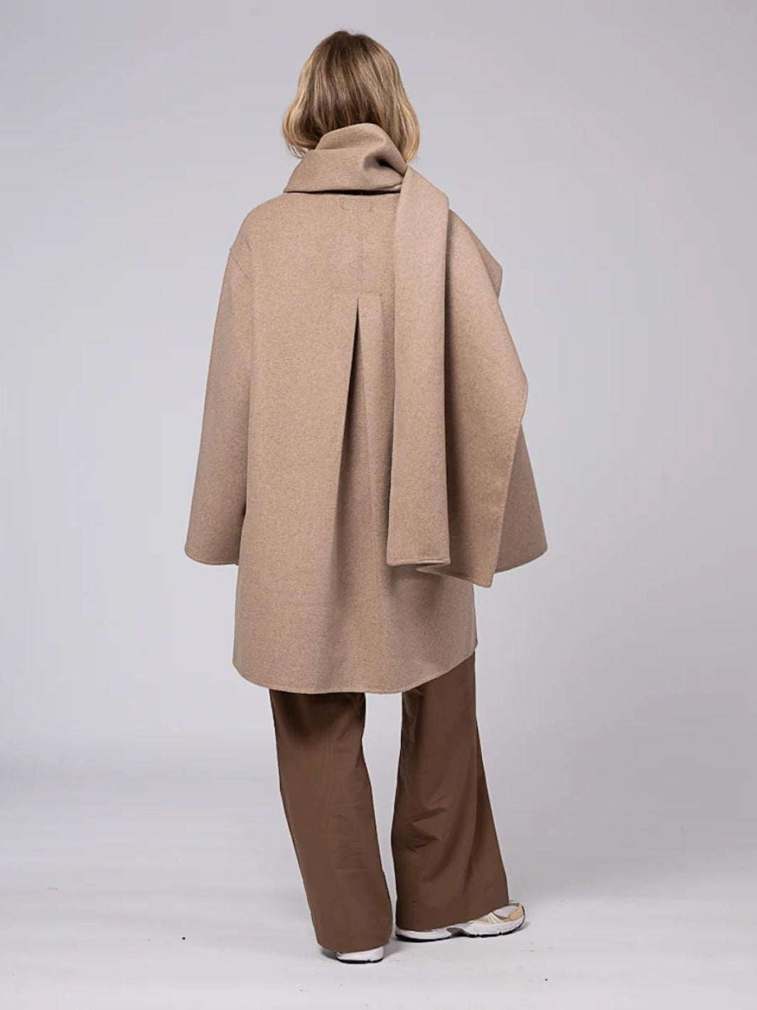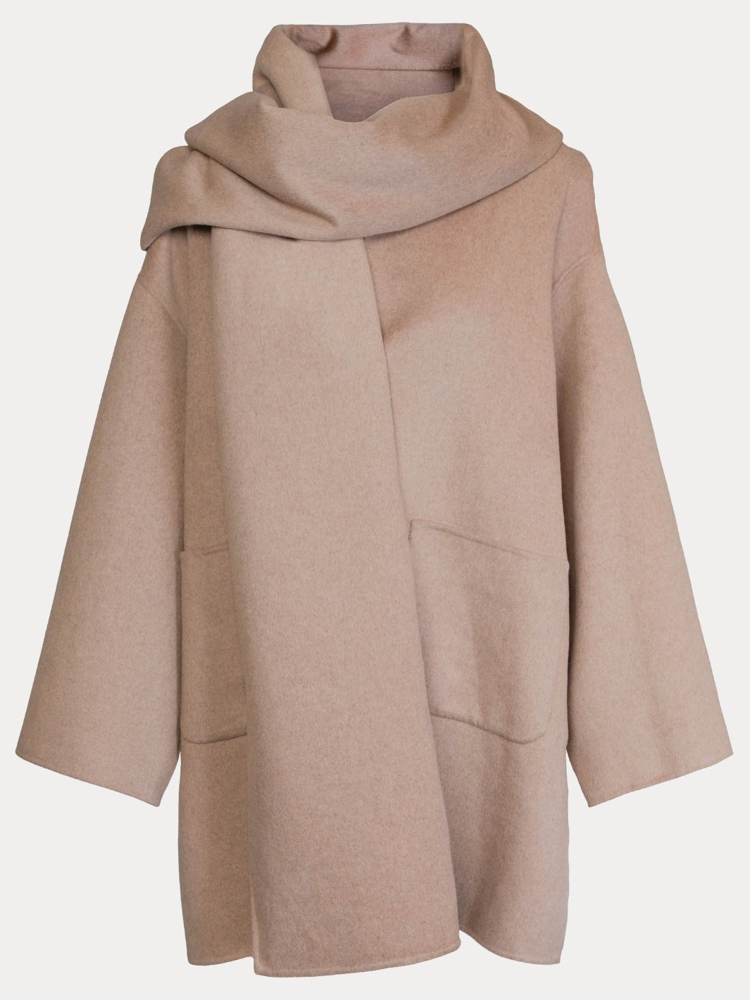 Sandy Wool Jacket fra Clemonte. Beige kåpe med en oversized passform, laget i en myk ullblanding. Kåpen er detaljert med vide ermer, sidelommer, knapper i front og et avtakbart skjerf.