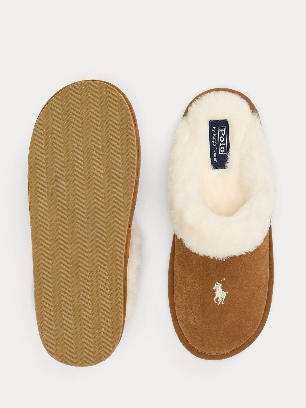 Pony Suede & Faux-Fur Slipper fra Polo Ralph Lauren. Myke tøfler i semsket skinn med fôr i imitert pels. Tøflene har polstret innersåle, mønstret yttersåle og er dekorert med Polo-signatur.