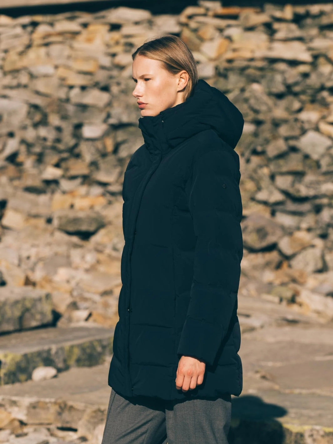 Noon ll Apex Jacket fra Scandinavian Edition. En marineblå elegant dunjakke med smal silhuett. Ved behov har jakken reflekterende taper på begge sider som kan trekkes ned. Jakken er laget i et vind- og vannavvisende yttermateriale, med 4-veis stretch for økt komfort.