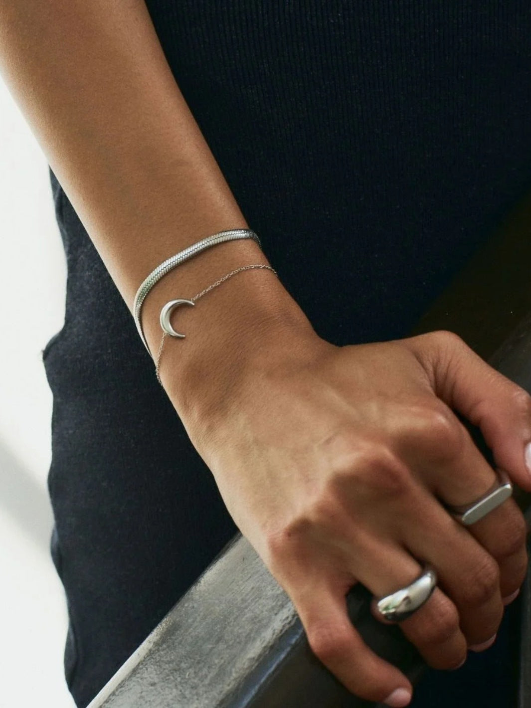 Herringbone Bracelet fra Edblad. Et sølvfarget elegant armbånd med et flatt fiskebensmønster.