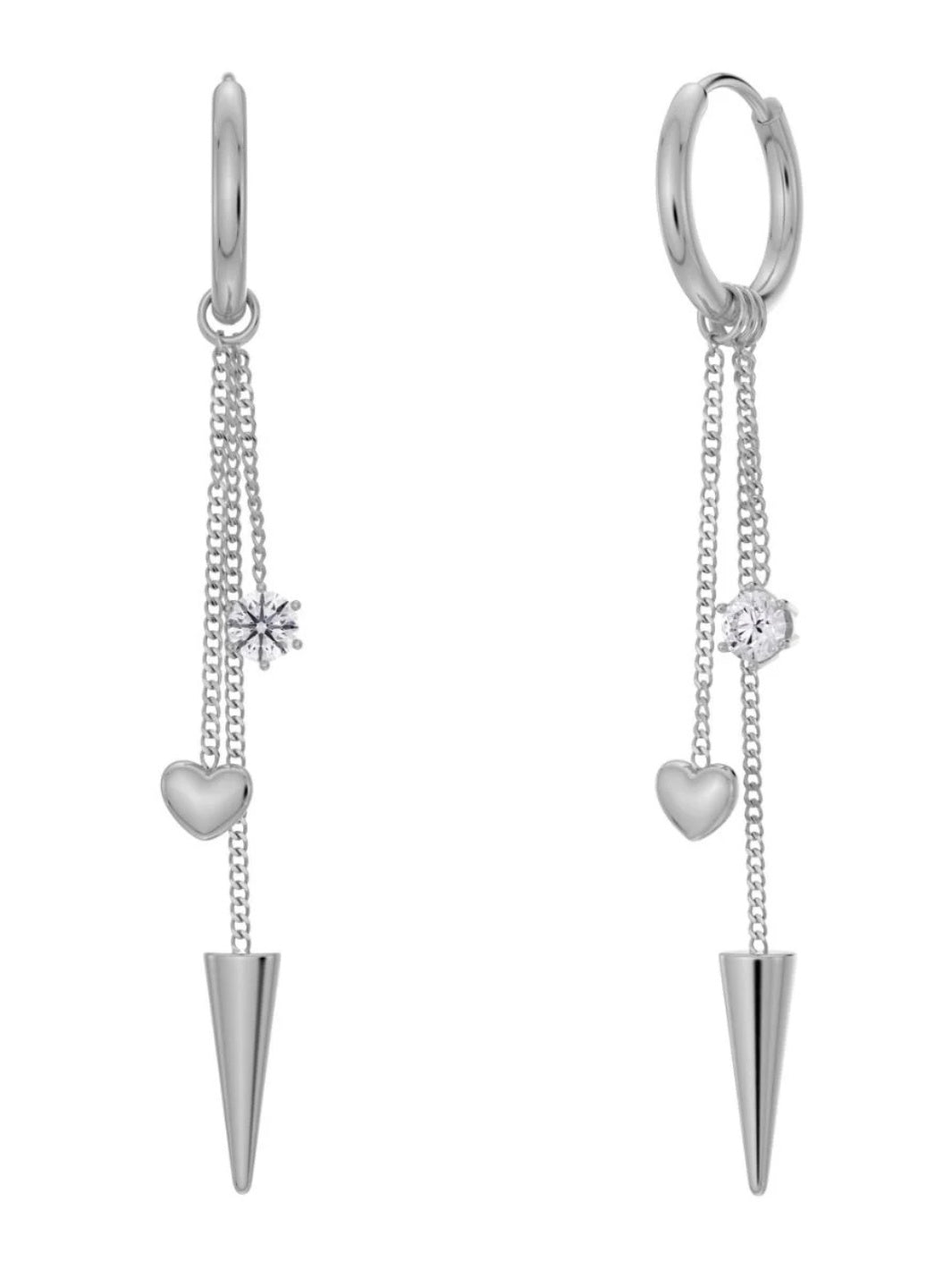 Peak Hoops Multi Heart fra Edblad. Sølvfargede hoops med tre lekre anheng i ulike størrelser: et hjerte, en glitrende stein og en nagel.