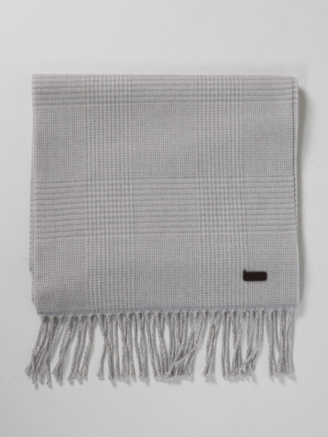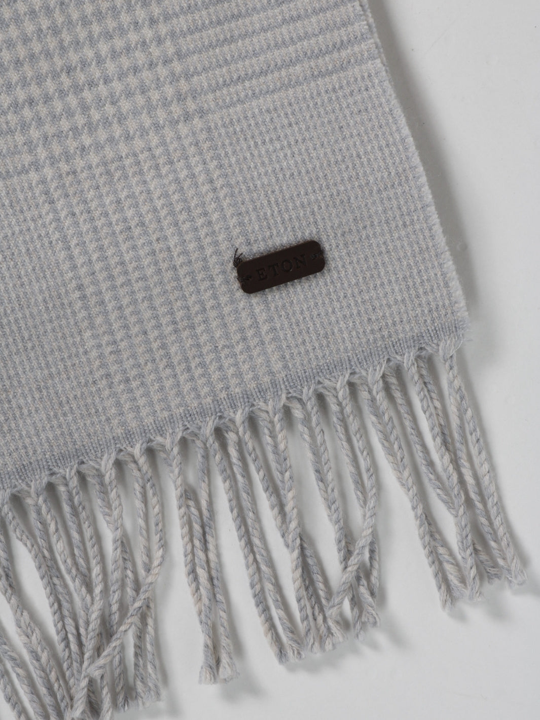 Pow Check Merino Scarf fra Eton. Et grått ullskjerf, detaljert med ruter og frynser.
