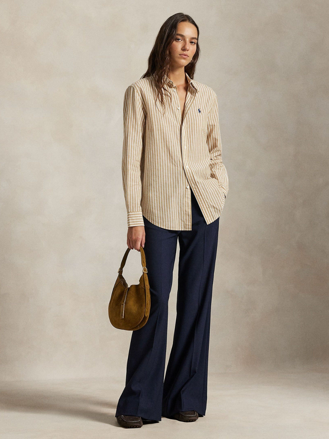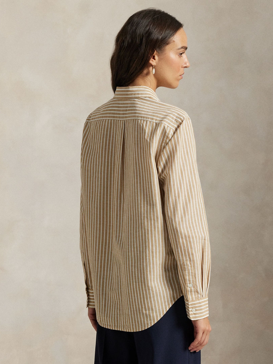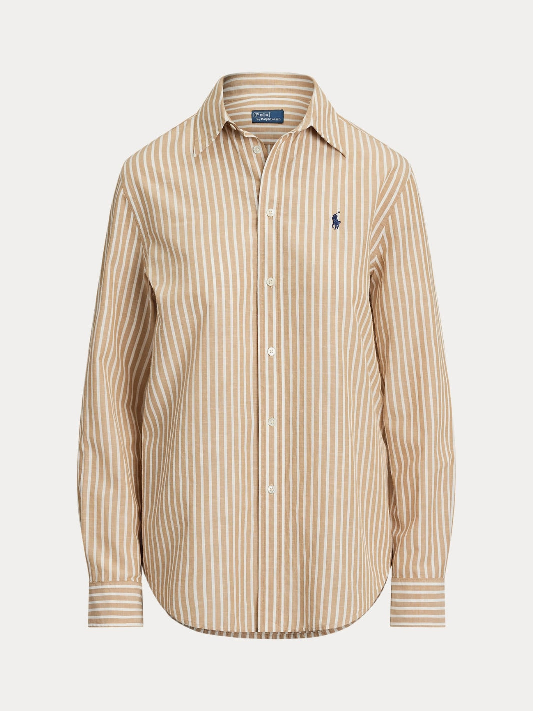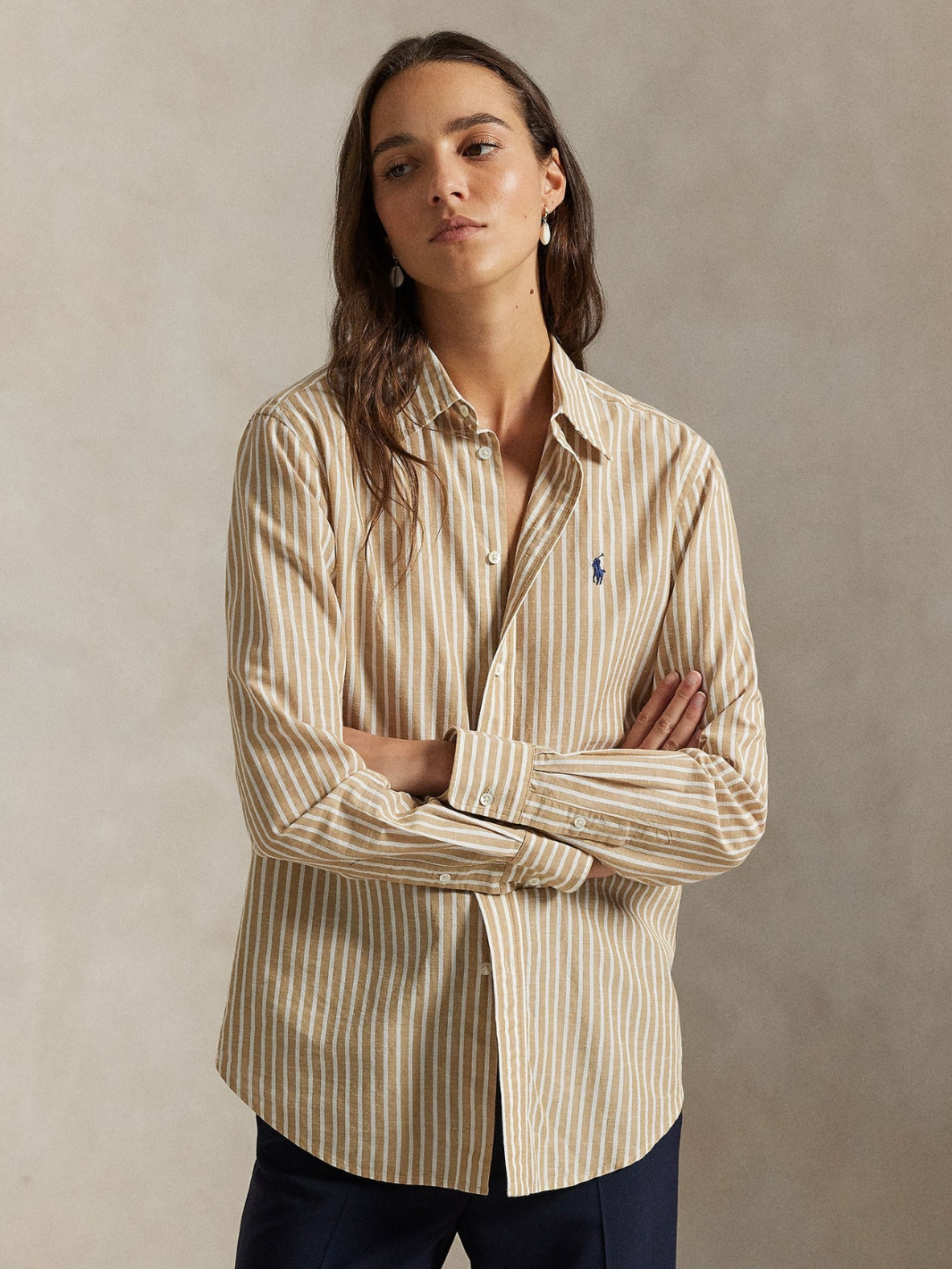 - Polo Ralph Lauren Classic Fit Striped Cotton-Linen Shirt Classic Camel / White