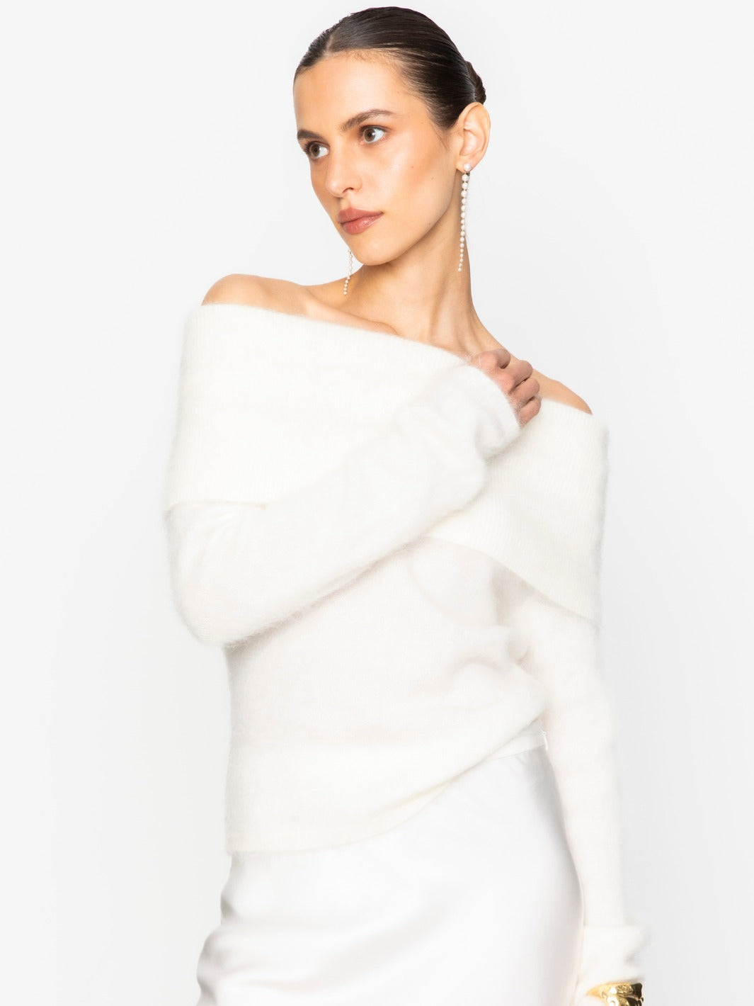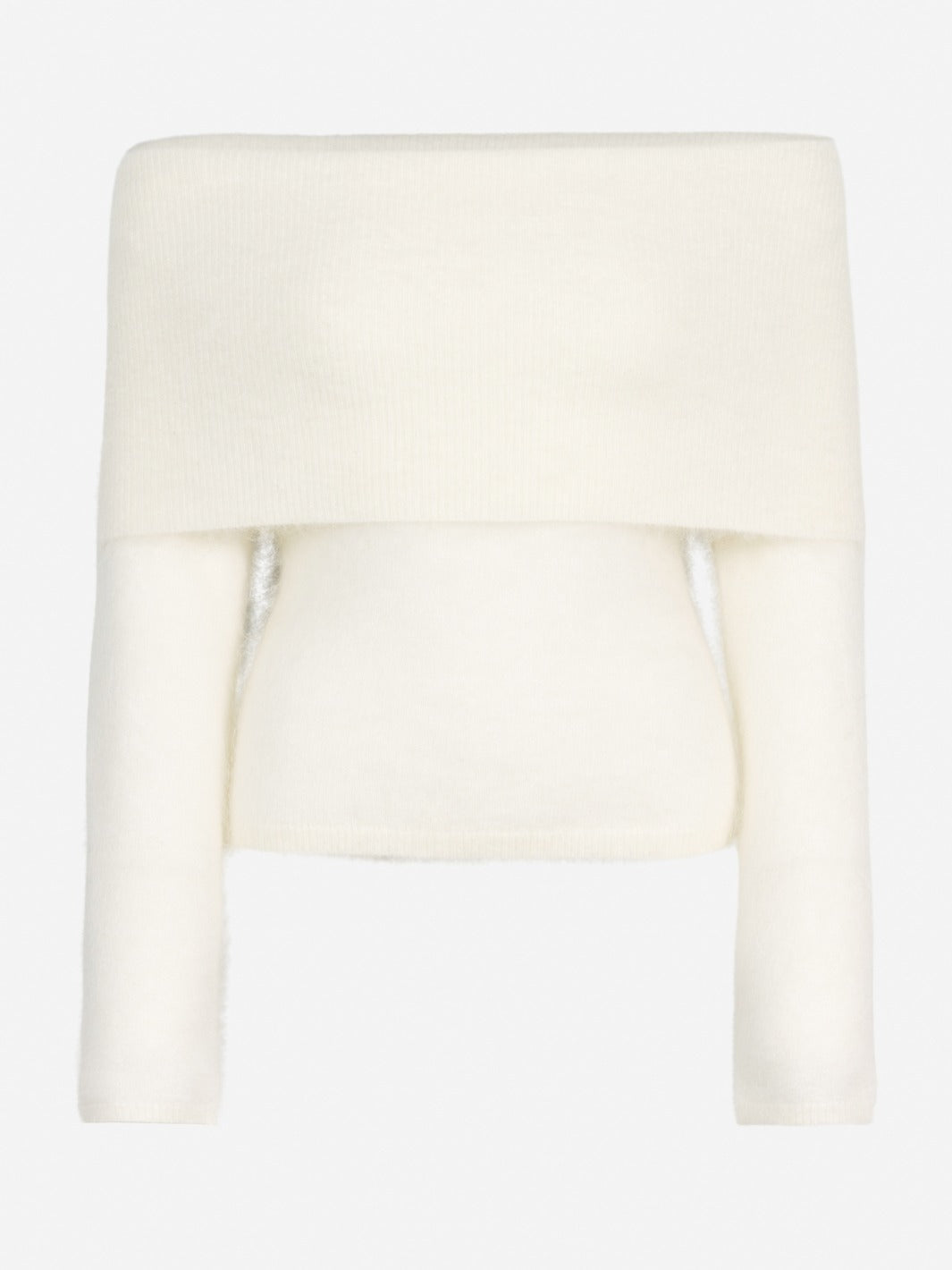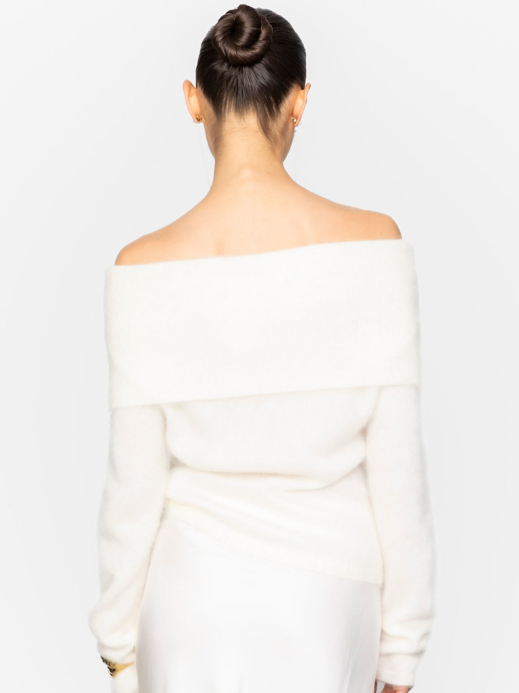 Eliette Off-Shoulder Knit fra Camilla Pihl. En hvit strikket off-shoulder genser, laget i en myk blanding av børstet mohair.