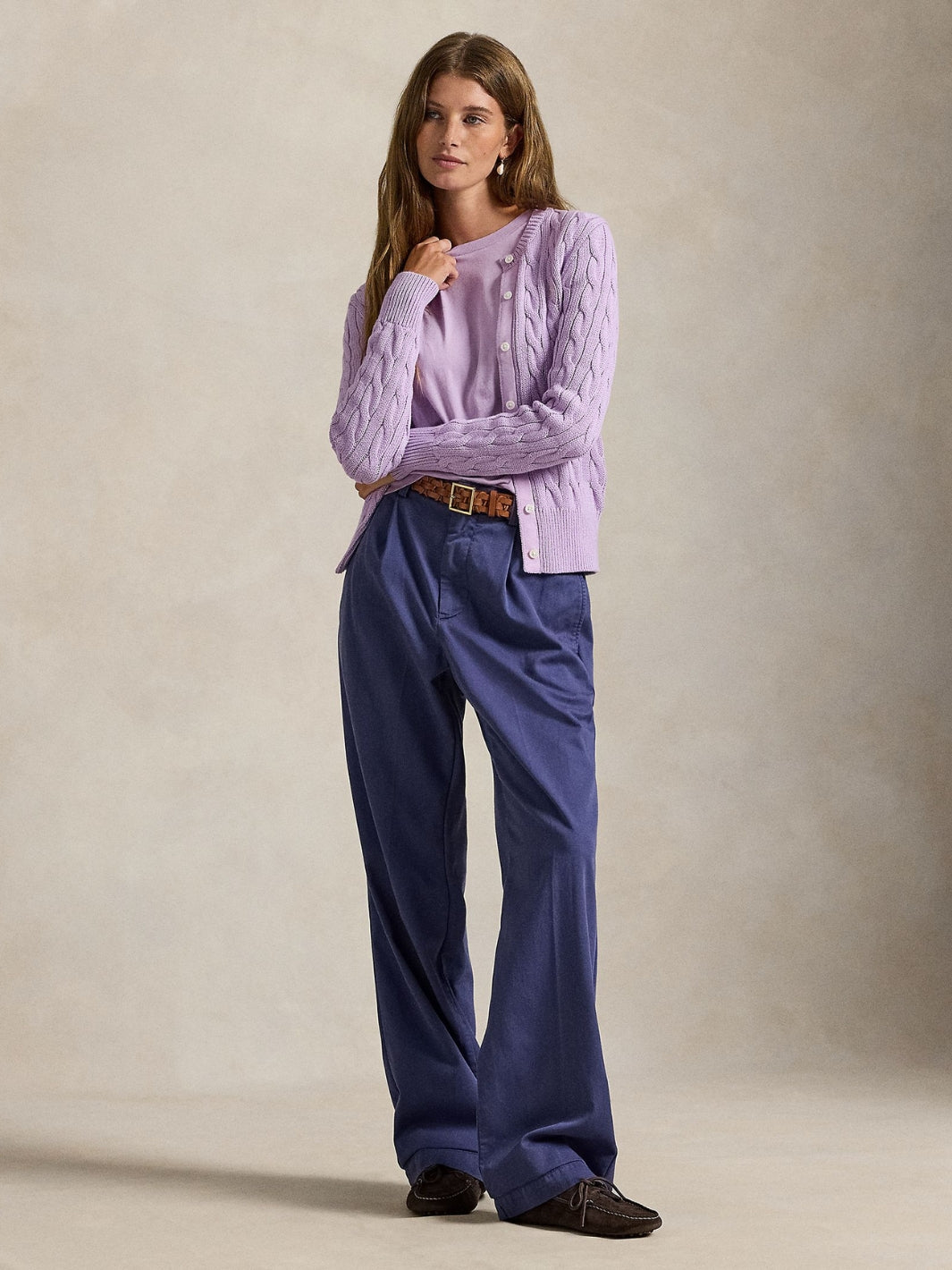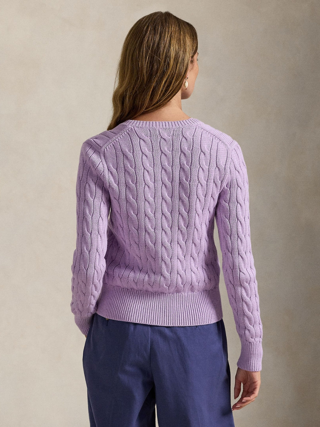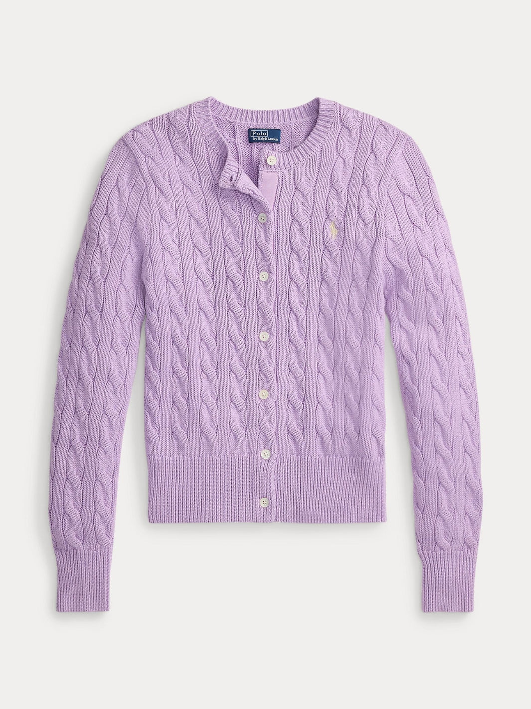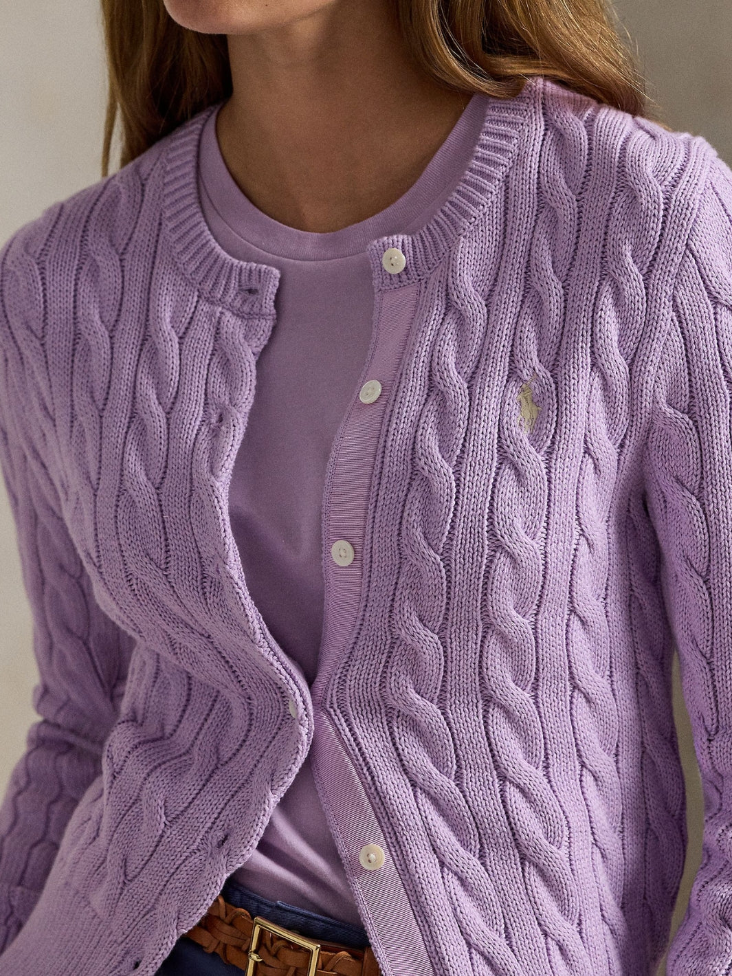 Cable-Knit Cotton Crewneck Cardigan fra Polo Ralph Lauren. En lys lilla kabelstrikket cardigan med rund hals. Den har smal passform og er laget i bomull.