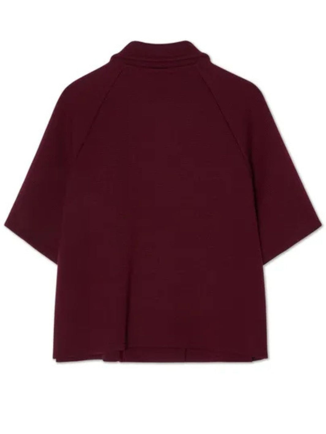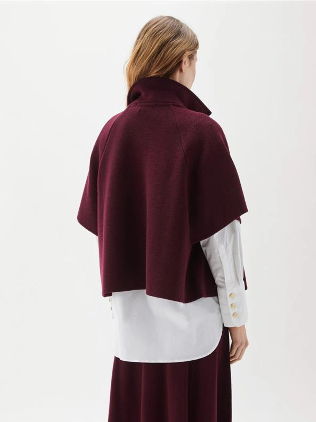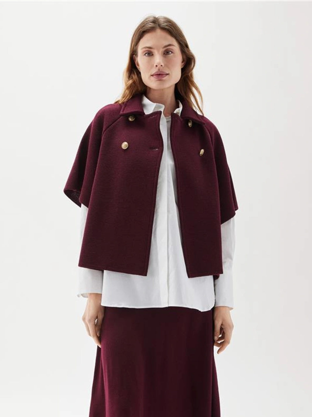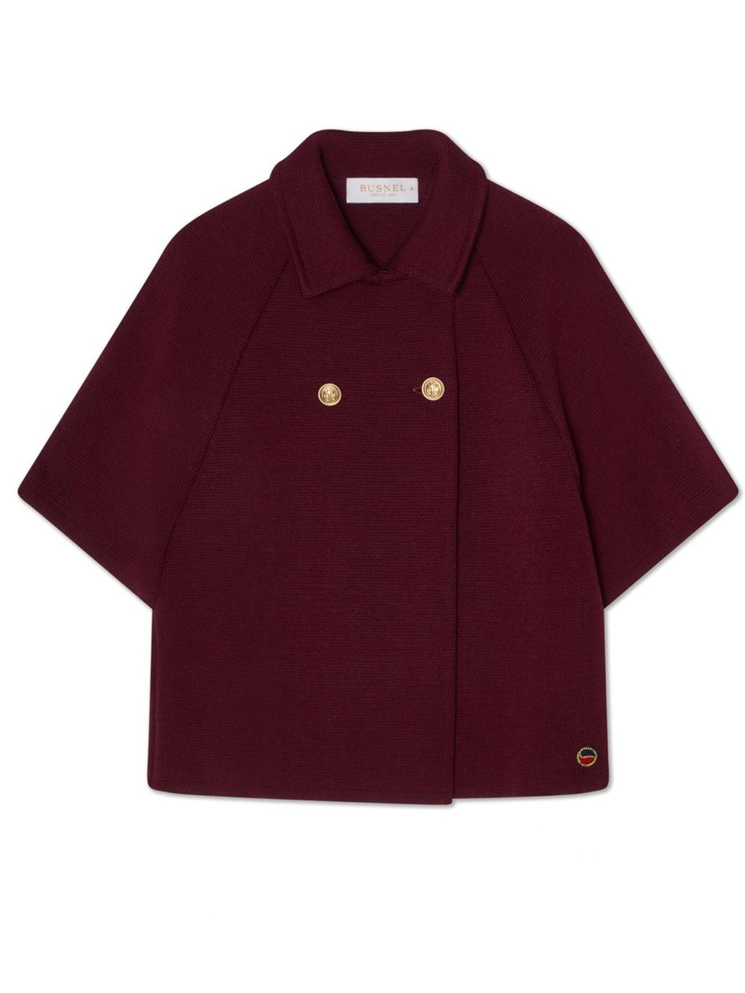 Gertrude Cape fra Busnel. En strikket burgunderrød poncho, laget av 100% ull. Jakken er dobbelspent, og detaljert med krage, korte ermer og gullknapper.