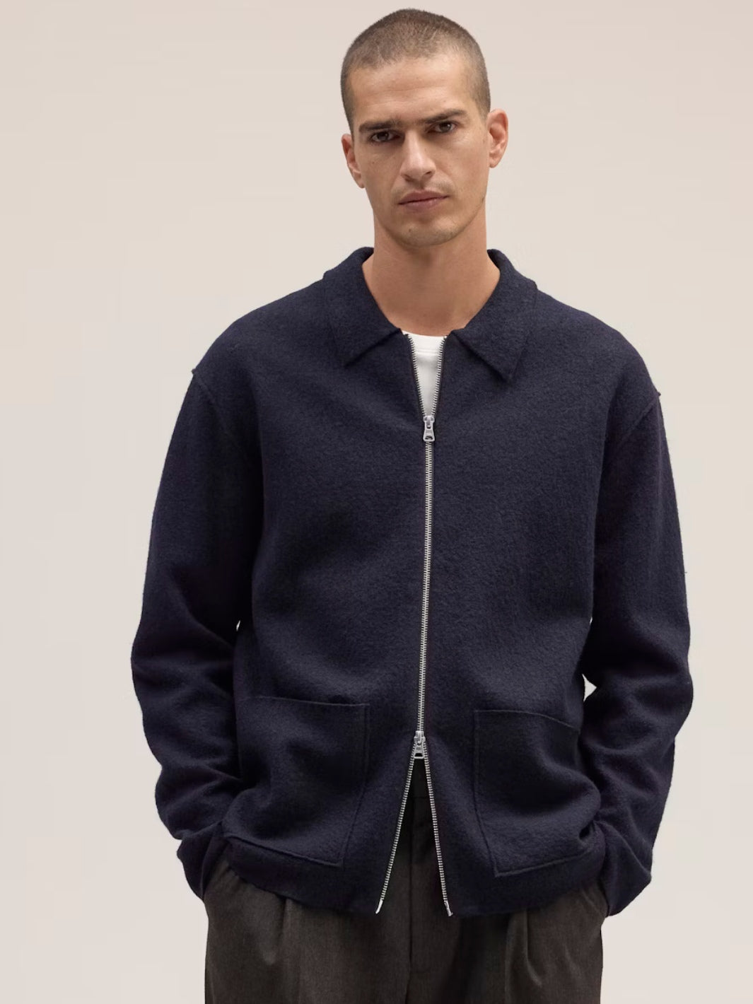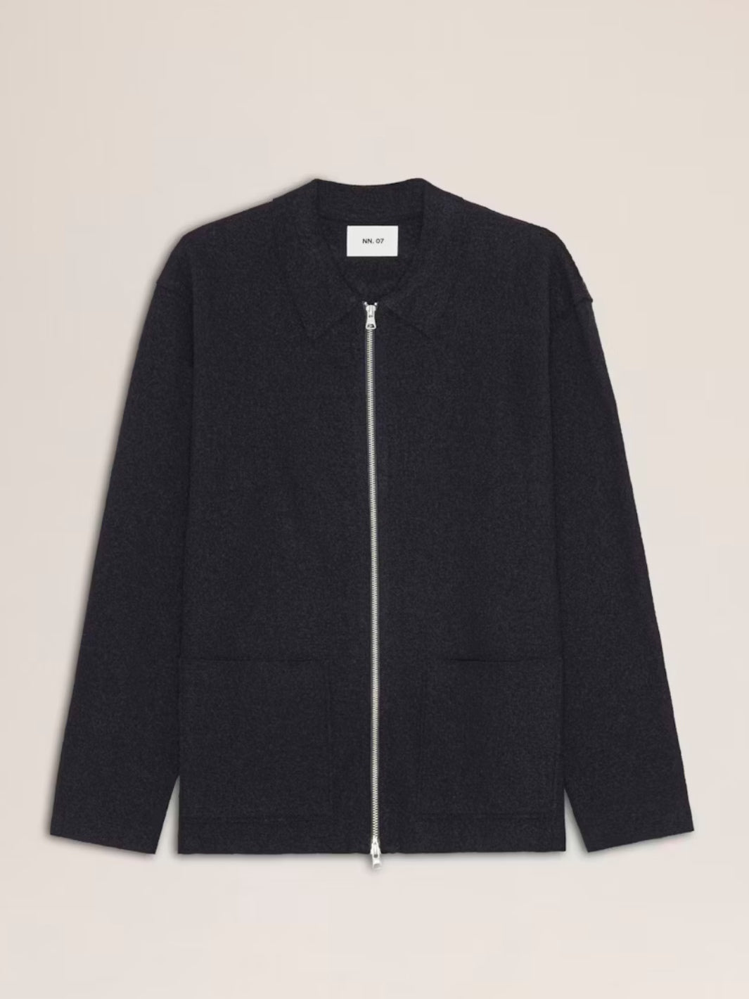Jonas Full Zip Cardigan fra NN07. En marineblå cardigan med toveis glidelås, laget av 100% merinoull. Cardiganen har krage og lommer foran.