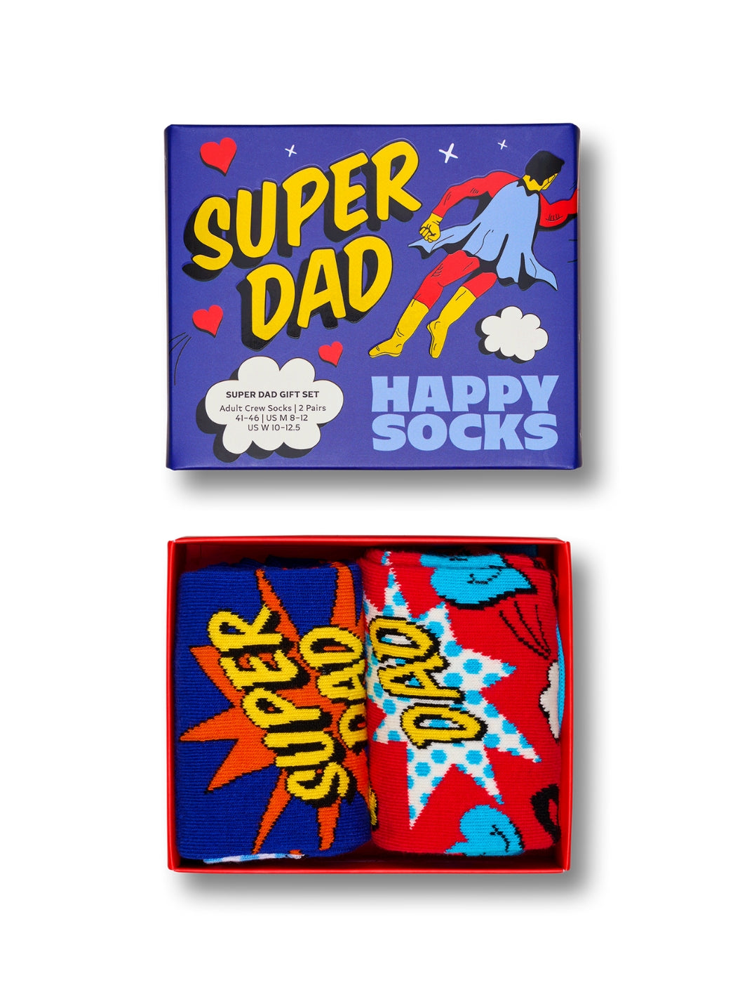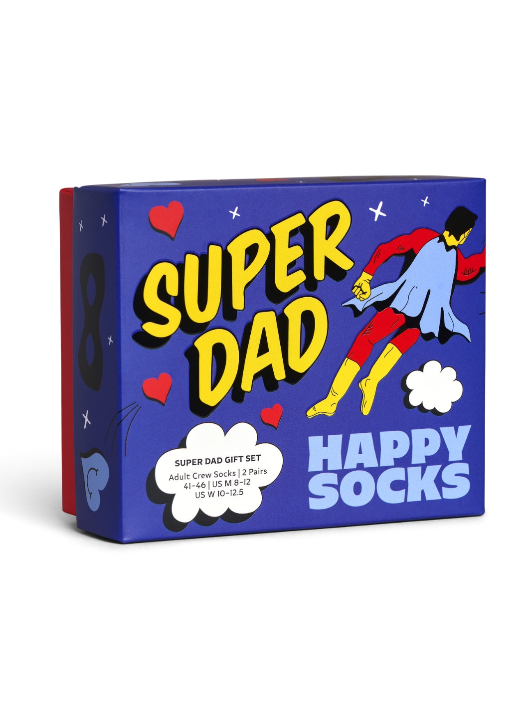 2pk Super Dad Socks fra Happy Socks. Feir superhelten i livet ditt med dette gavesettet med 2 sokker. Settet inneholder ett par blå sokker med «Super Dad»-motiv og ett par røde sokker med tydelig «Super Dad»-tekst.