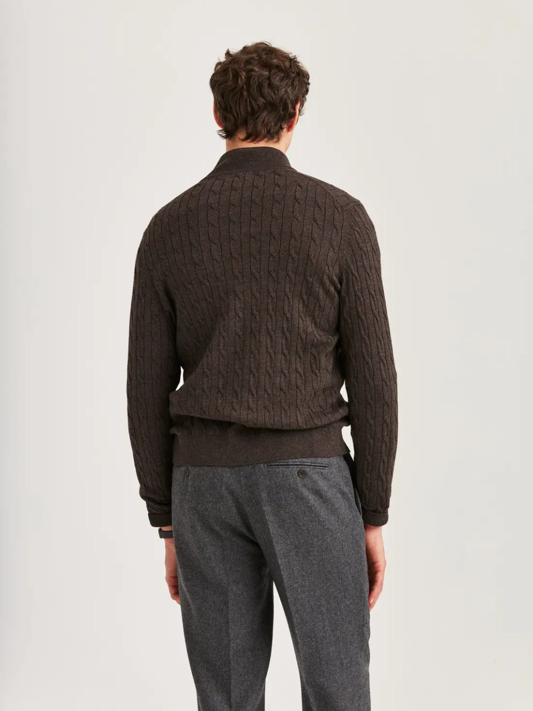 Merino Cable Zip Cardigan fra Morris. Klassisk cardigan i myk merinoull. Modellen har smal passform, hel glidelås og brodert lilje på brystet – et tidløst og funksjonelt plagg som passer både til hverdags og mer pyntede anledninger.