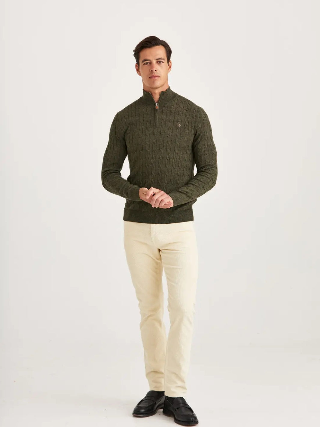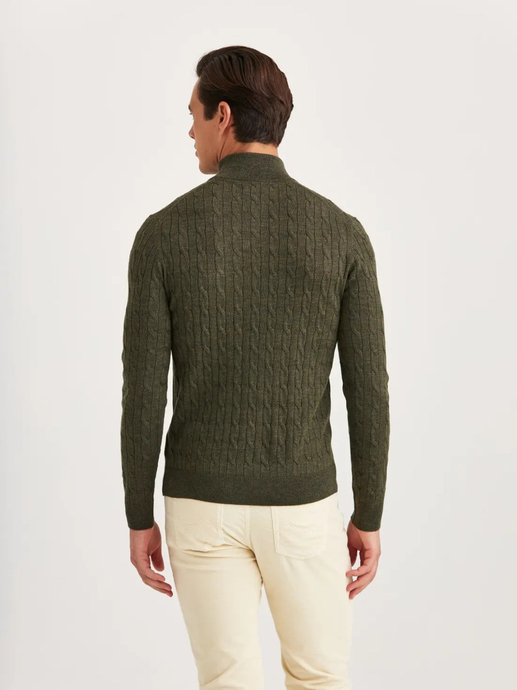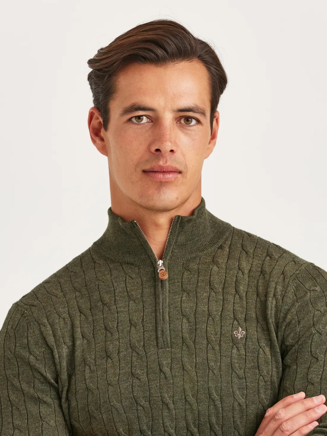 Merino Cable John Zip fra Morris. Kabelstrikket half-zip genser laget i 100% merinoull, her i grønn. Genseren har en diskret morris-logo brodert på brystet.