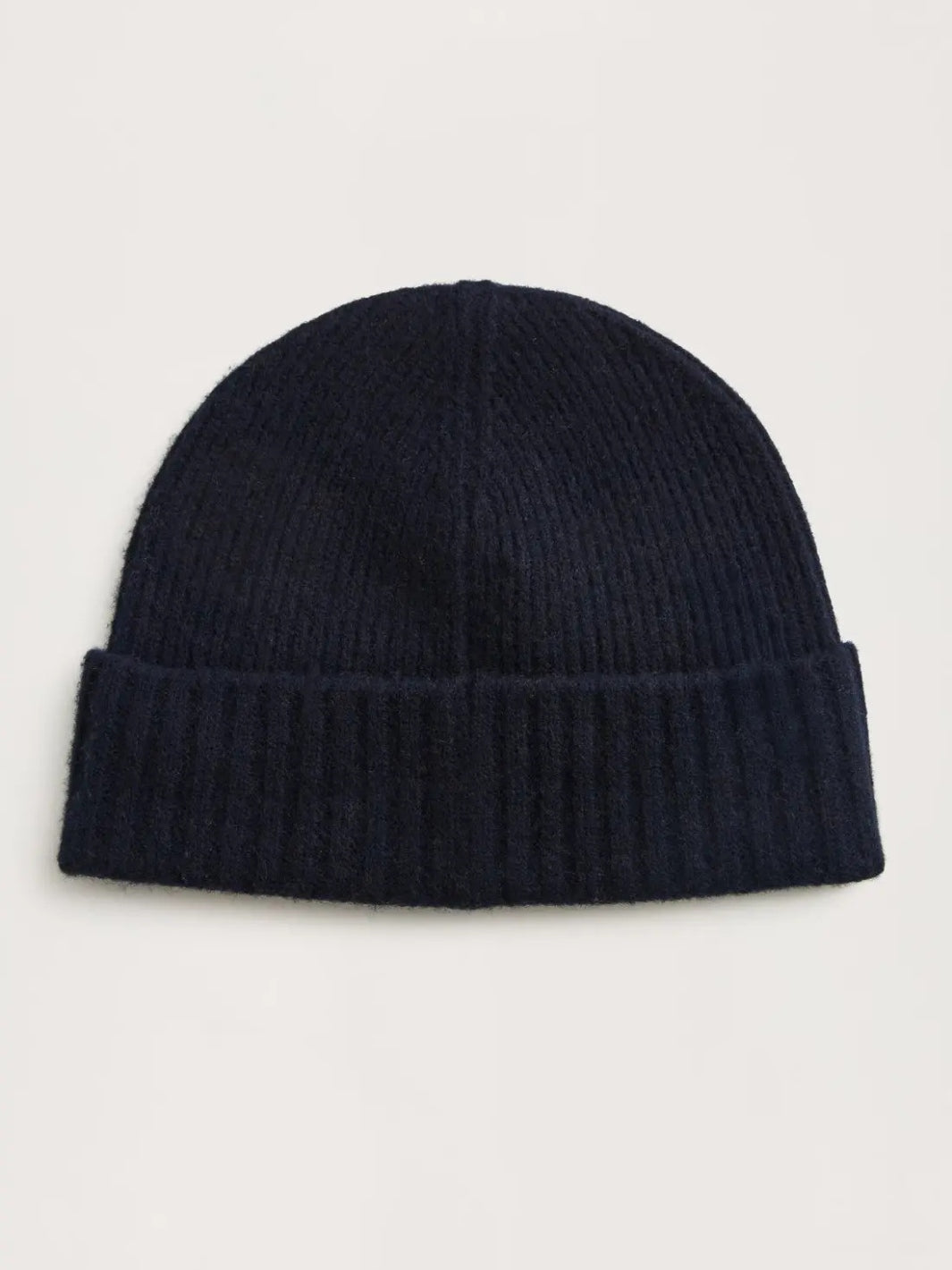 Hertford Beanie fra Morris. En marineblå klassisk lue i 100% merinoull med ribbestruktur. Modellen har oppbrettet kant dekorert med Morris’ signaturlogo.