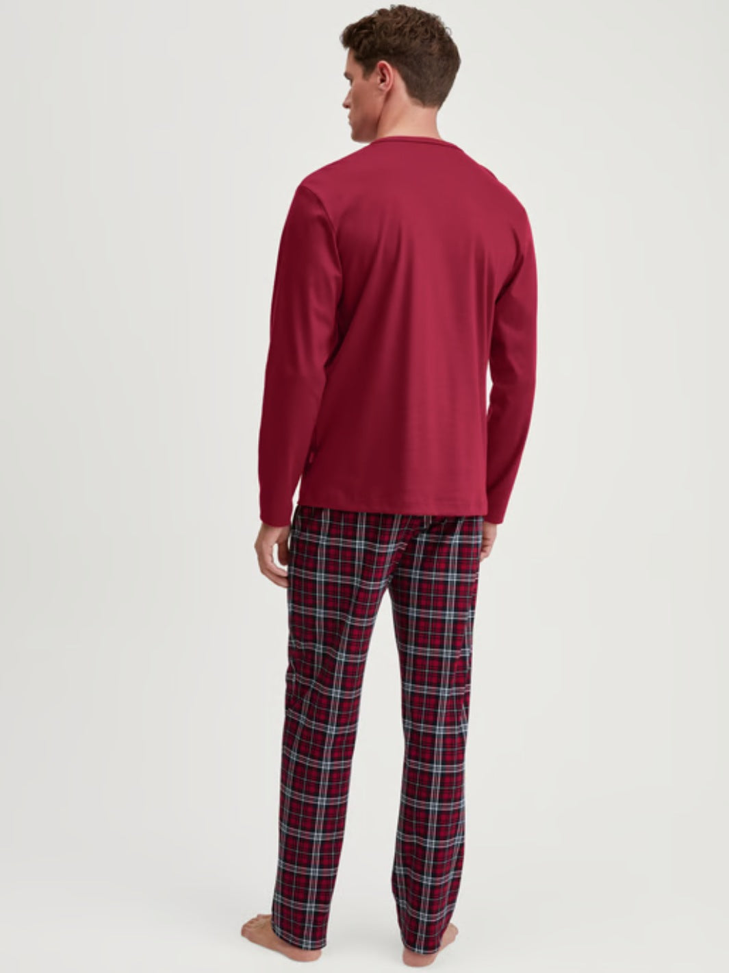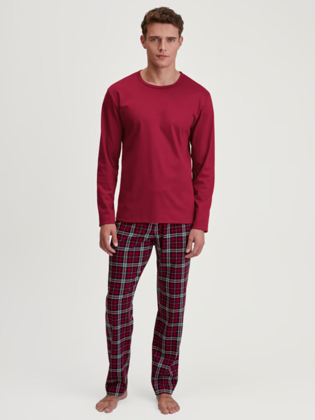Long Pyjamas fra Calida. Et pyjamassett som består av en rød genser og en rutete pysjbukse, laget i myk og pustende bomull.