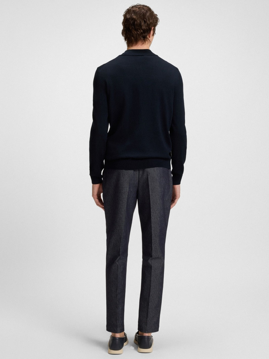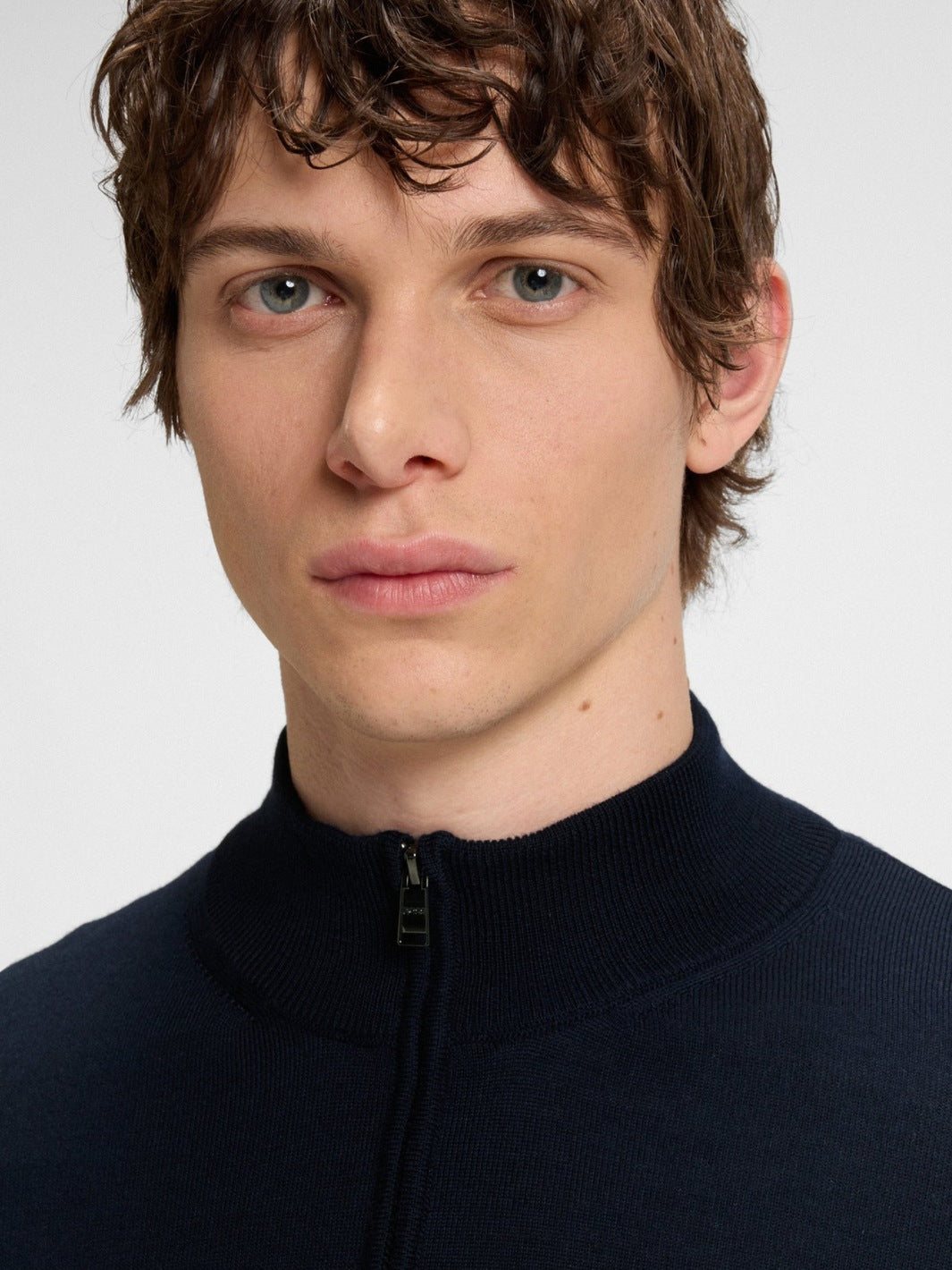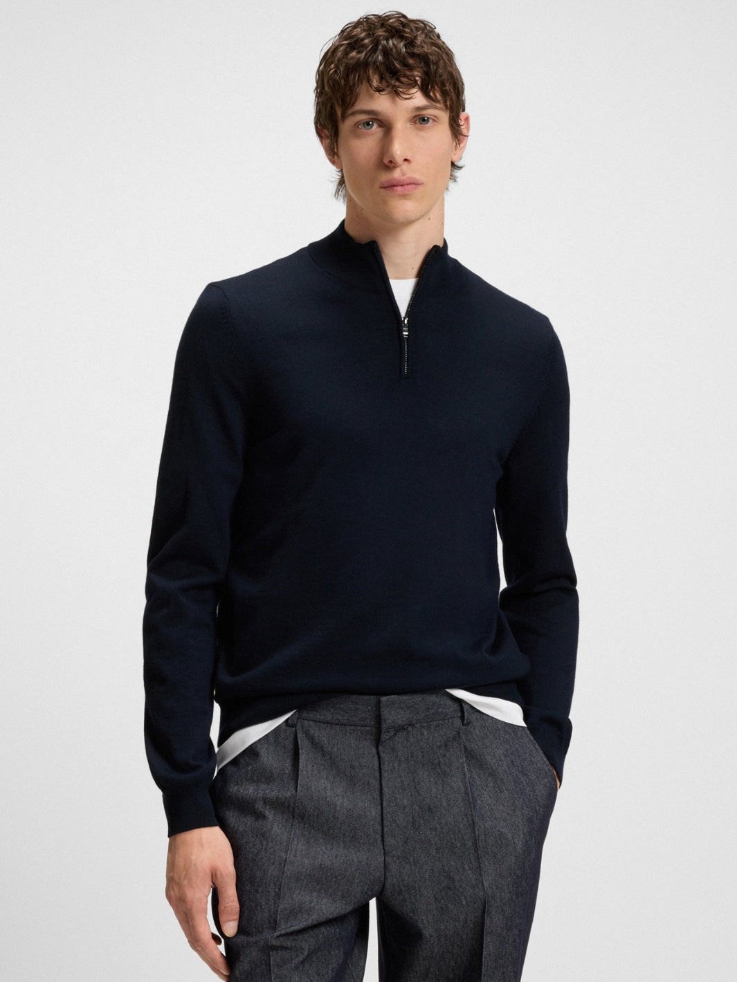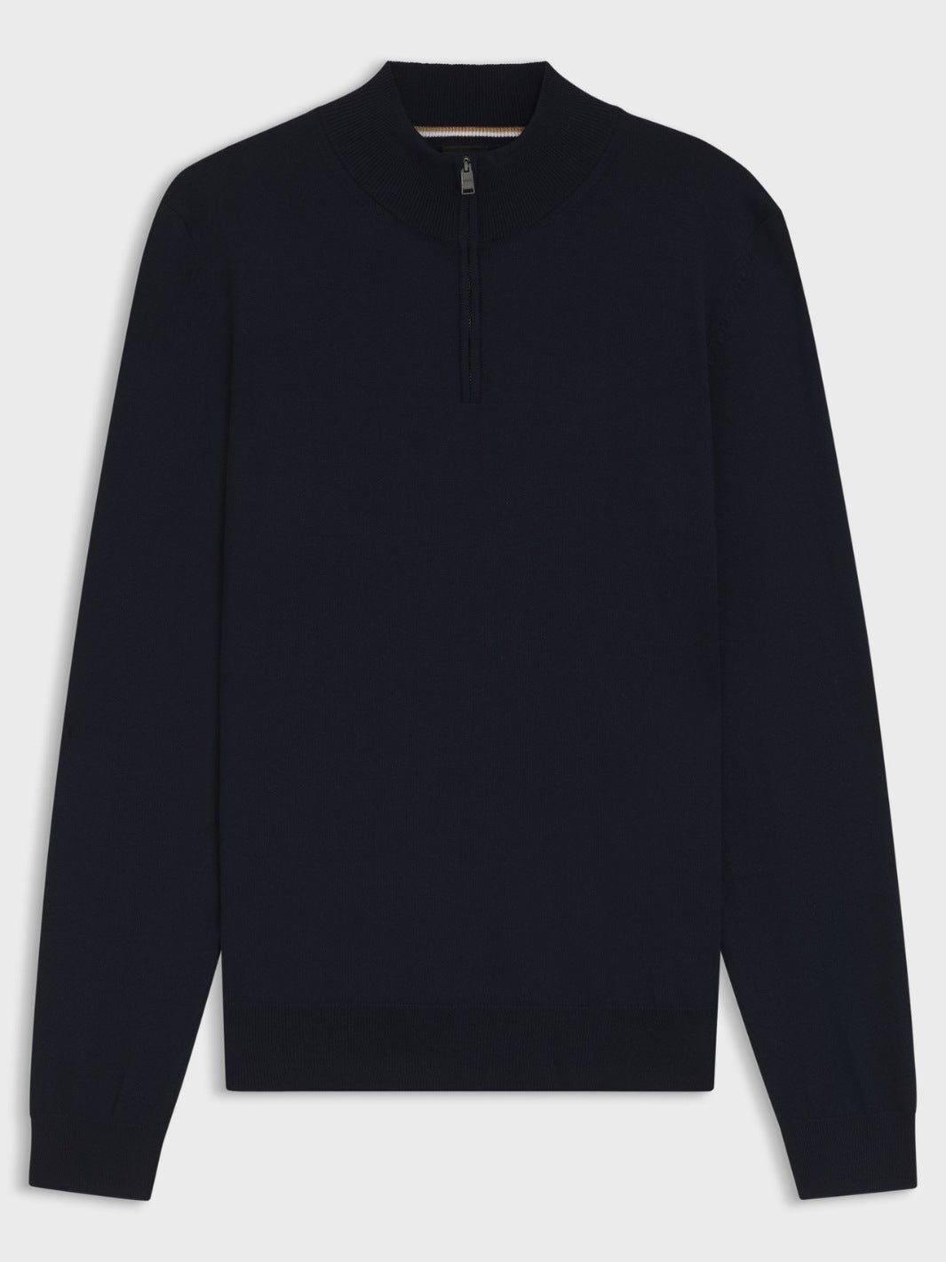 Zip-Neck Sweater fra BOSS. Marineblå half-zip genser, laget i 100% ull. Genseren er detaljert med ribbet krage og mansjetter.