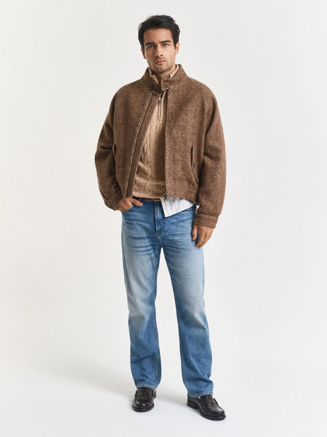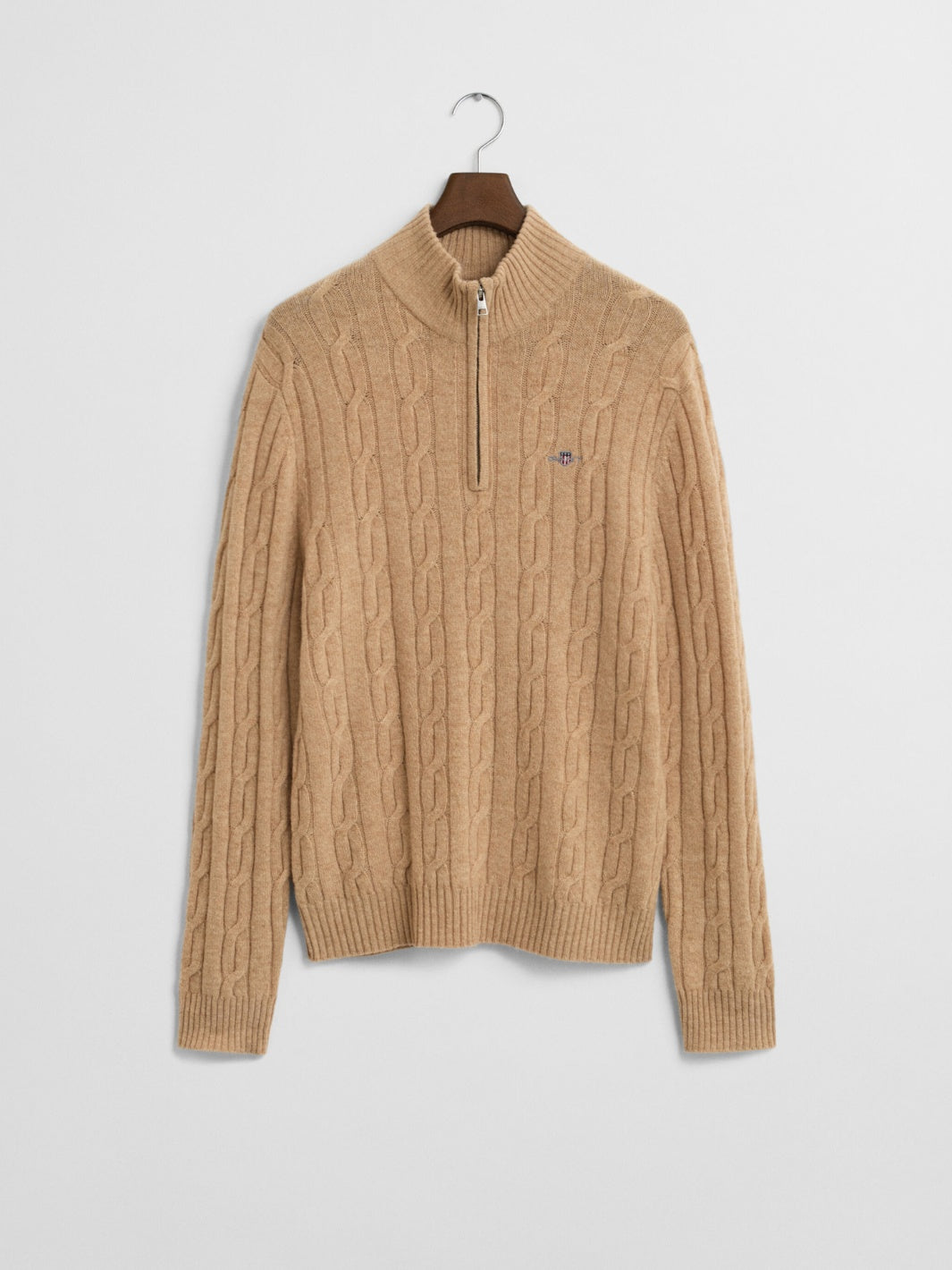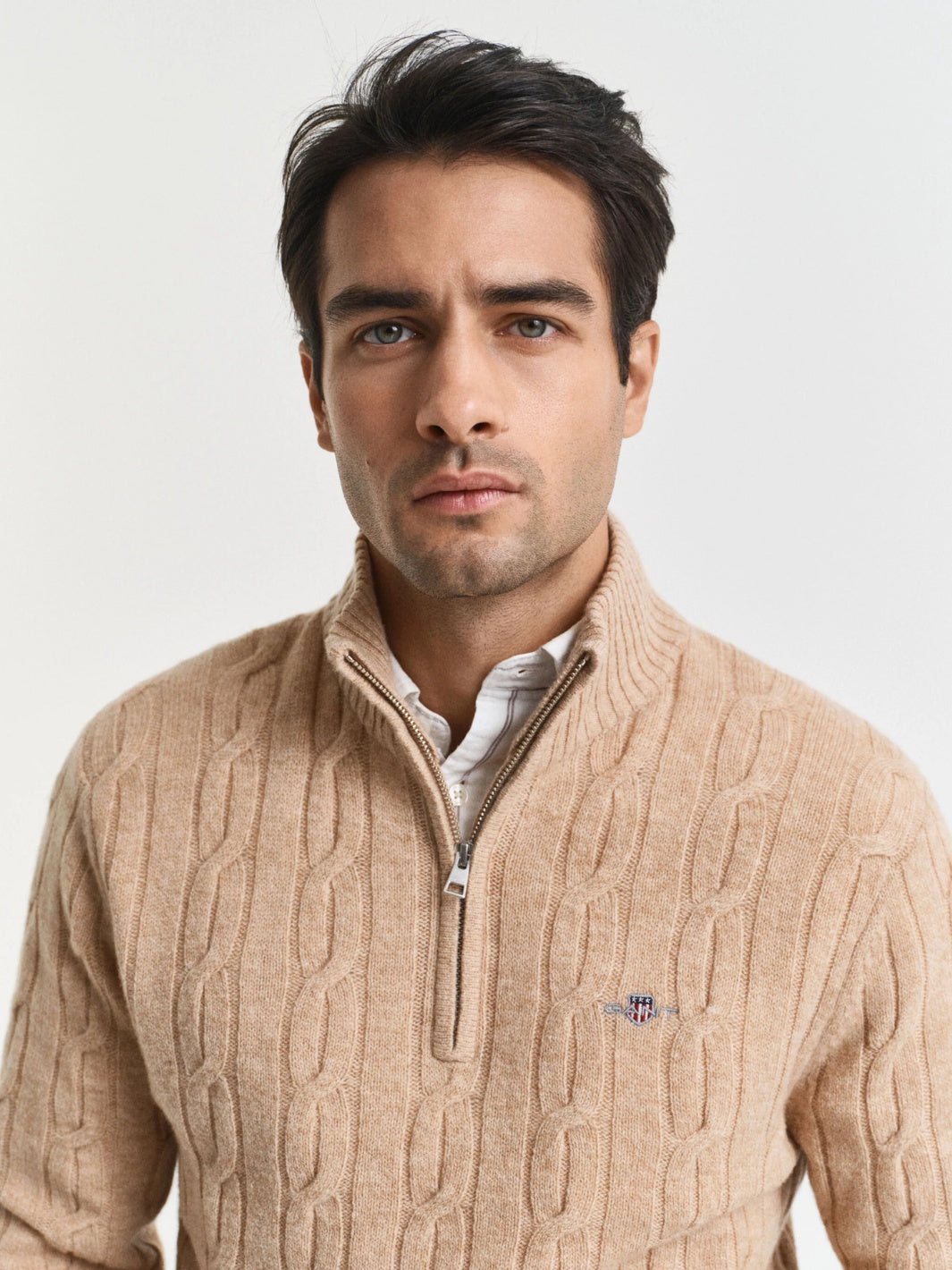 Lambswool Half Zip fra GANT. En beige kabelstrikket half-zip genser, laget av supermyk merinoull. Genseren er detaljert med brodert logo, og ribbestrikk.