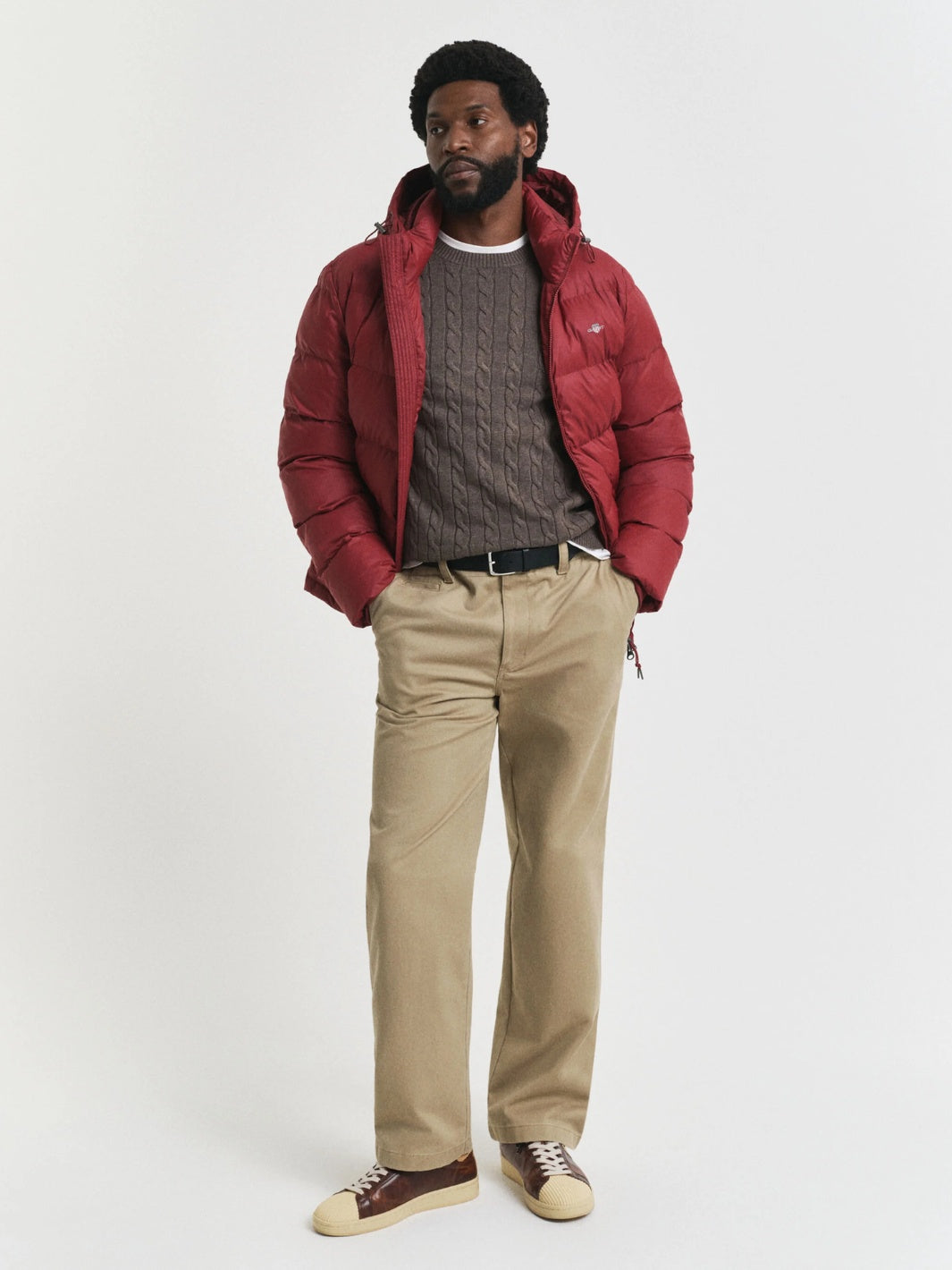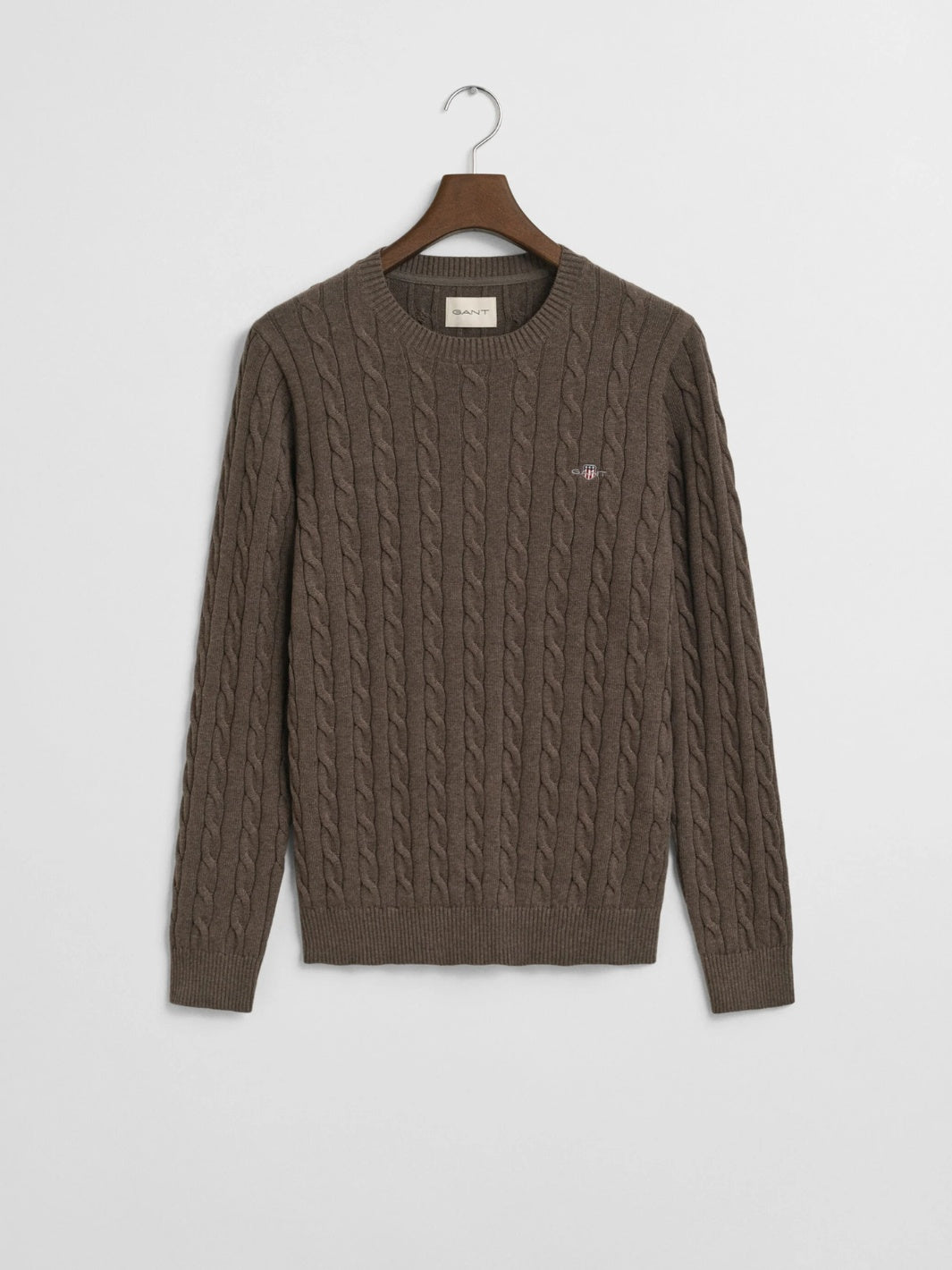 Cotton Cable C-Neck fra GANT. En brun kabelstrikket genser, detaljert med brodert GANT-logo på brystet.