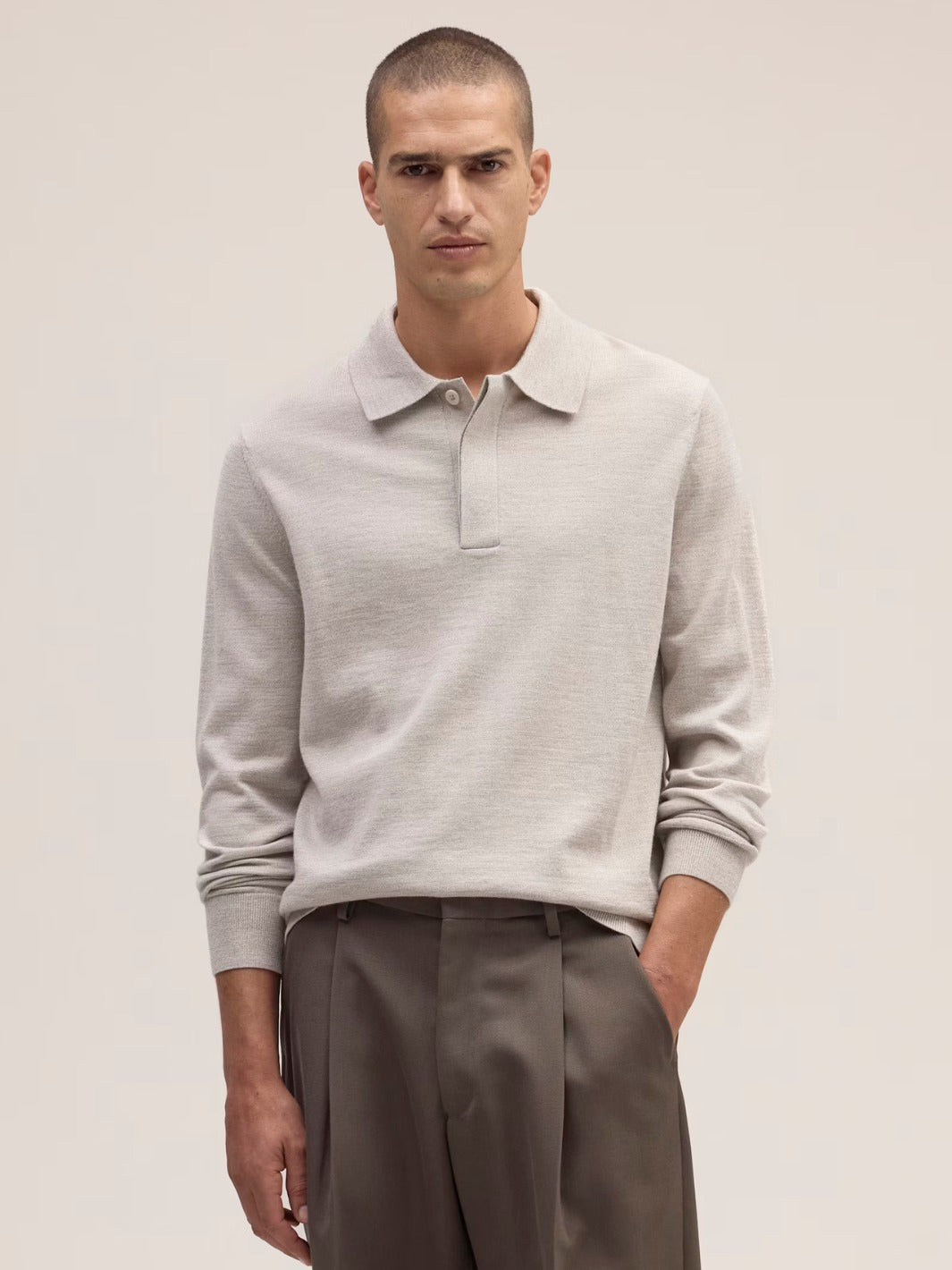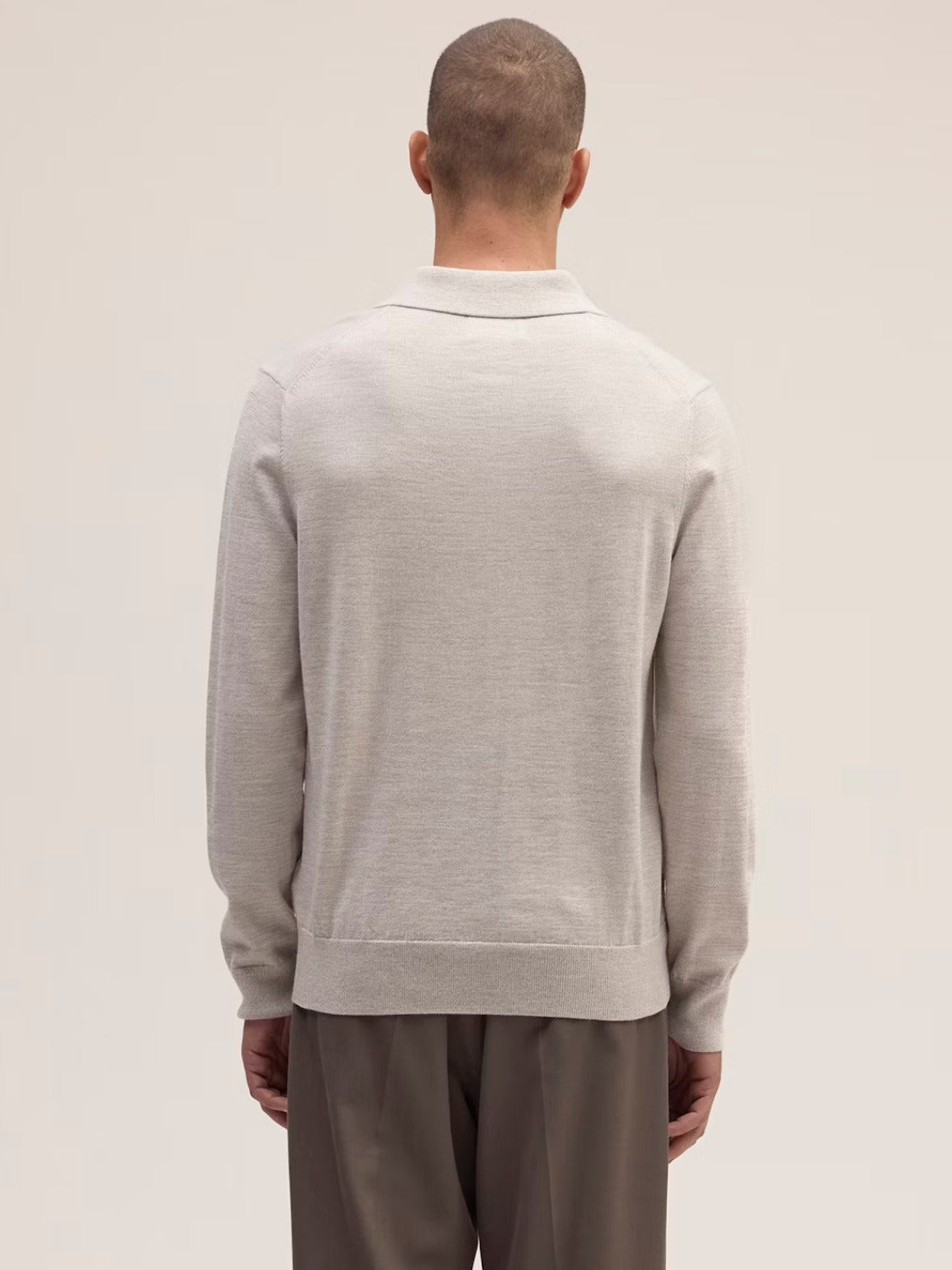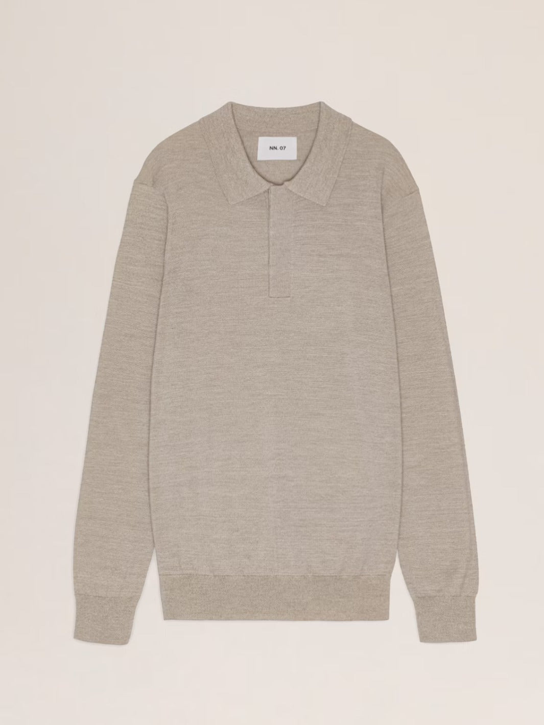 Emerson Sweater fra NN07. En beige genser med krage, laget av 100% ull. Genseren har ribbede detaljer og skjulte knapper.