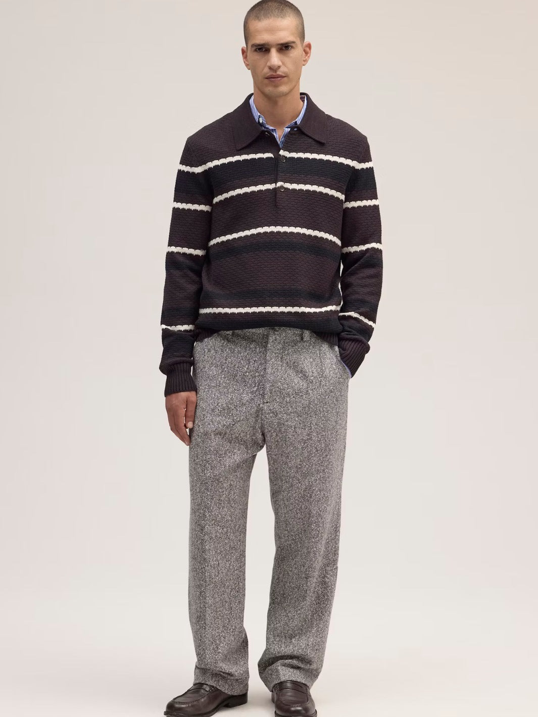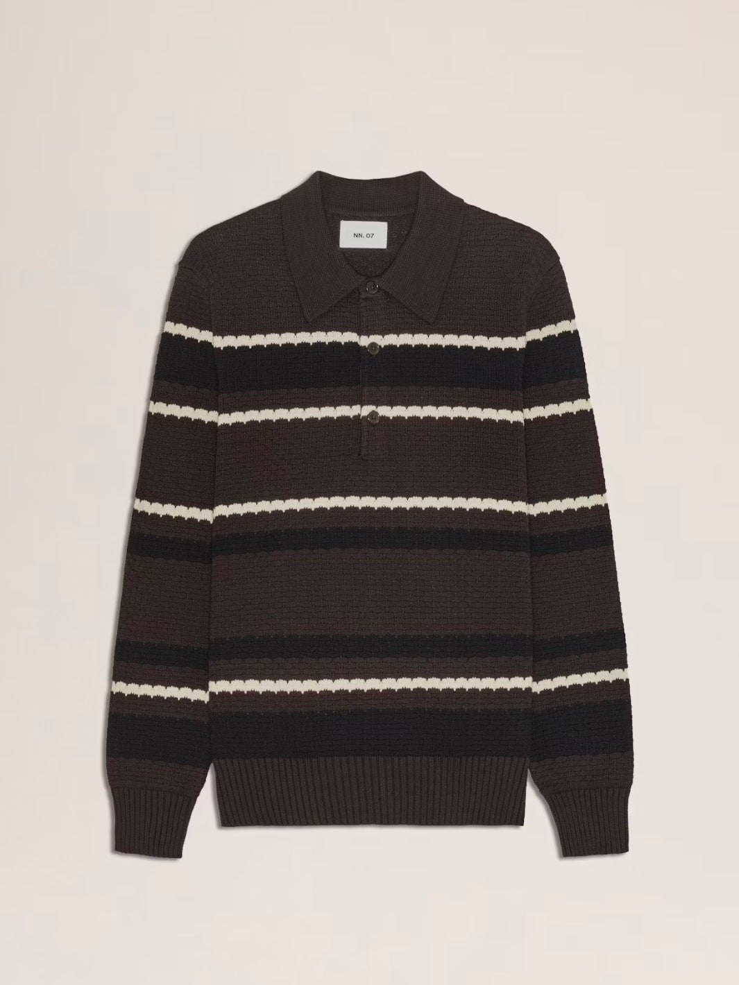 Alfie Polo Sweater fra NN07. En stripete brun pologenser i økologisk bomull med myk og behagelig tekstur.