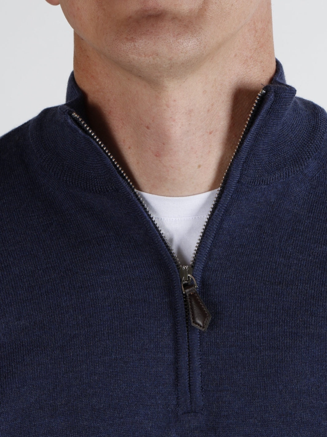 Half-Zip Merino fra RE del MARE. En klassisk blå genser med halv glidelås i halsen. Laget i myk merinoull.