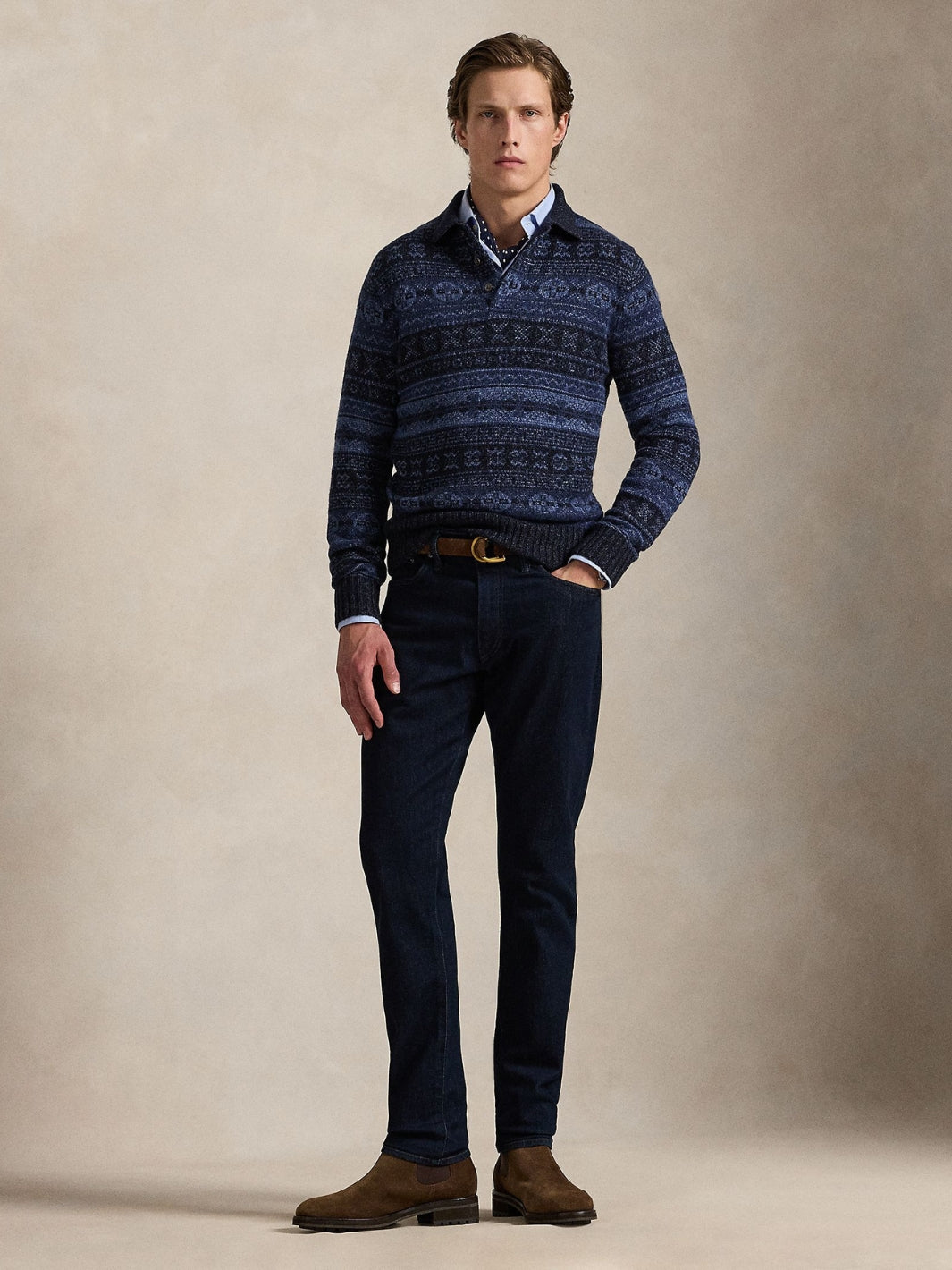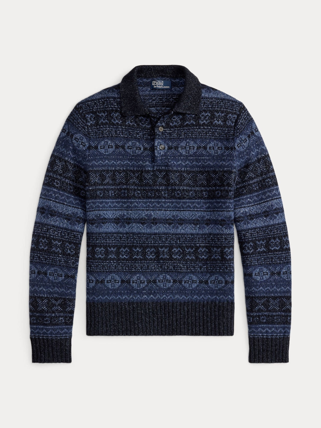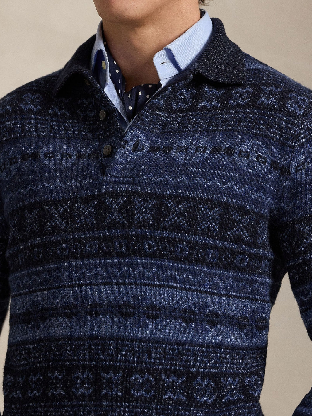 Fair Isle Polo-Collar Sweater fra Polo Ralph Lauren. En blå genser med Fair Isle-mønster, polokrage og treknapps stolpe. Genseren er laget i en myk ull- og linblanding, og er detaljert med corozo-knapper.