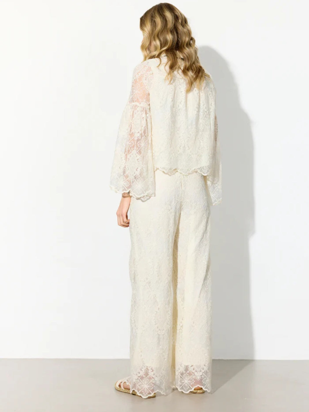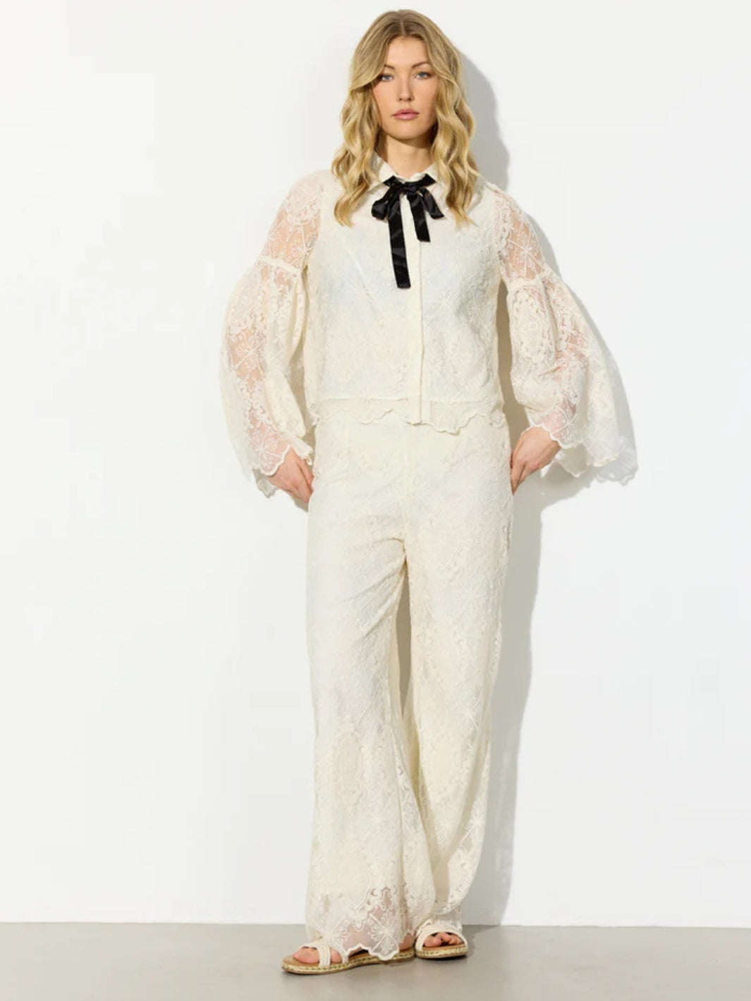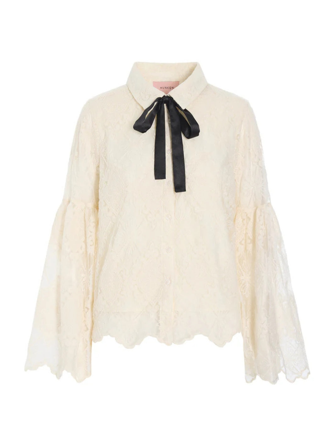 Lulu Lace Shirt fra Hunkøn. En hvit fôret blondebluse med lange, vide ermer. Blusen har krage og en sort sløyfe i halsen.