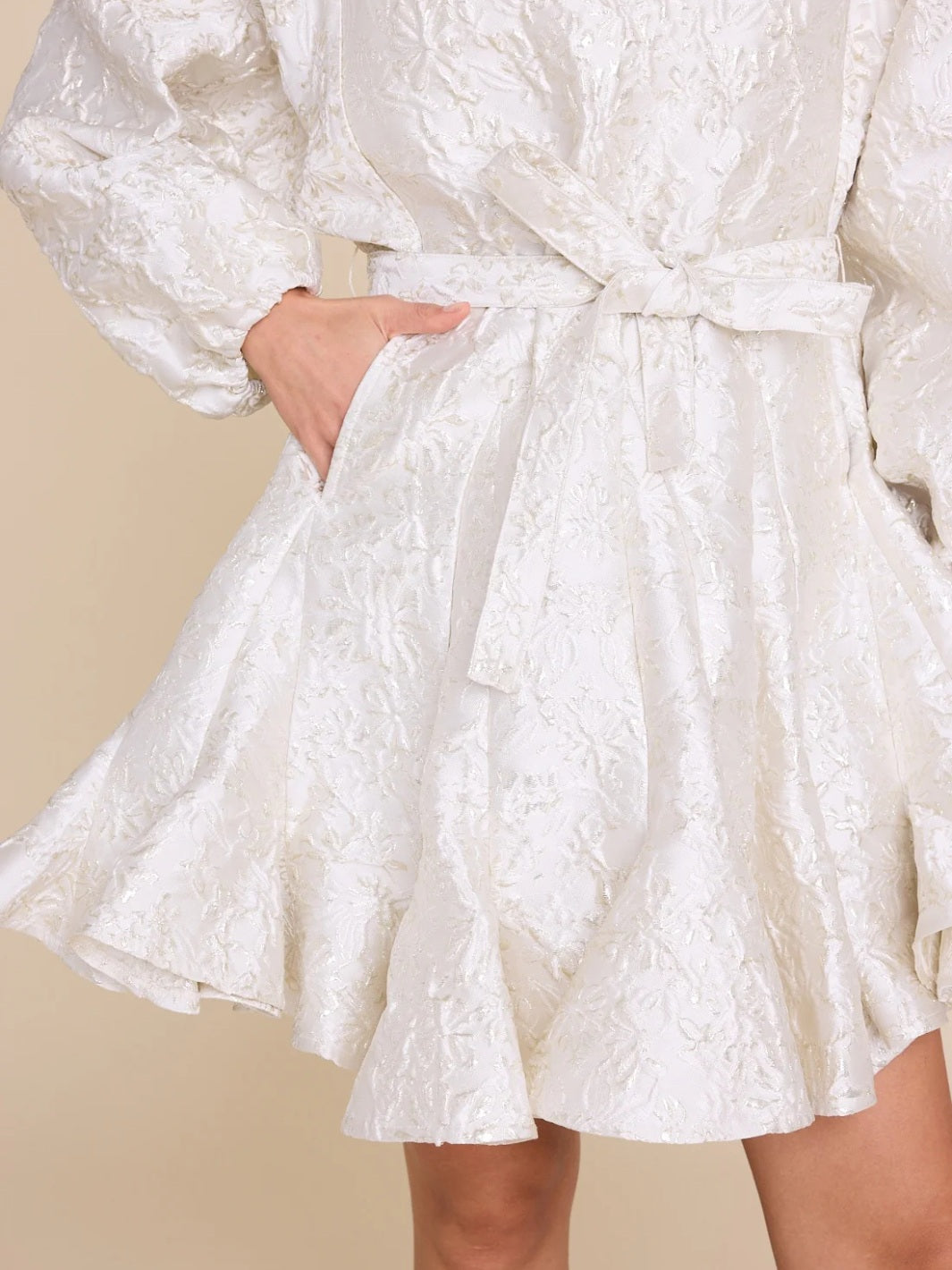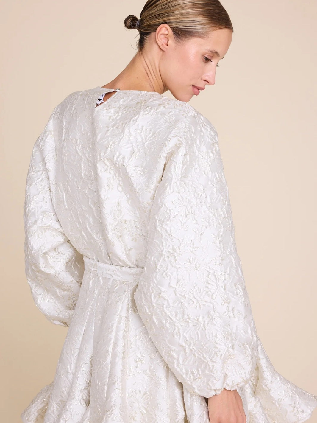 Poppy Metallic Dress fra Line Of Oslo. Kjole med voluminøse ermer og skjørt, her i hvit med metallisk glans. Midjen markeres med et avtagbart knytebelte.