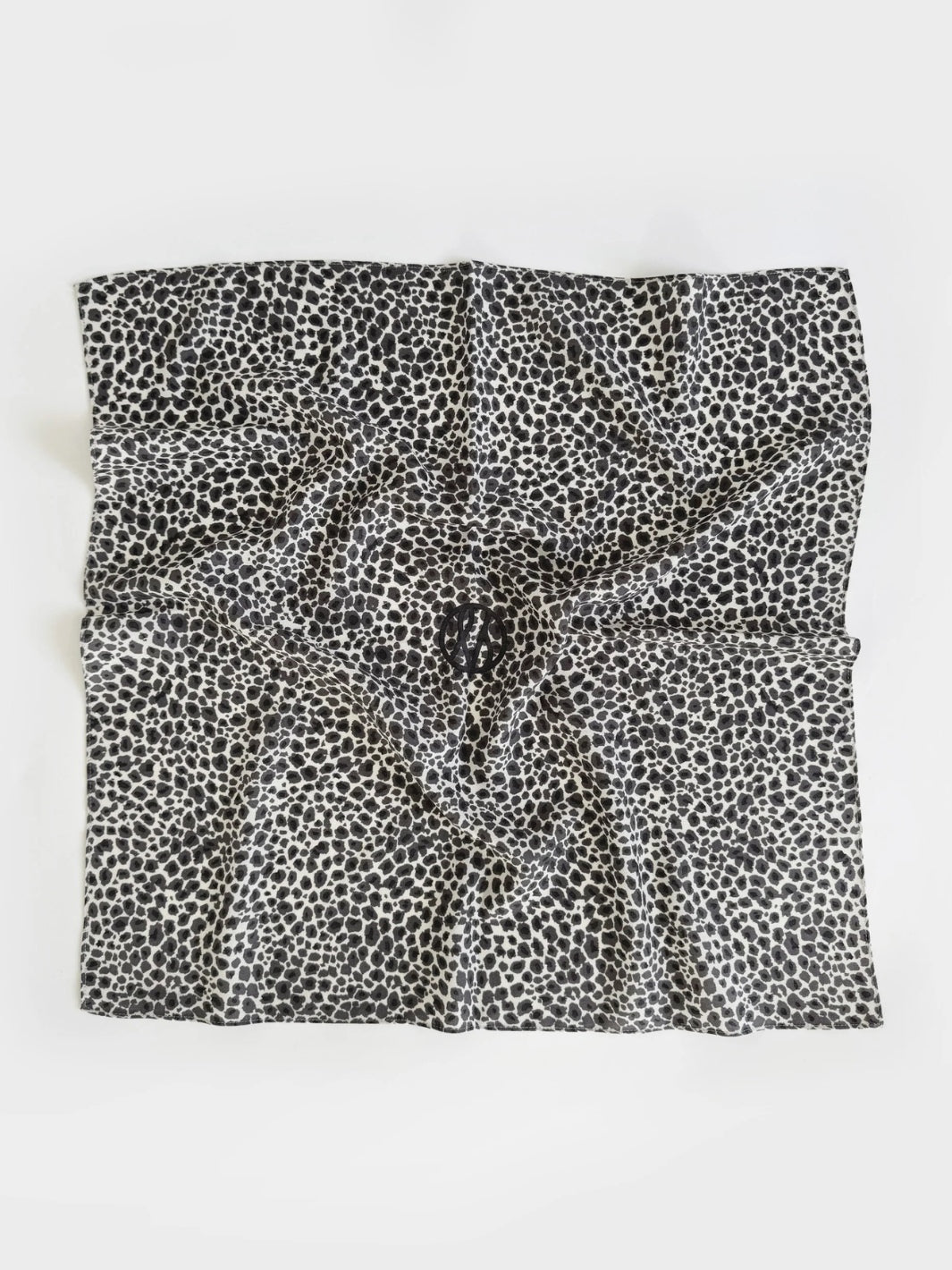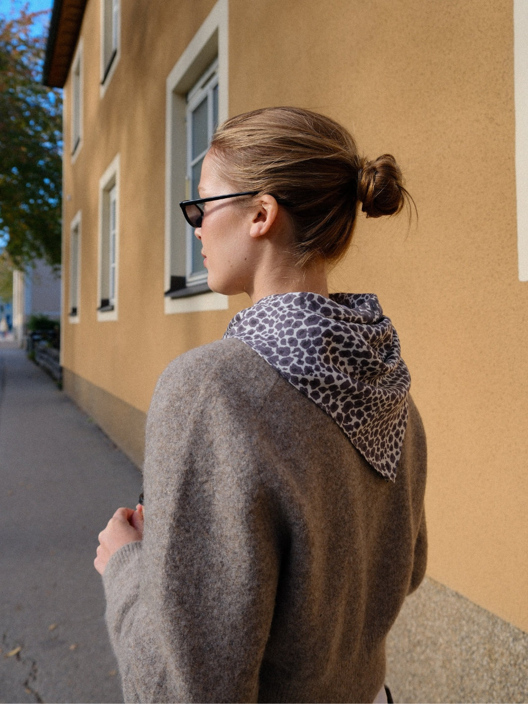 Winter Scarf Leo fra LeScarf. Et firkantet skjerf med leopard print, laget i en blanding av ull og silke. Kan styles i håret, på veska eller i halsen.