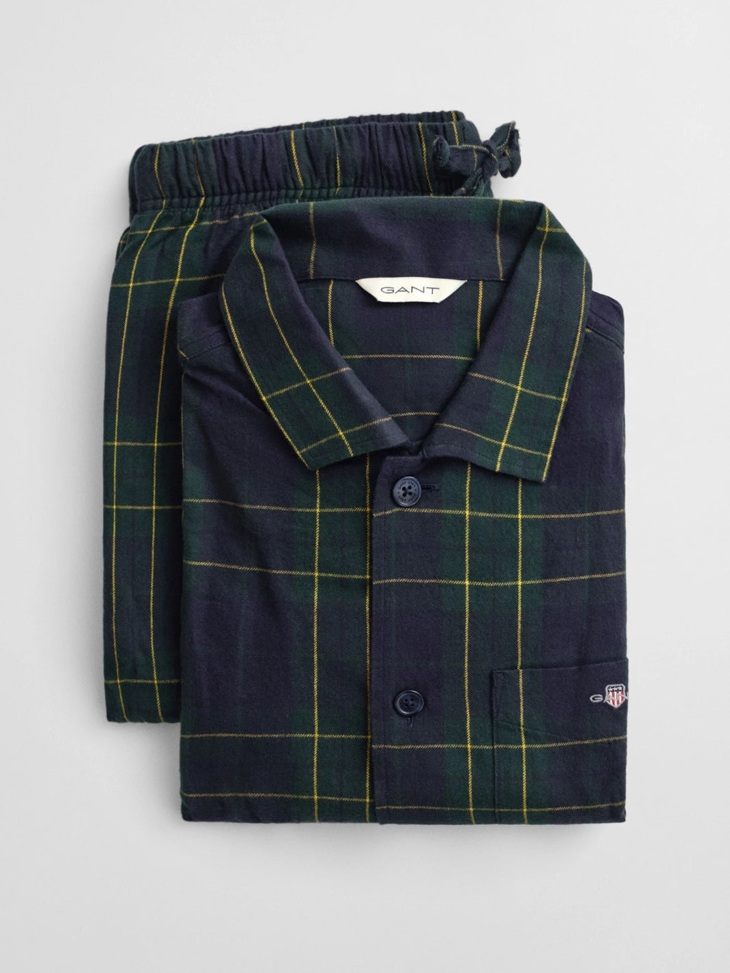 Flannel Pyjama Gift Box fra GANT. En gaveboks som inneholder en grønn rutete flannelpysjamas. Skjorten har brystlomme med brodert GANT-logo, og buksene er rette med snøring i livet.