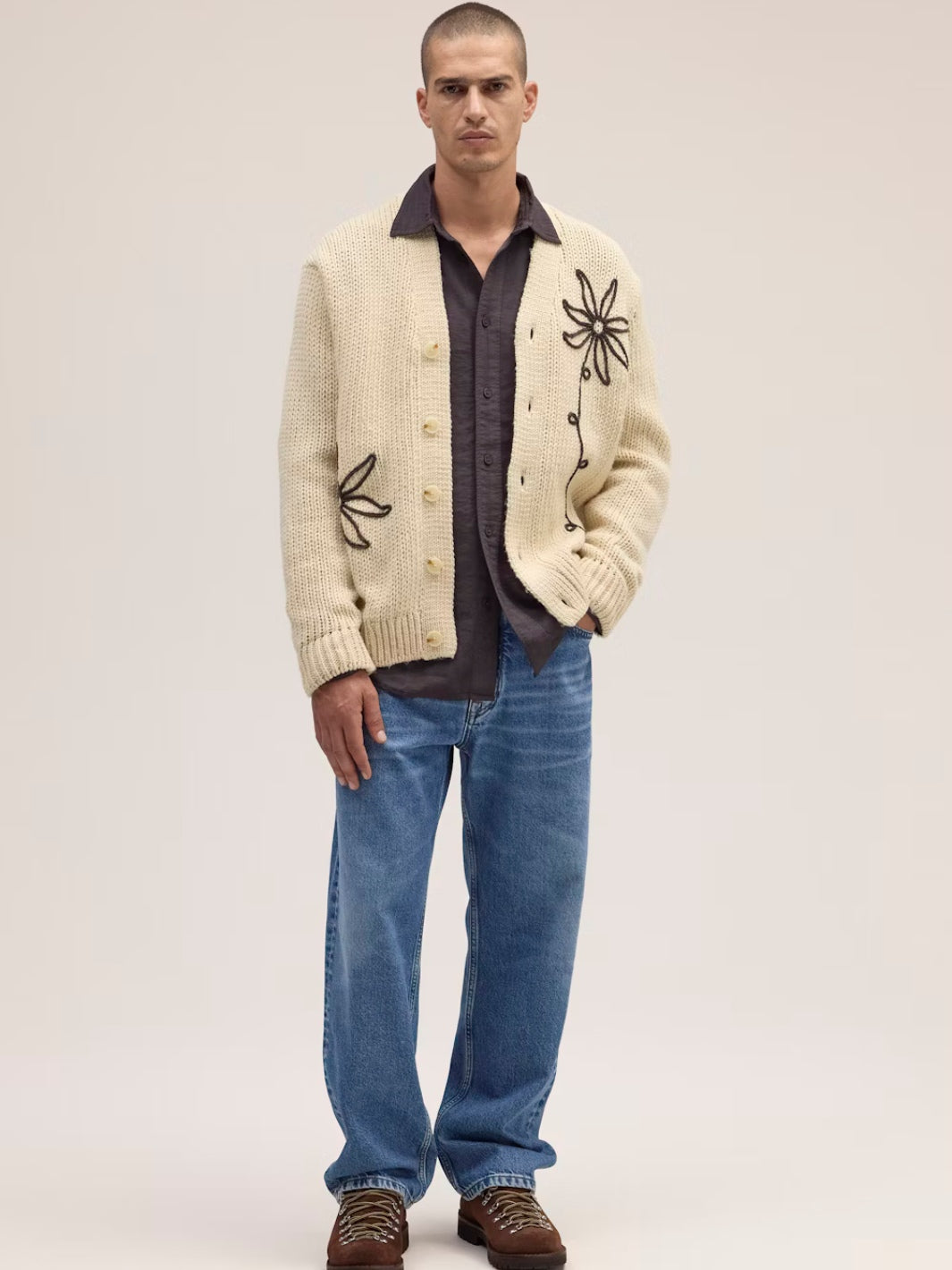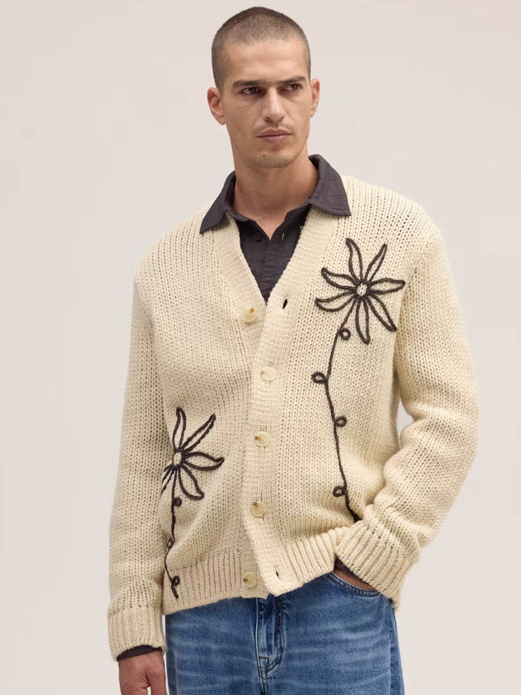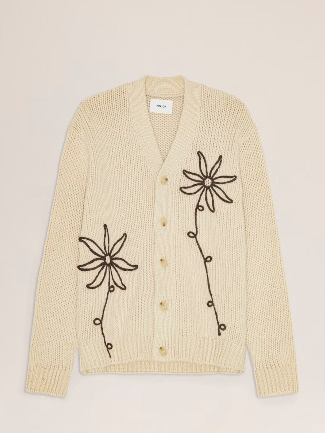 Mika Flower Cardigan fra NN07. En myk strikket cardigan med v-hals og knapper i front, her i off-white. Cardiganen er detaljert med ribbestrikk og brodert blomstermotiv.