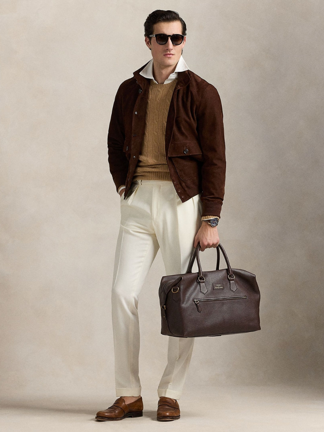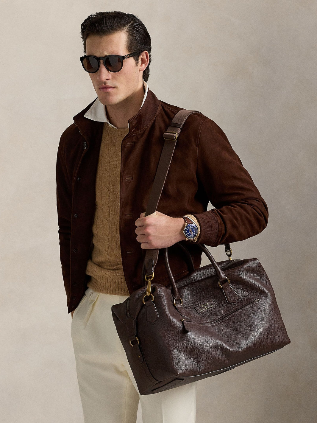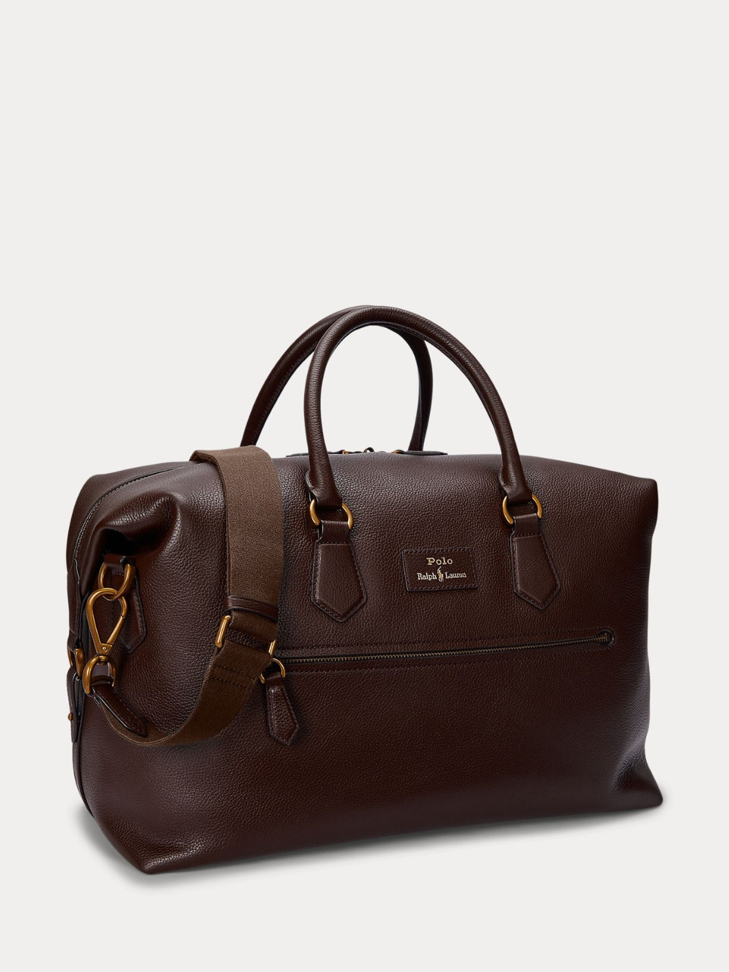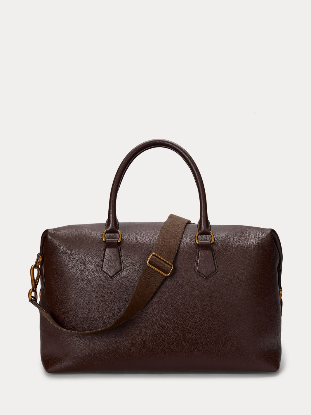 Pebbled Leather Duffel fra Polo Ralph Lauren. En brun bag med flere praktiske rom og lommer som holder eiendelene dine organiserte. Bagen har en avtagbar og justerbar skulderrem.