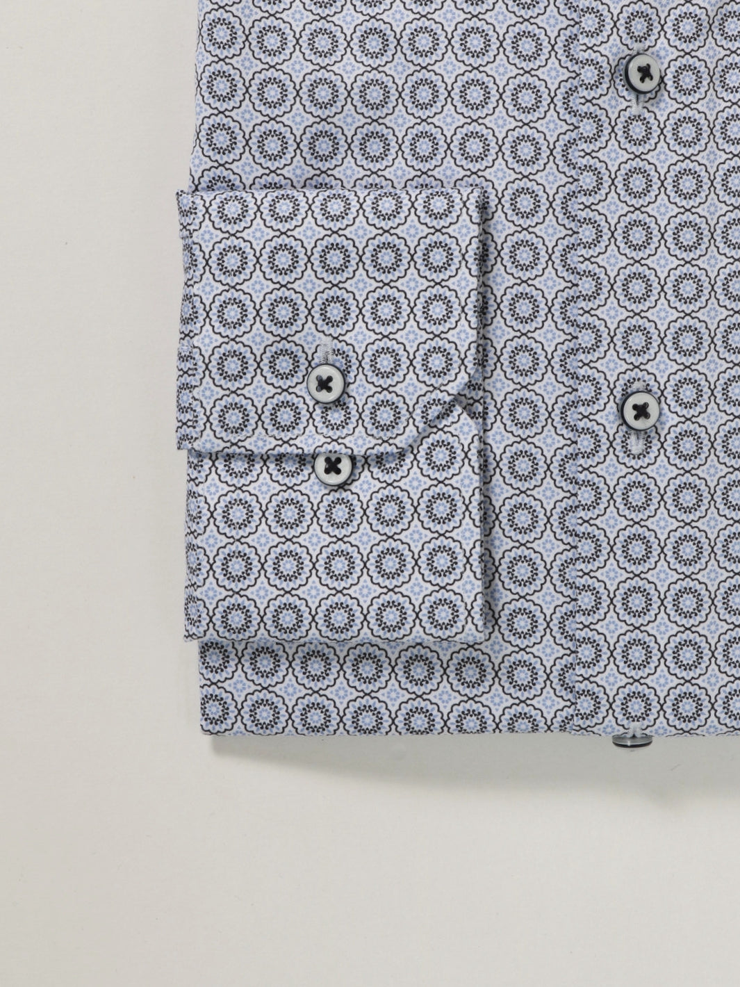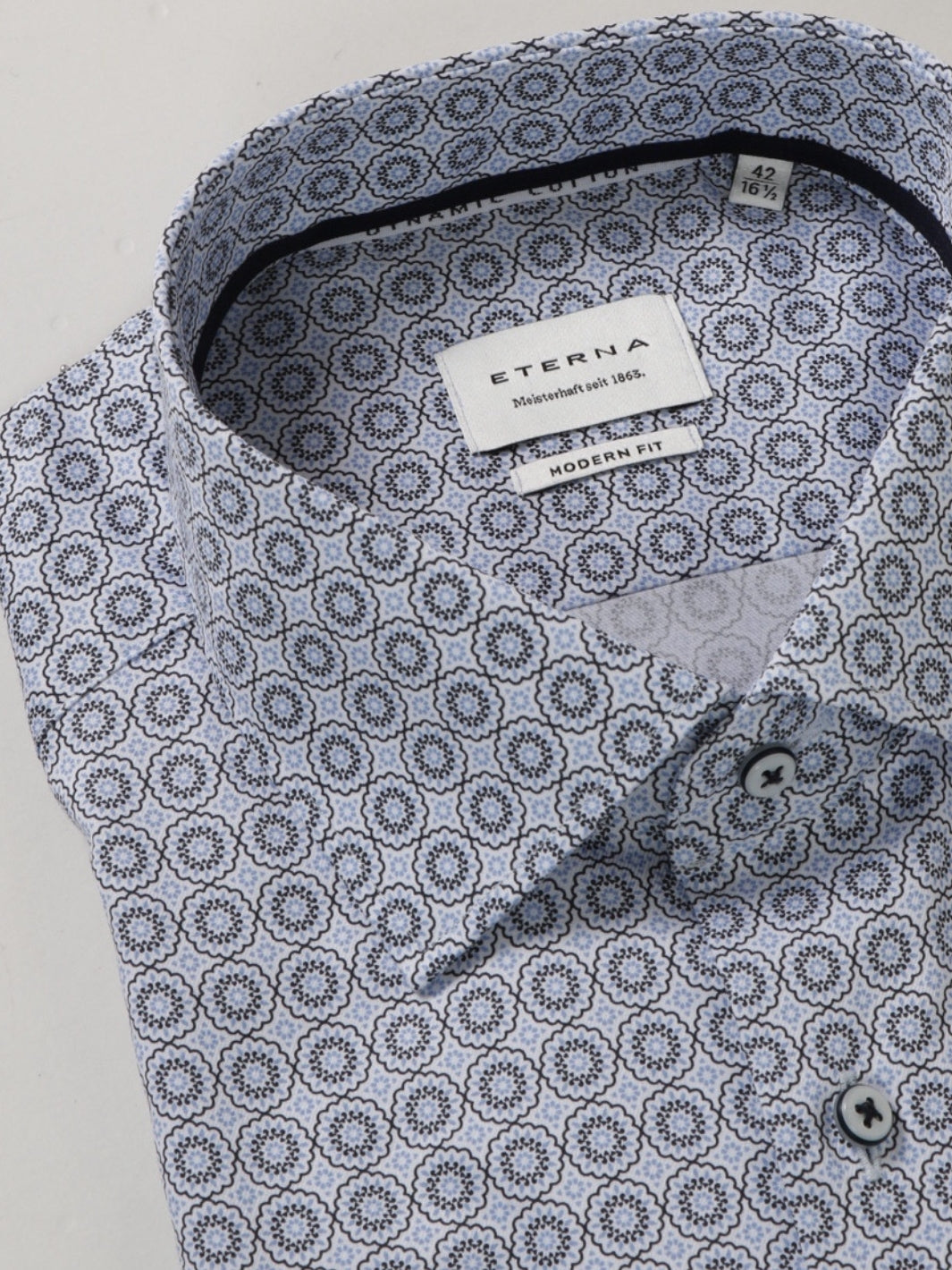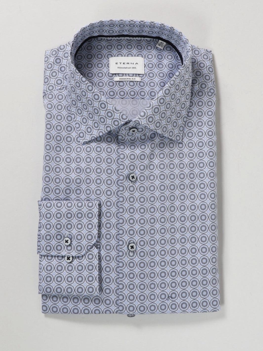 Modern-Fit Shirt fra Eterna. En blåmønstrete skjorte med enkle mansjetter og cut-away krage. Skjorten er strykelett.