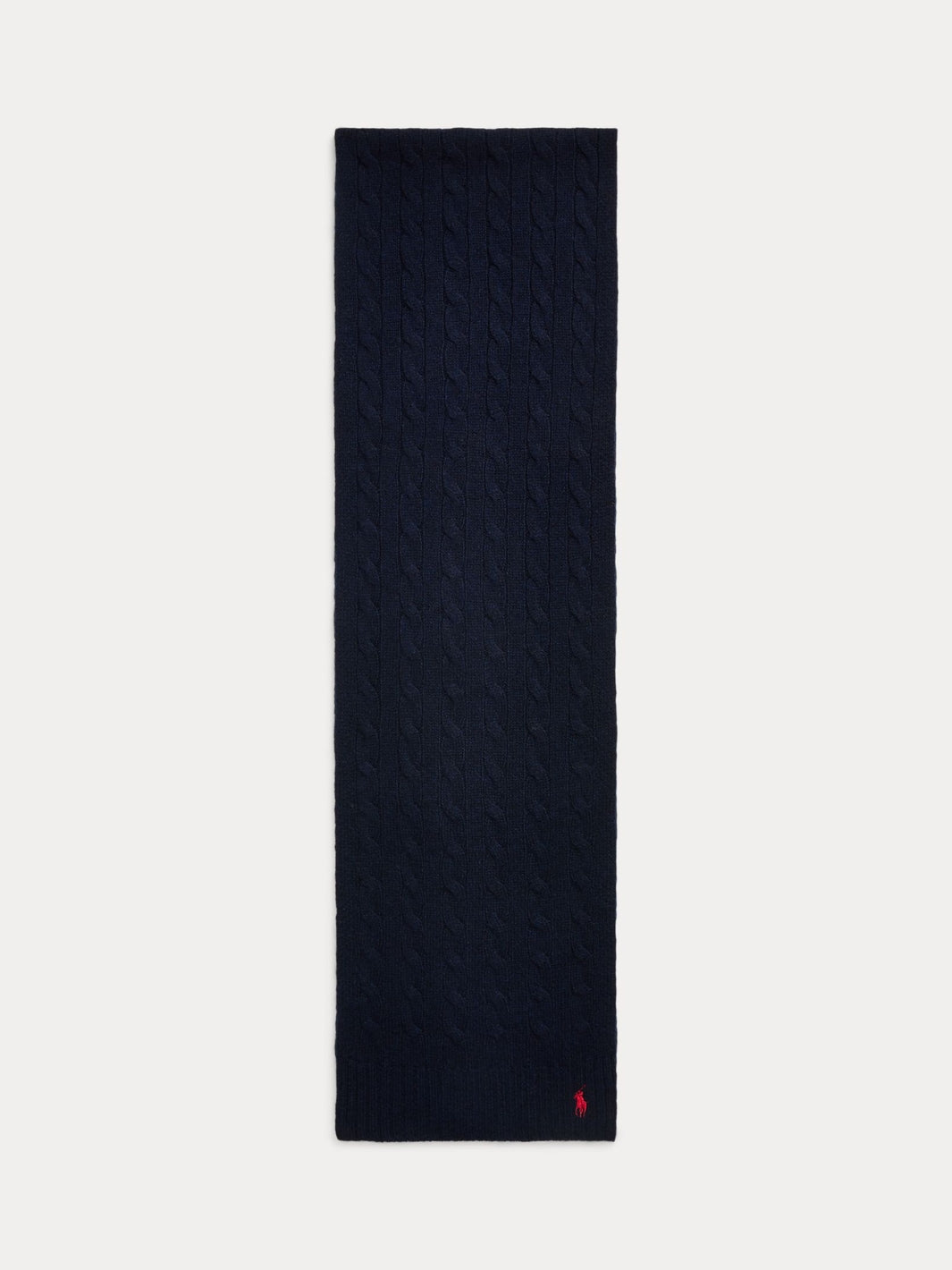 Cable-Knit Wool-Cashmere Scarf fra Polo Ralph Lauren. Et kabelstrikket skjerf i en luksuriøs blanding av ull og kashmir, her i marineblå.