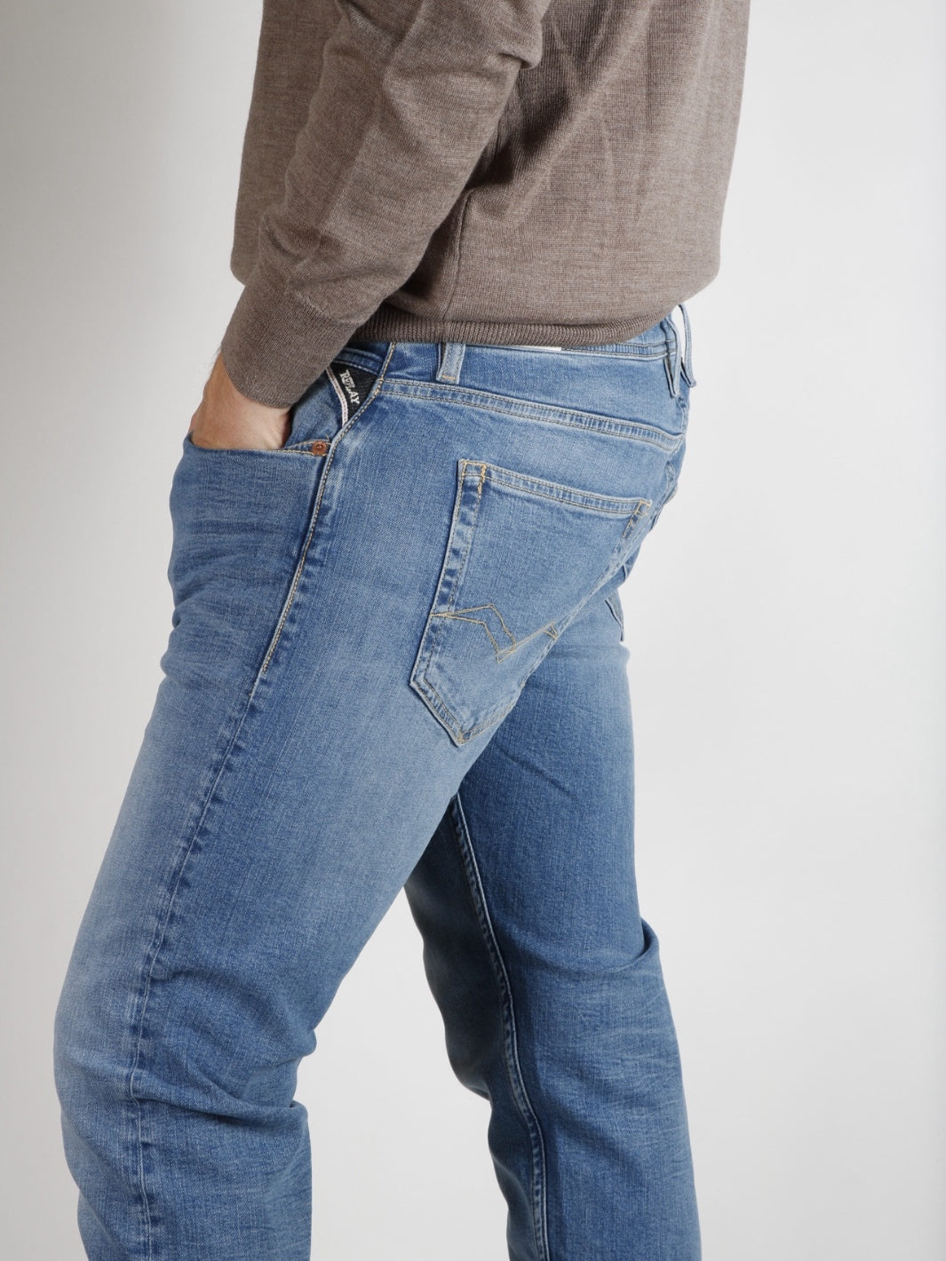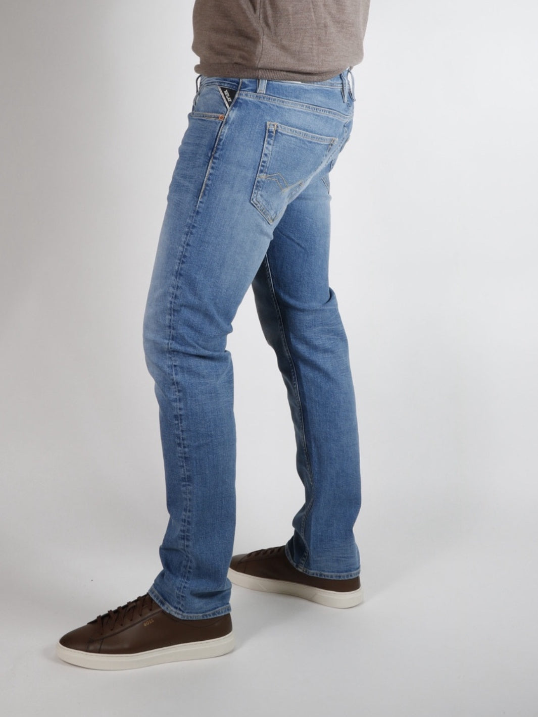 Grover Jeans fra Replay. Lys blå jeans med fem lommer, en rett passform og noe stretch.