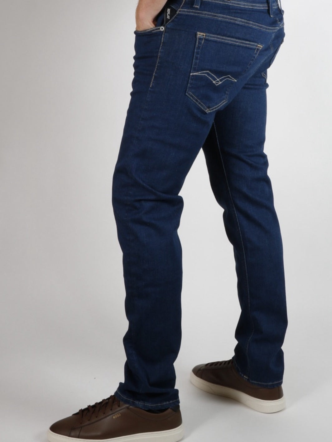 Grover Jeans fra Replay. Mørk blå femlommers jeans, med en rett passform og stretch.