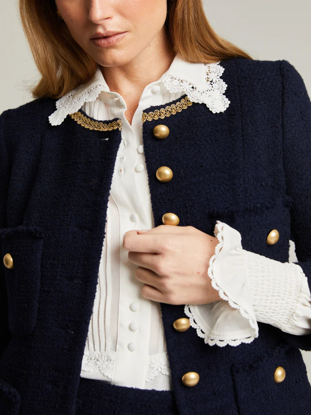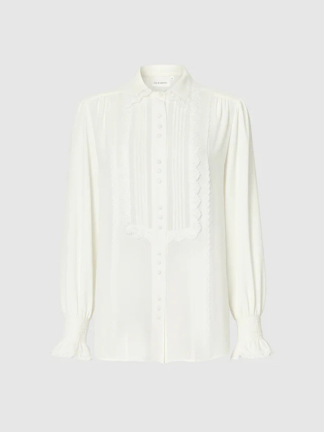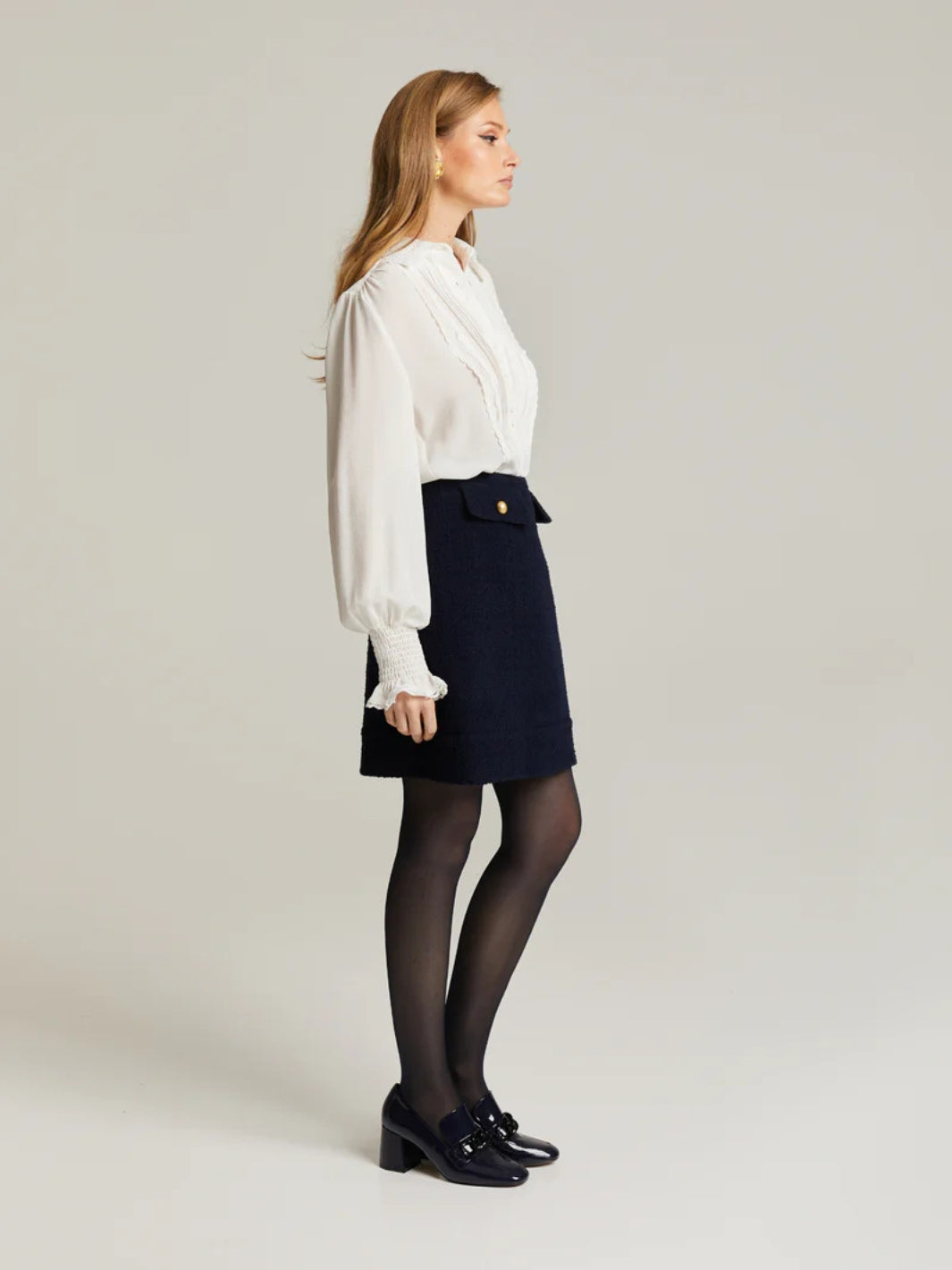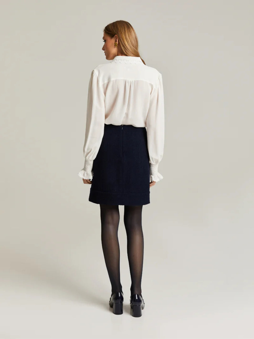 Avora Blouse fra Andiata. Bluse med dekorativ krage og blonder langs forstykket. Ermene har elastiske mansjetter med blondedetaljer. Kneppes i front med stofftrukne knapper.