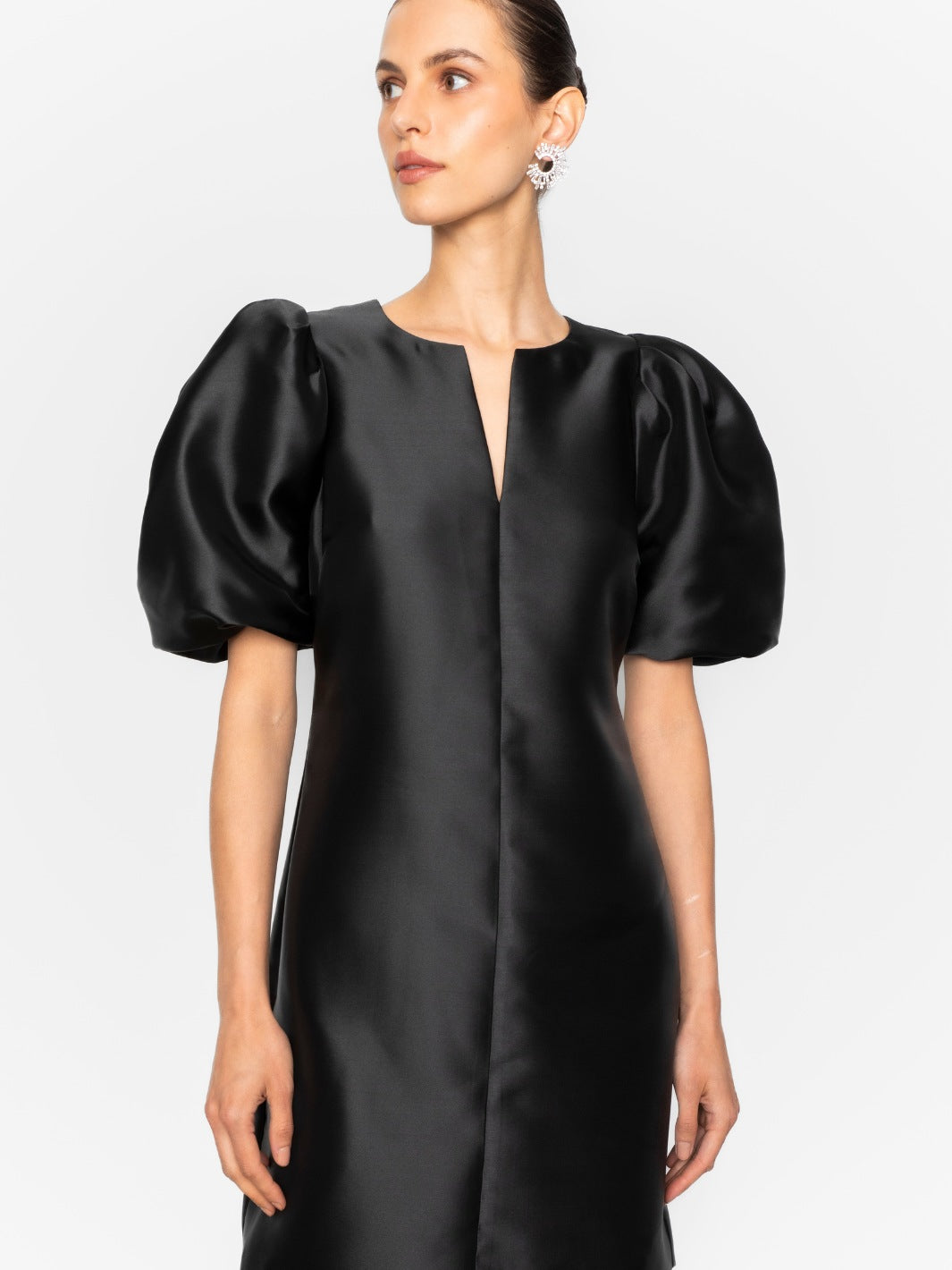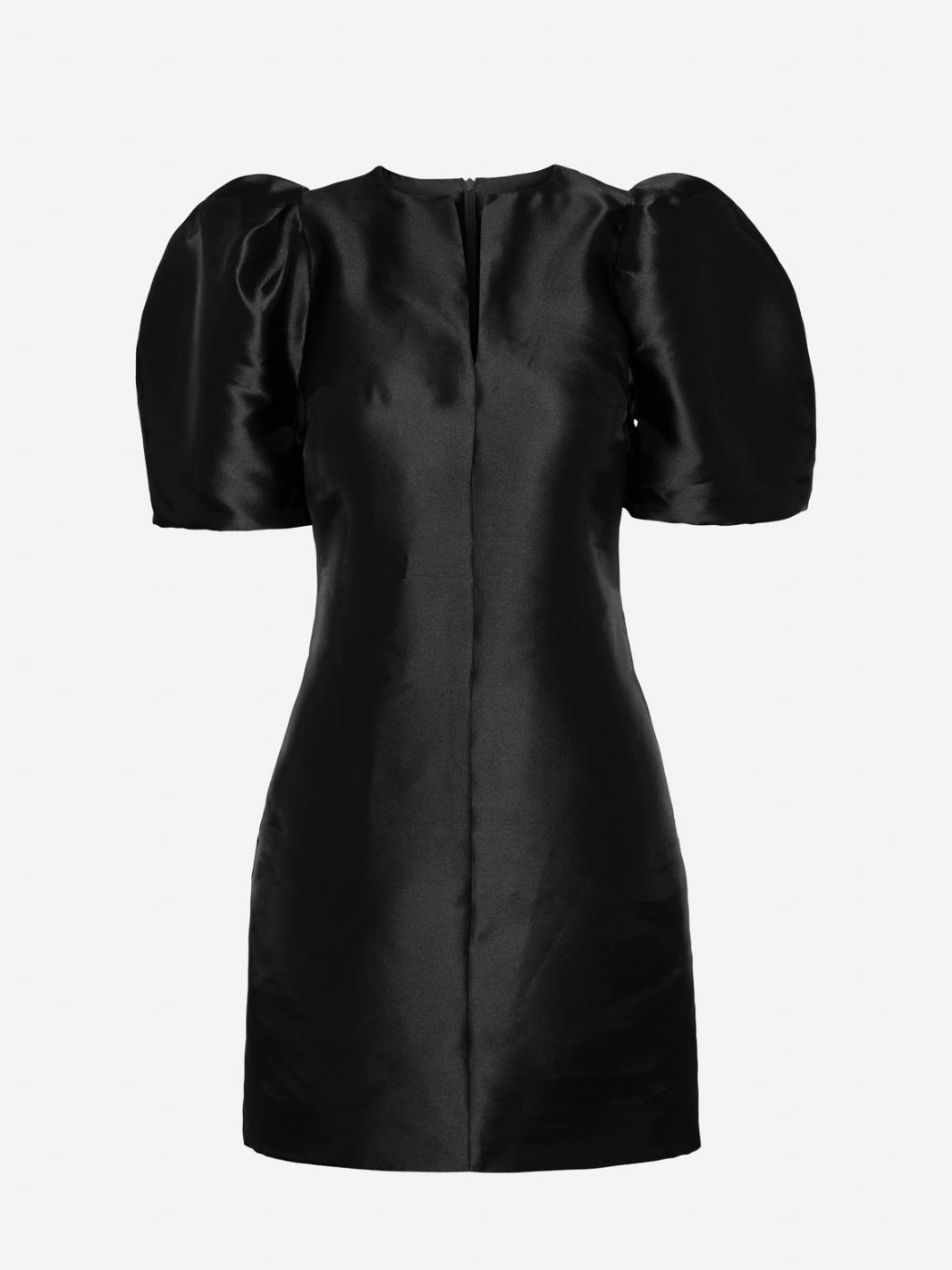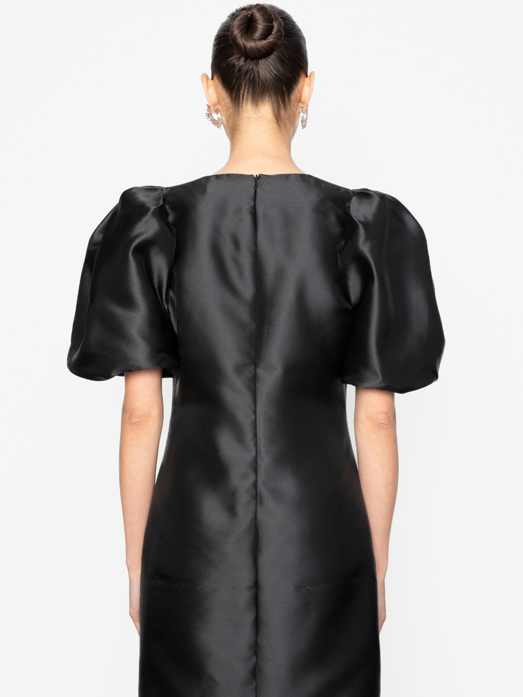 Rosie Dress fra Camilla Pihl. En sort festkjole, detaljert med en skarp v-hals og luftige korte ermer.