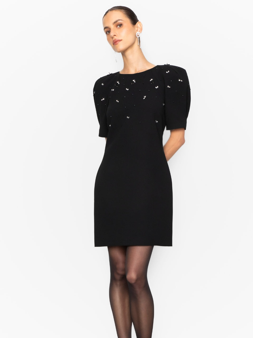 Tava Dress fra Camilla Pihl. En sort festkjole, detaljert med paljetter, korte ermer og innsvinget midje.