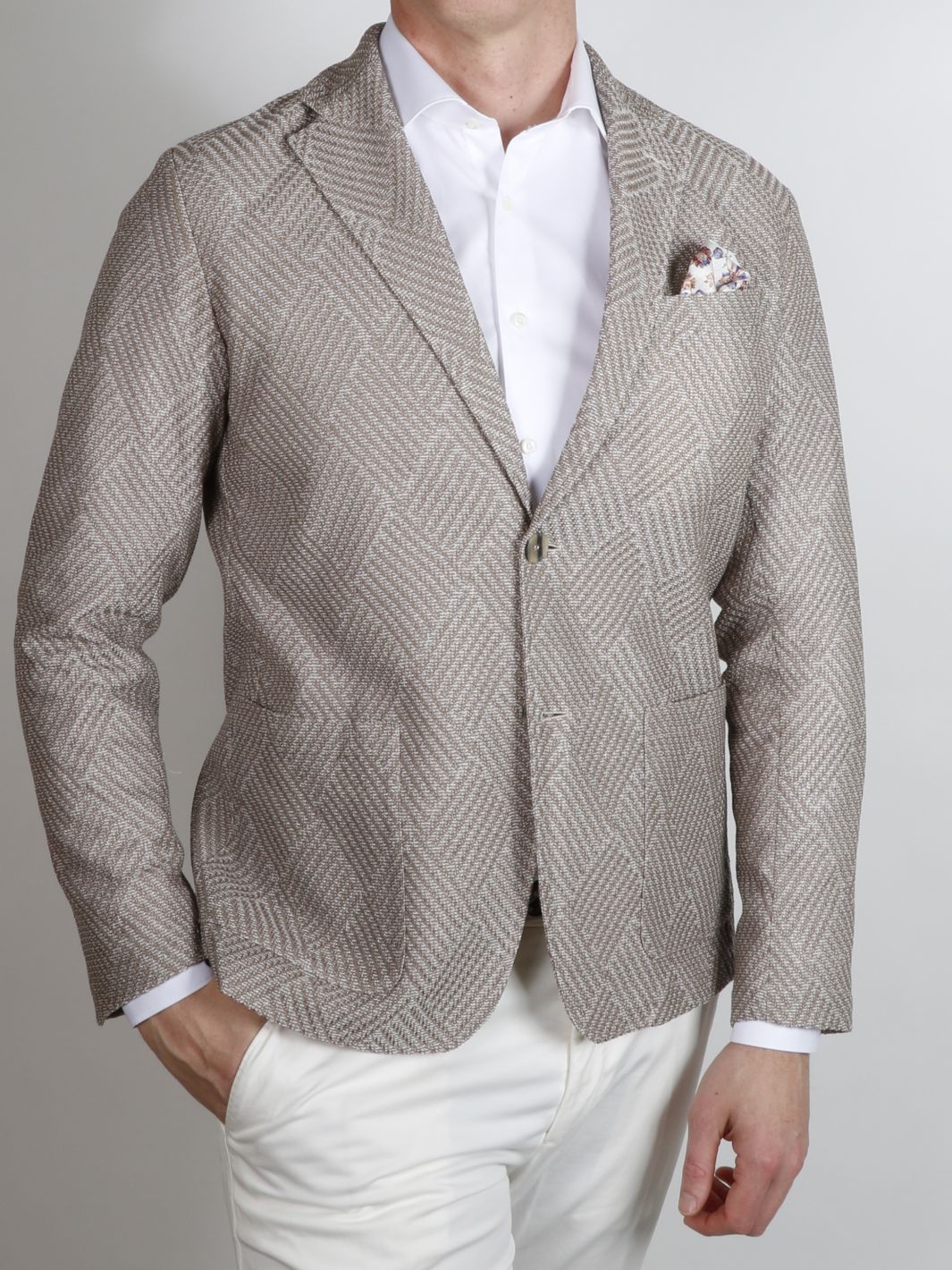 Aaron Jersey Blazer fra Altea. En lekker beige blazer med to lommer i front. Blazeren har stilig mønster og er halvfôret.