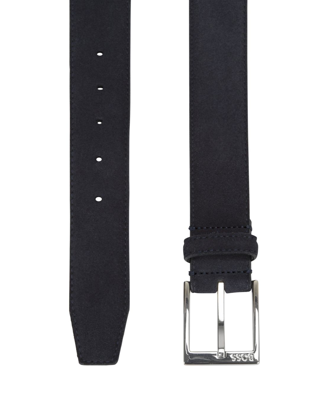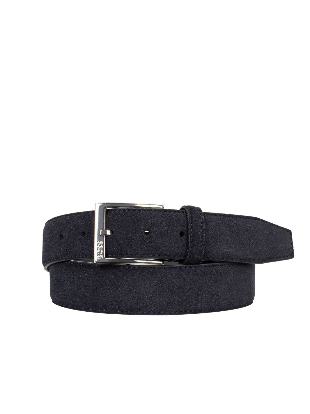 Elloy Belt fra BOSS. Et semsket belte i mørk blå, håndlaget av mykt skinn i Italia. Beltet har en sølvfarget beltespenne med inngravert "BOSS" Logo.