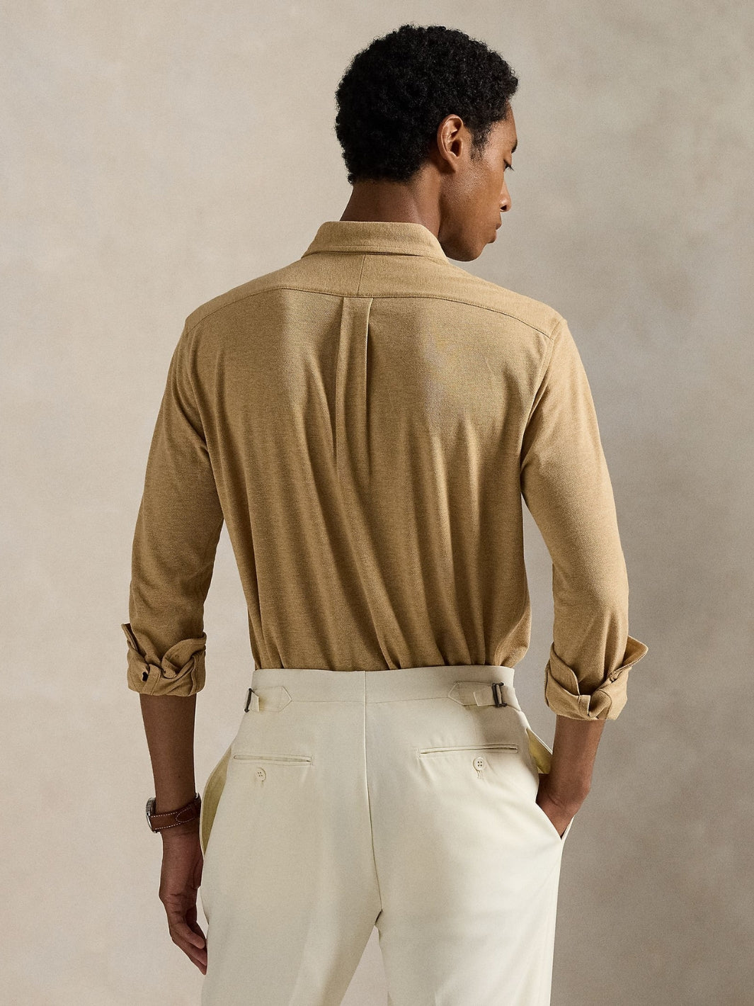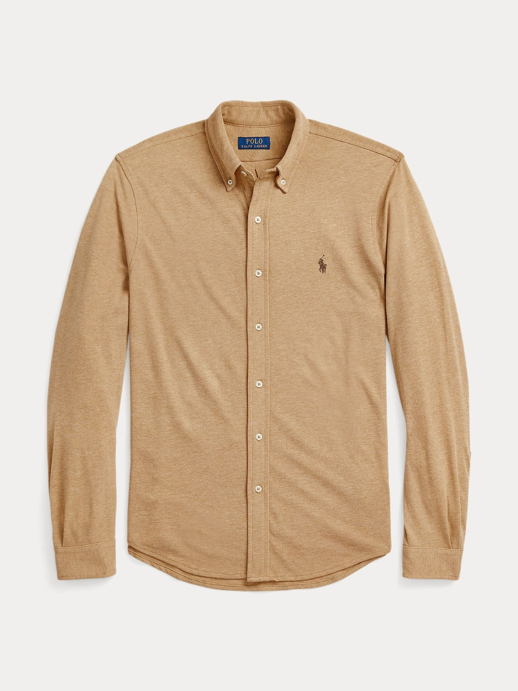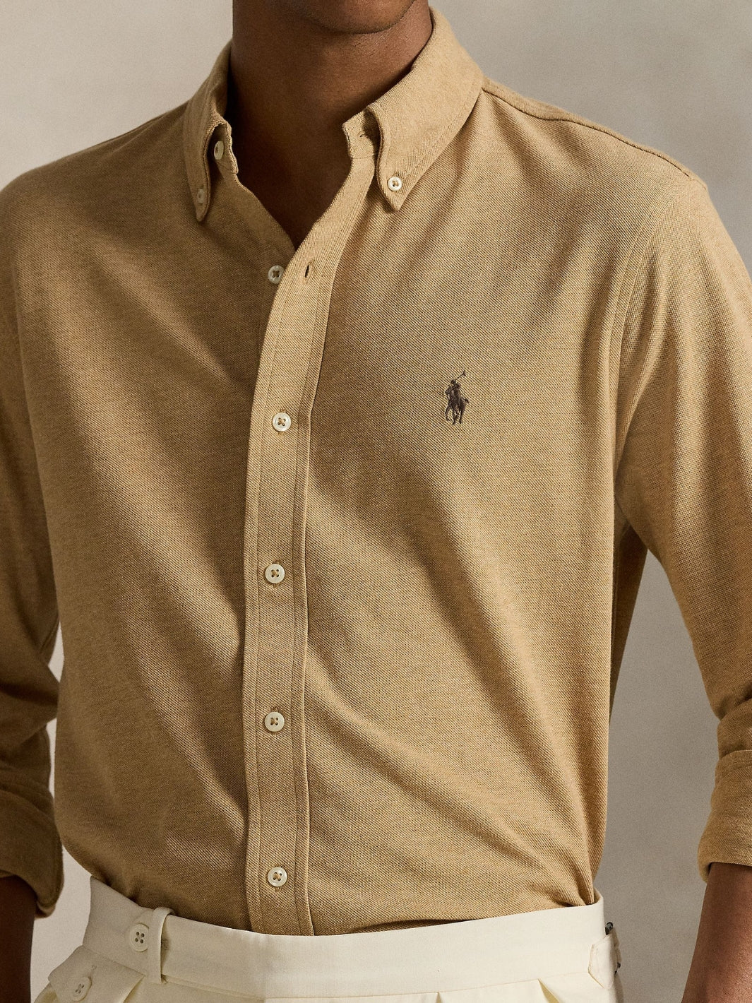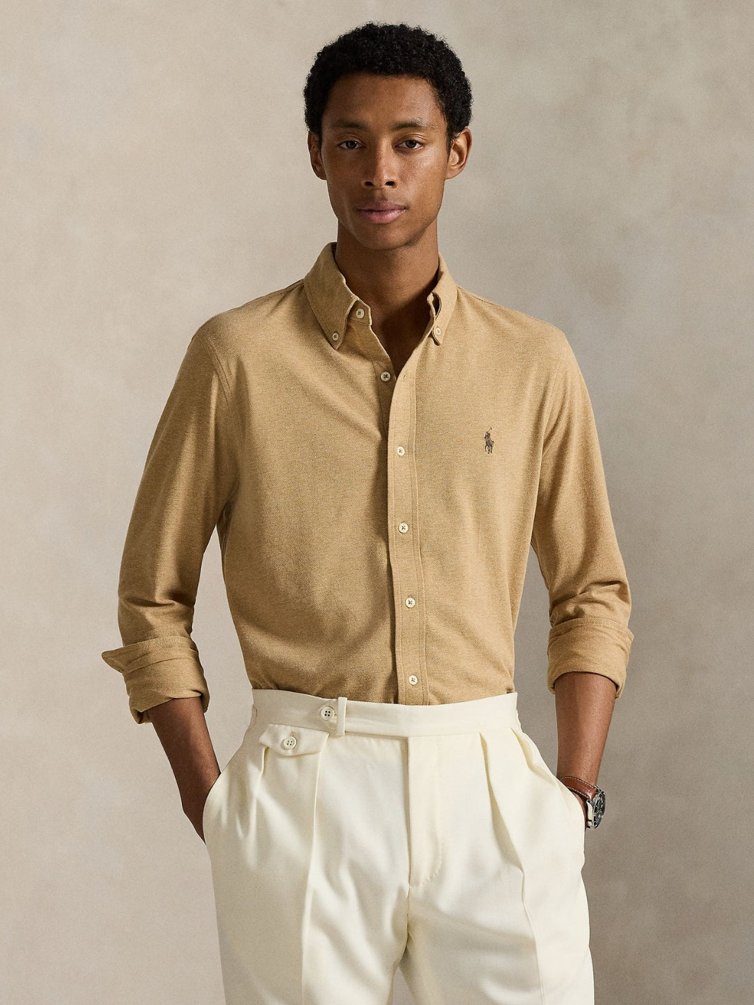 Featherweight Mesh Shirt fra Polo Ralph Lauren. En beige skjorte, inspirert av to populære plagg fra Polo Ralph Lauren - den klassiske Oxford-skjorten og den behagelige og lette Jersey T-skjorten.
