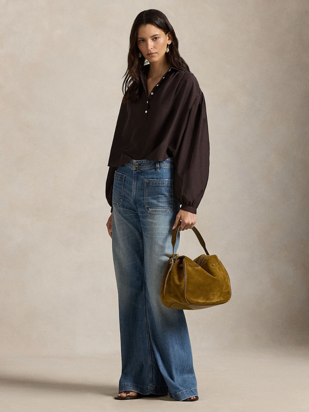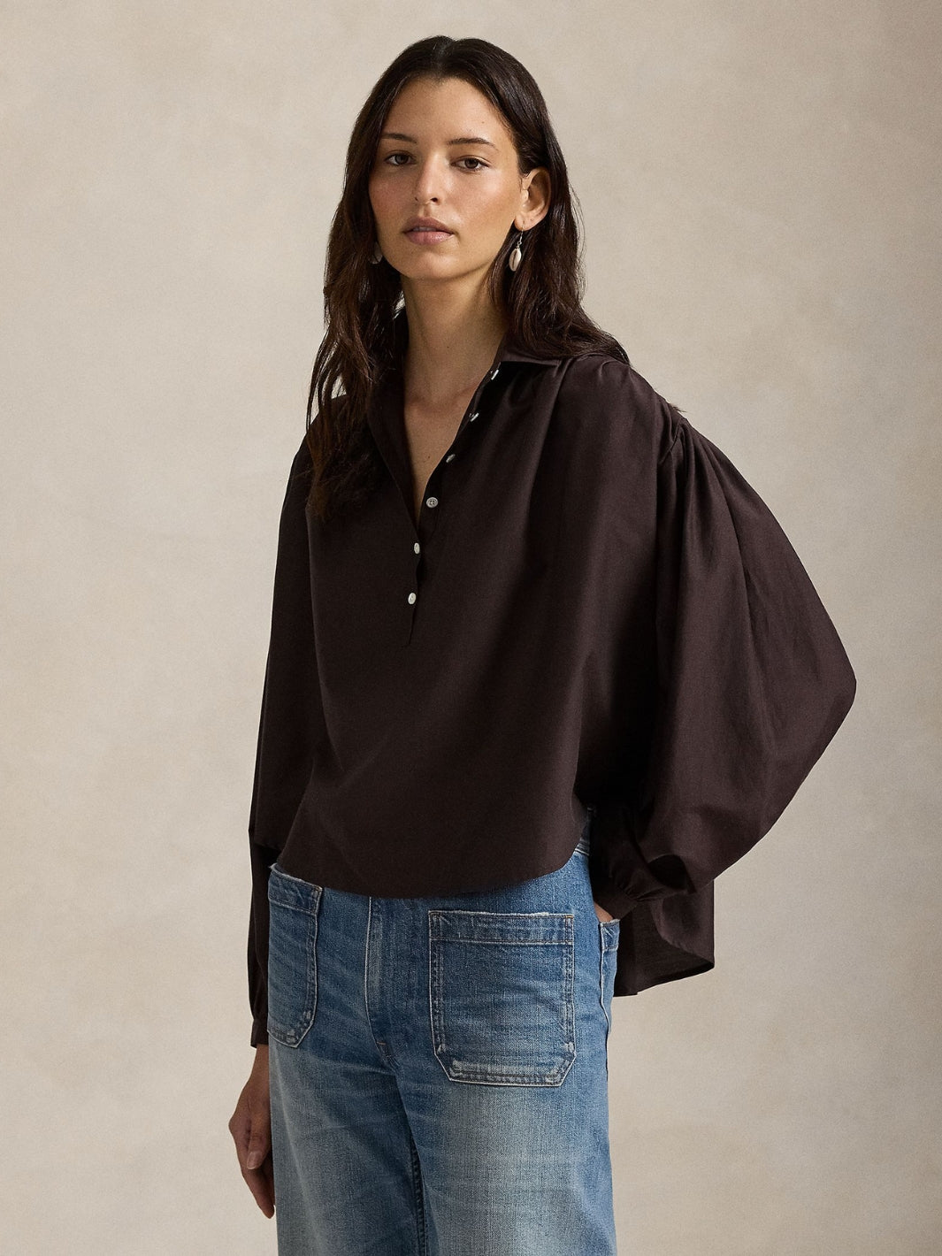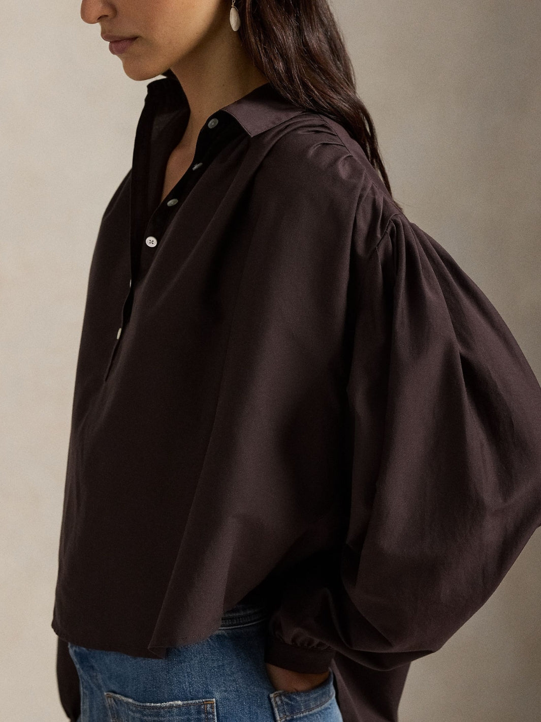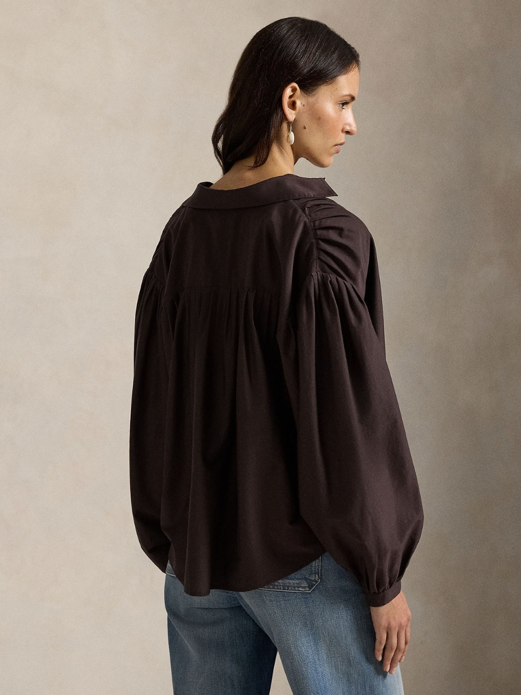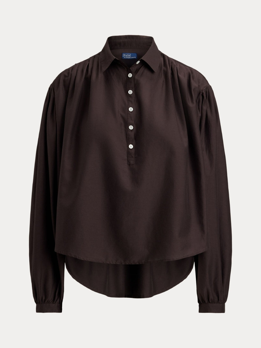 Pleated Cotton-Silk Blouse fra Polo Ralph Lauren. En brun bluse vevd i en blanding av bomull og morbærsilke. Blusen har klassisk spredt krage og en halv knappestolpe foran.
