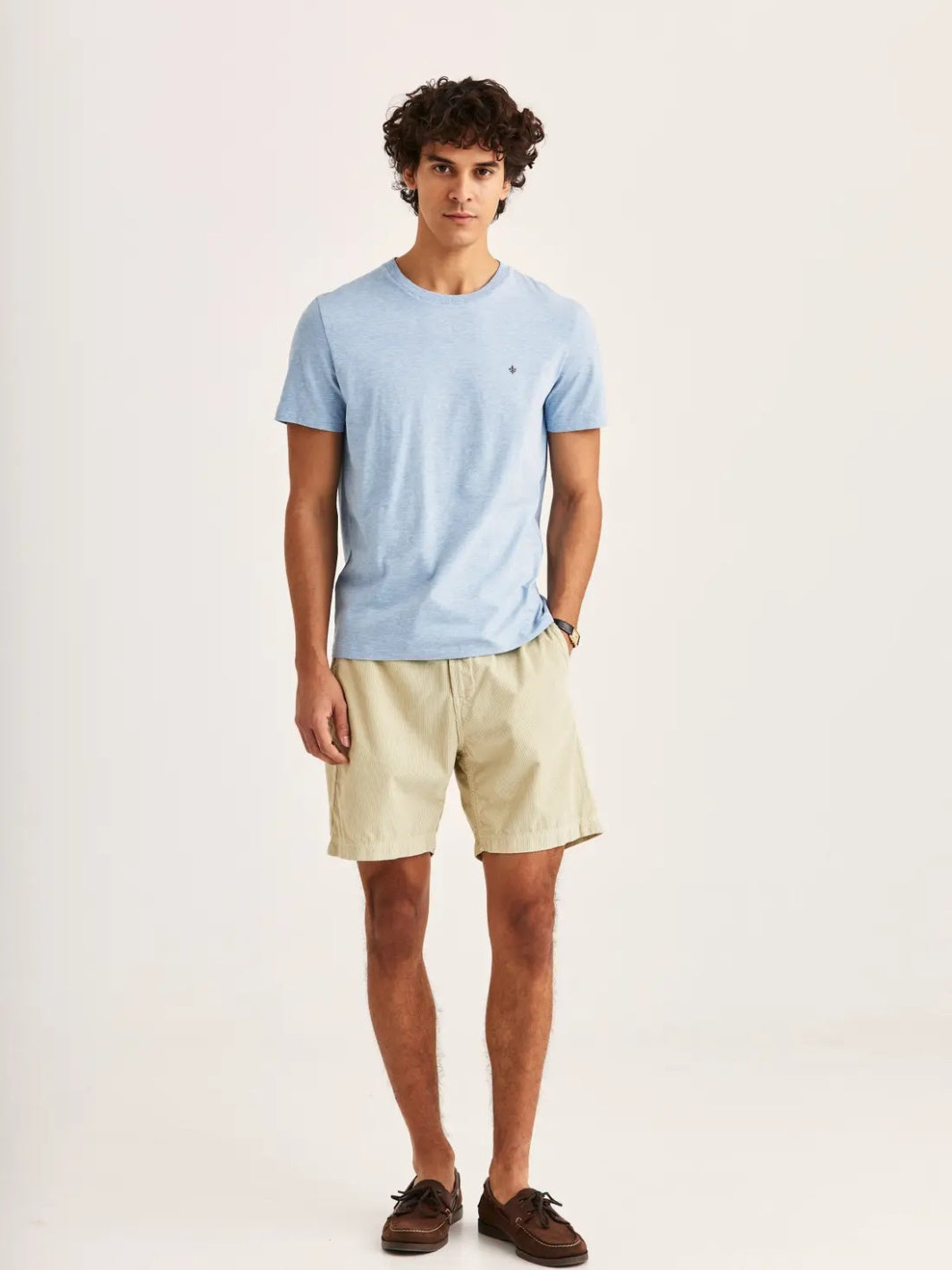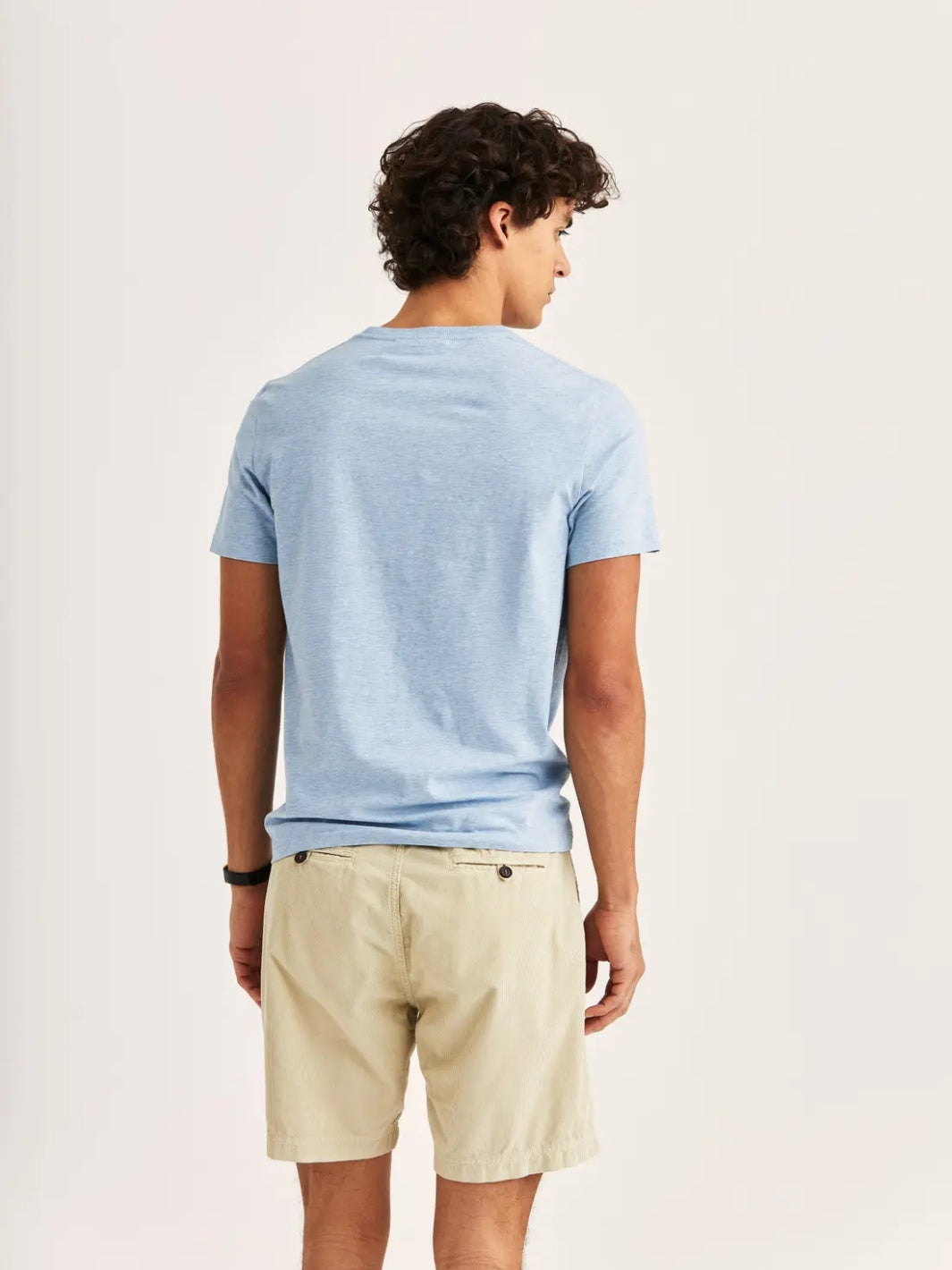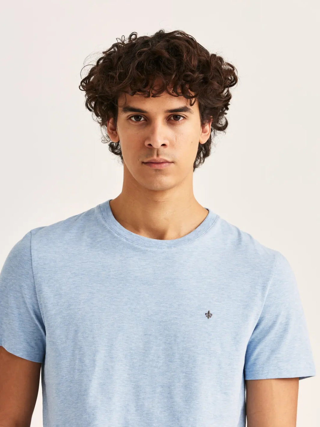 James Tee fra Morris. En lys blå t-skjorte laget i bomullsblanding med stretch. T-skjorten har rund hals og er detaljert med brodert Morris-lilje på brystet.